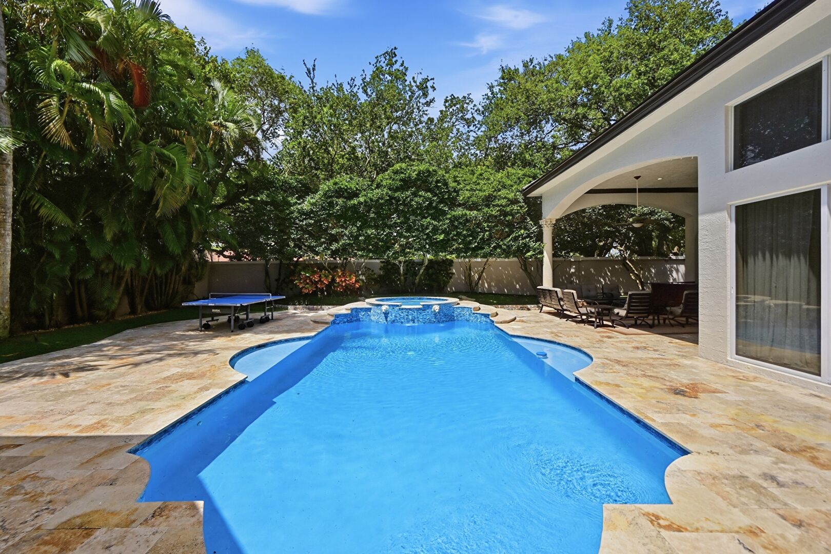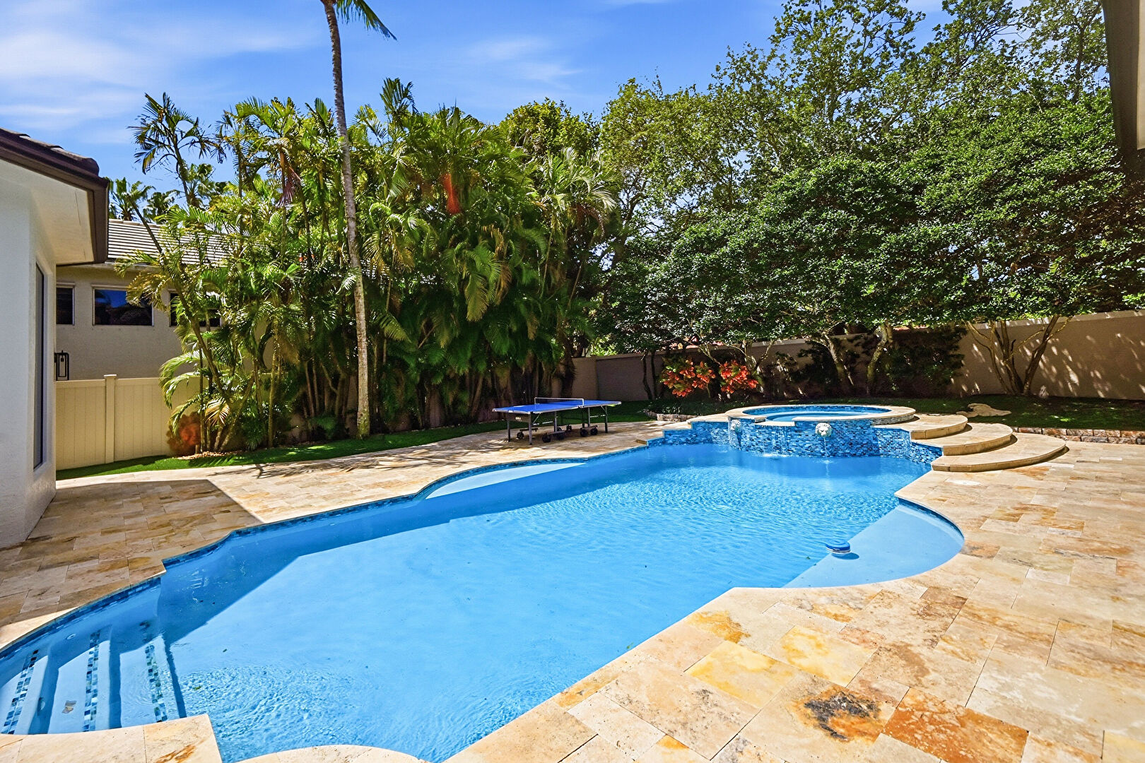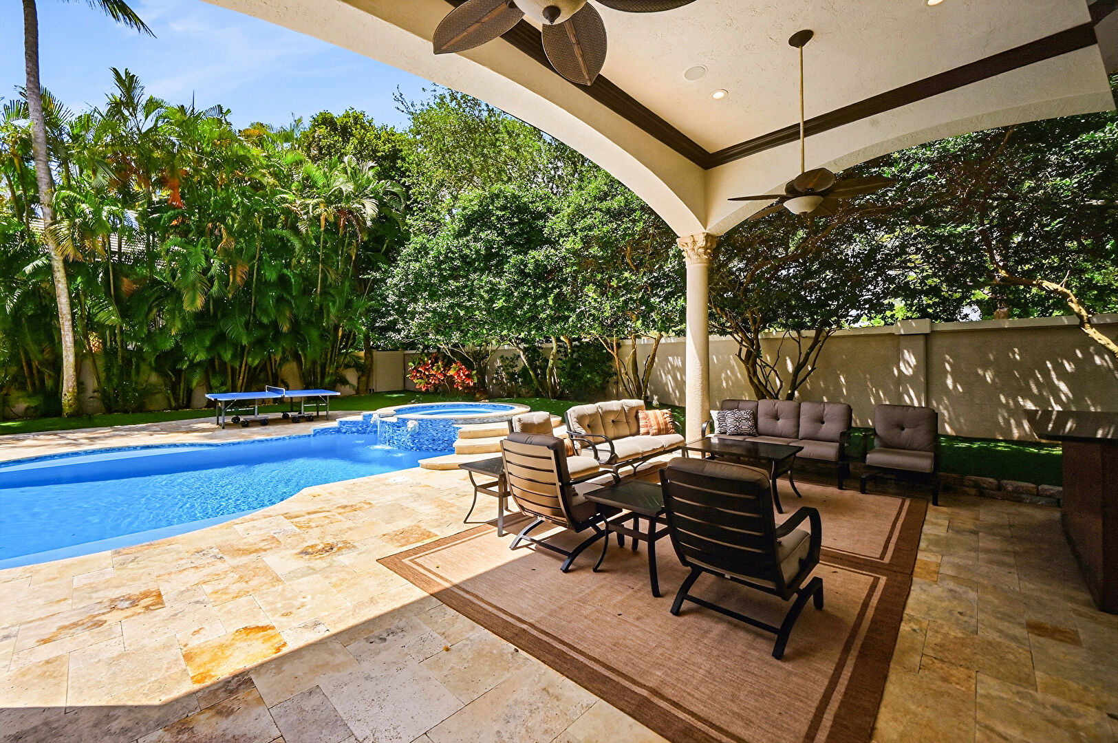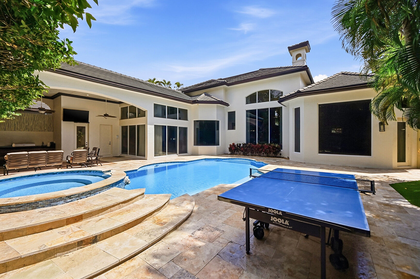 Ceiling Fan, Chimney, Fence, Hot Tub, Lawn, Outdoor Living Space, Patio, Pool, Pool Hot Tub Combo, Stucco Siding, Tile Roof, Fence, Lawn, Outdoor Living Space