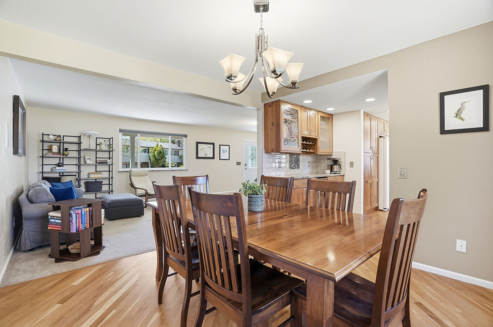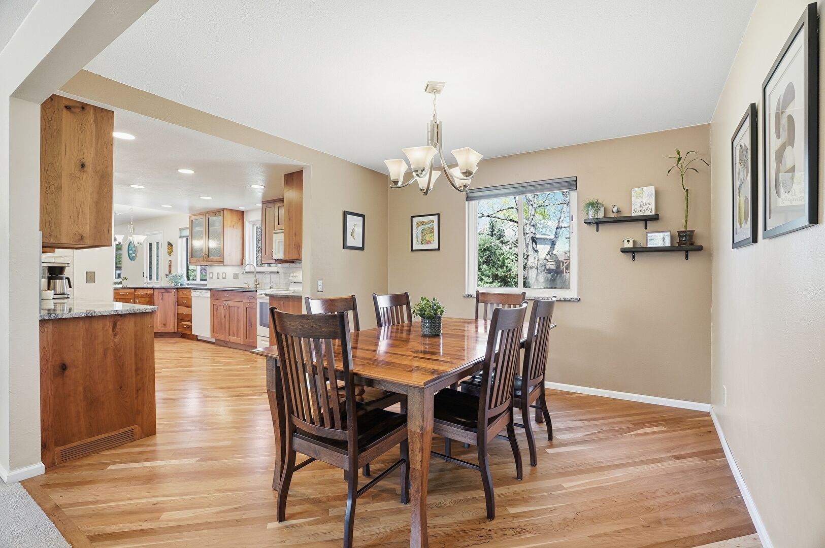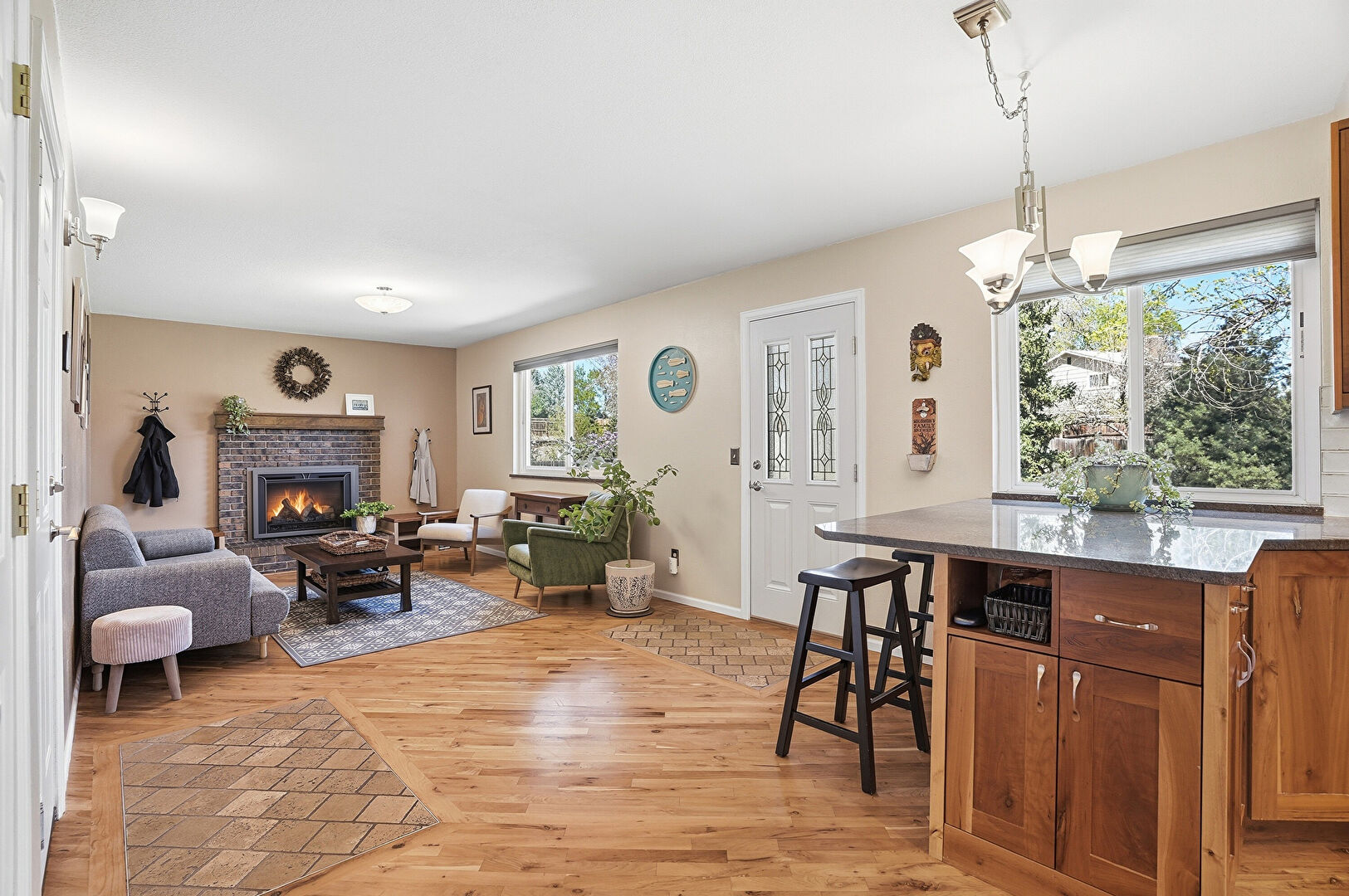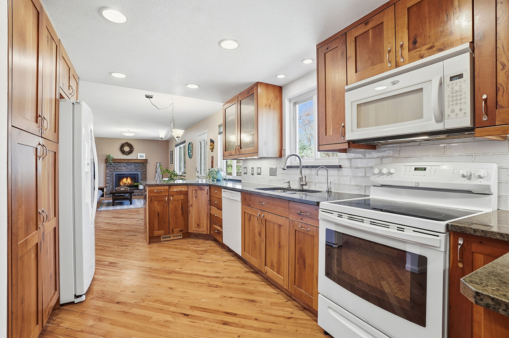Baseboards Wall, Drywall, Fireplace, Natural Light, Notable Chandelier, Recessed Lighting, U Shaped Kitchen, Vent, Wood Finish Floor, Baseboards Wall, Drywall, Natural Light, Wood Finish Floor