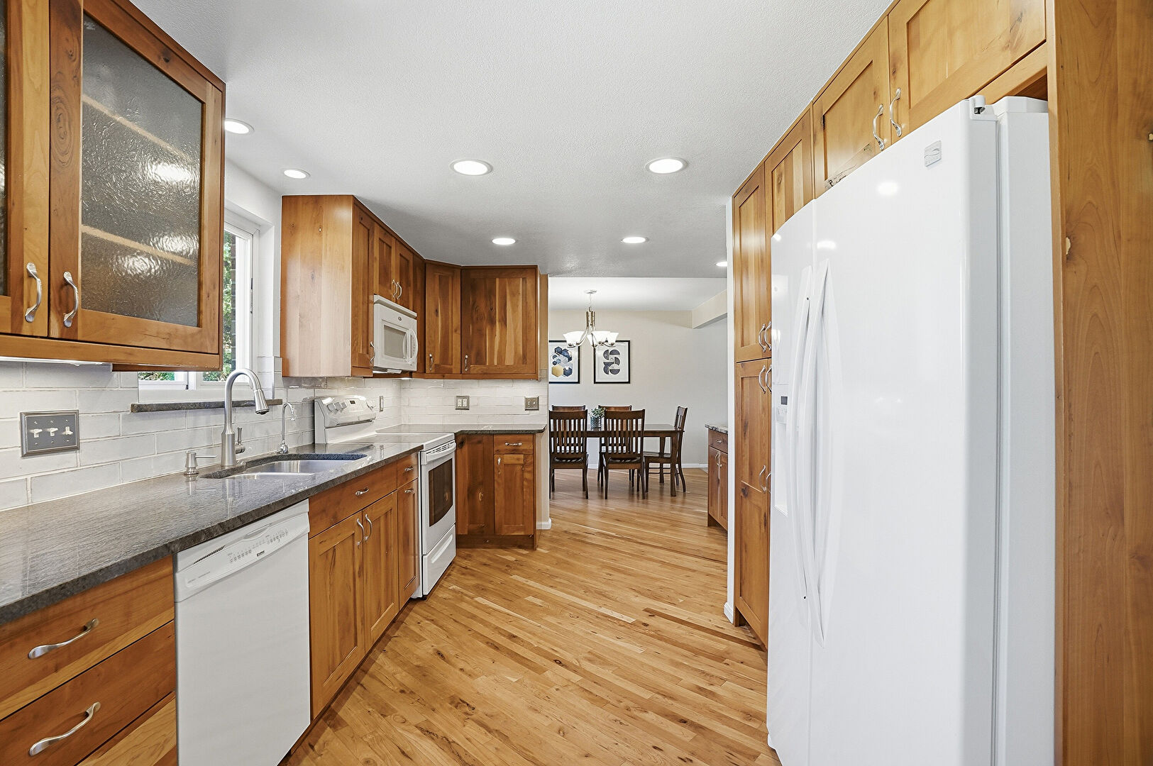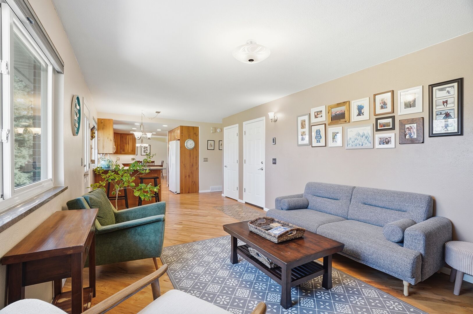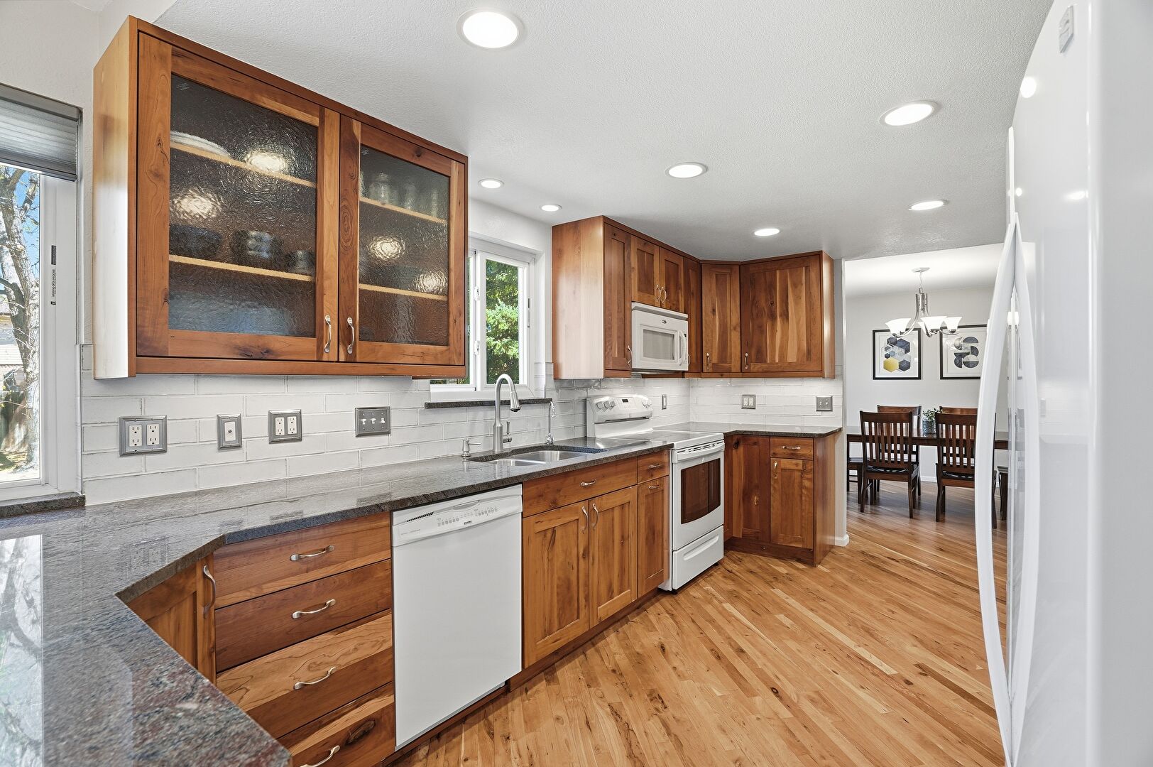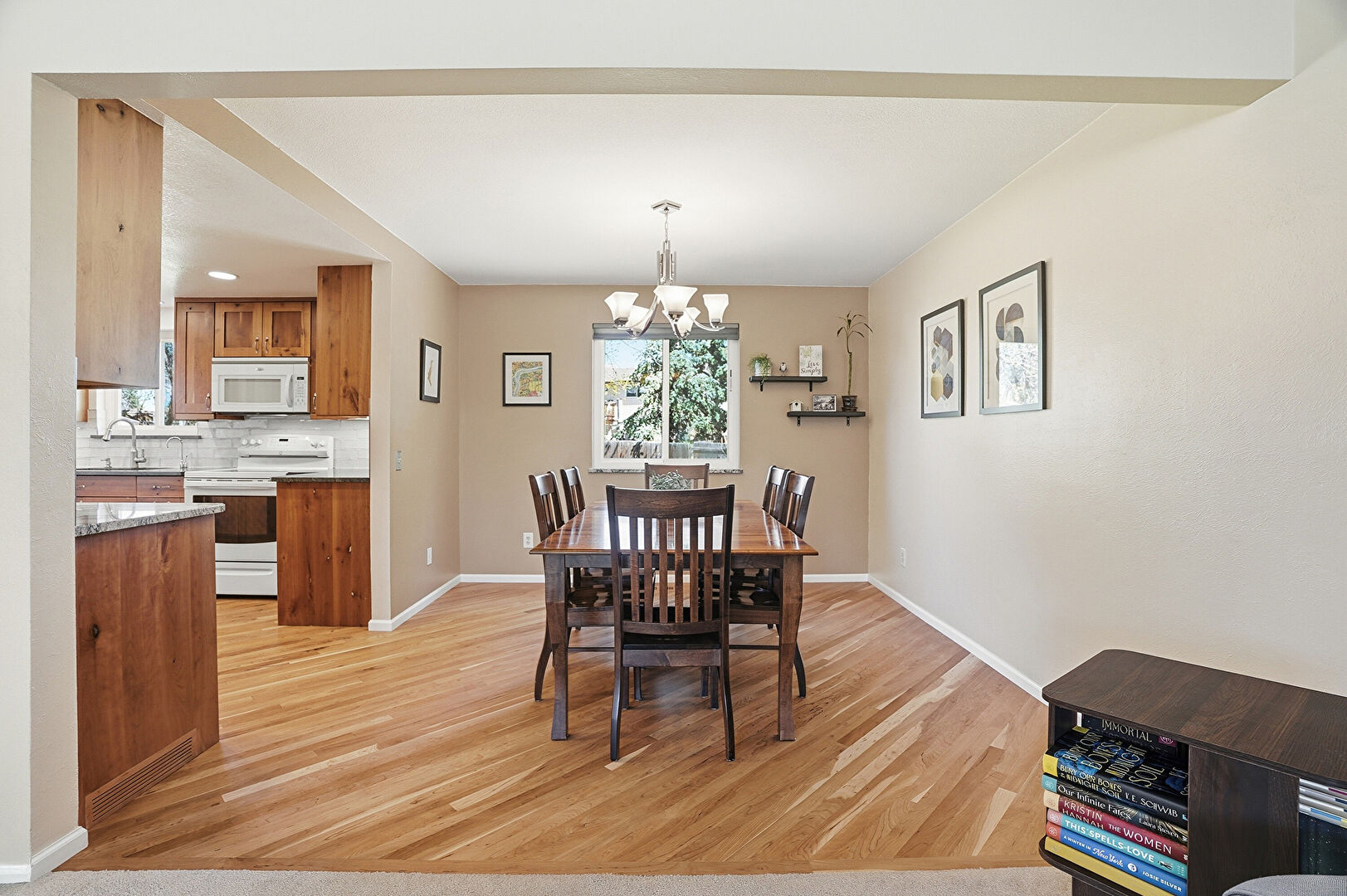 Baseboards Wall, Drywall, Fireplace, Natural Light, Notable Chandelier, Recessed Lighting, U Shaped Kitchen, Vent, Wood Finish Floor, Baseboards Wall, Drywall, Natural Light, Wood Finish Floor