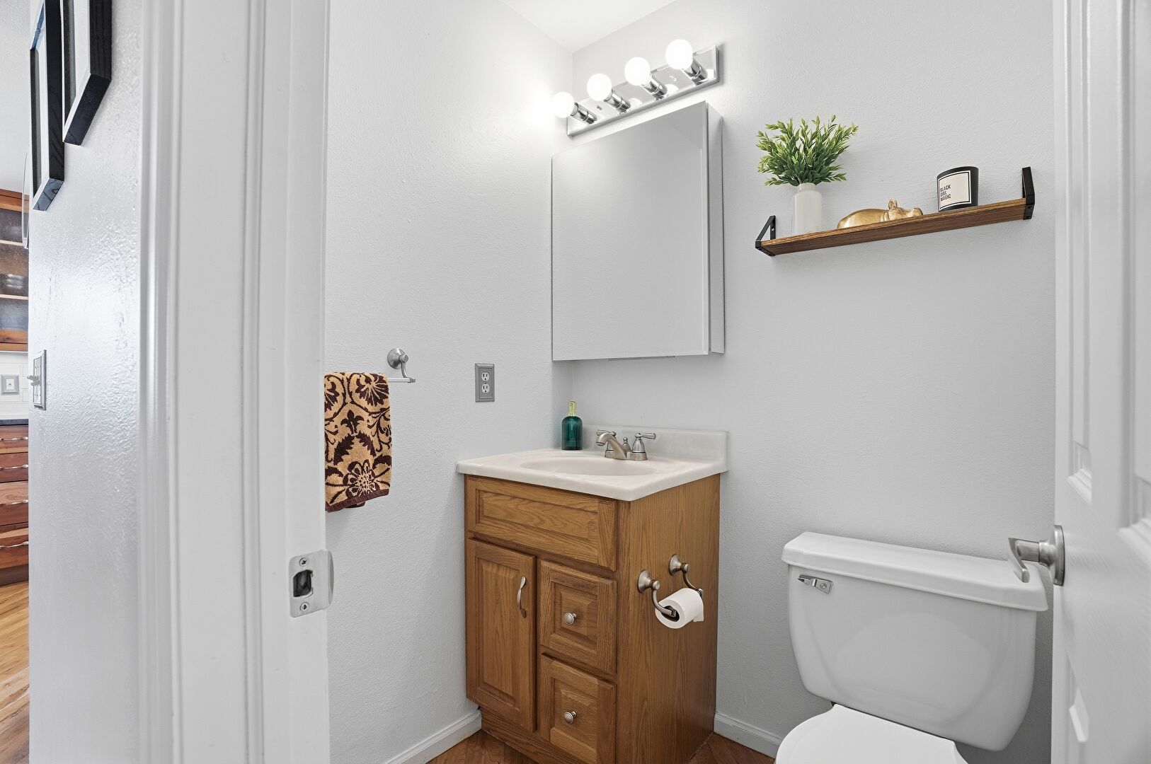 Baseboards Wall, Drywall, Full Bathroom, Half Bathroom, Tile Floor, Vanity, Combined Bath Shower, Wood Finish Floor
