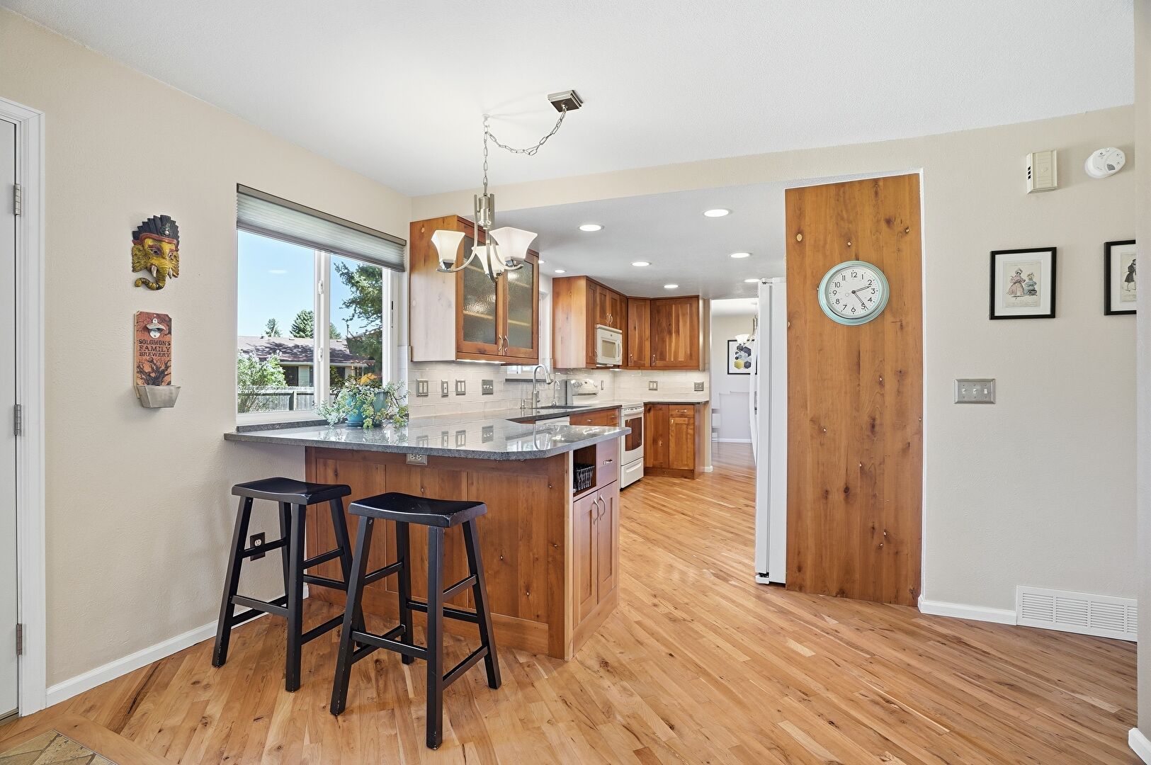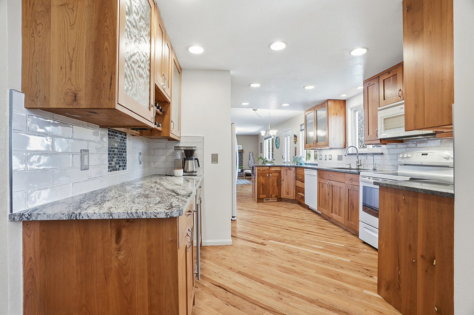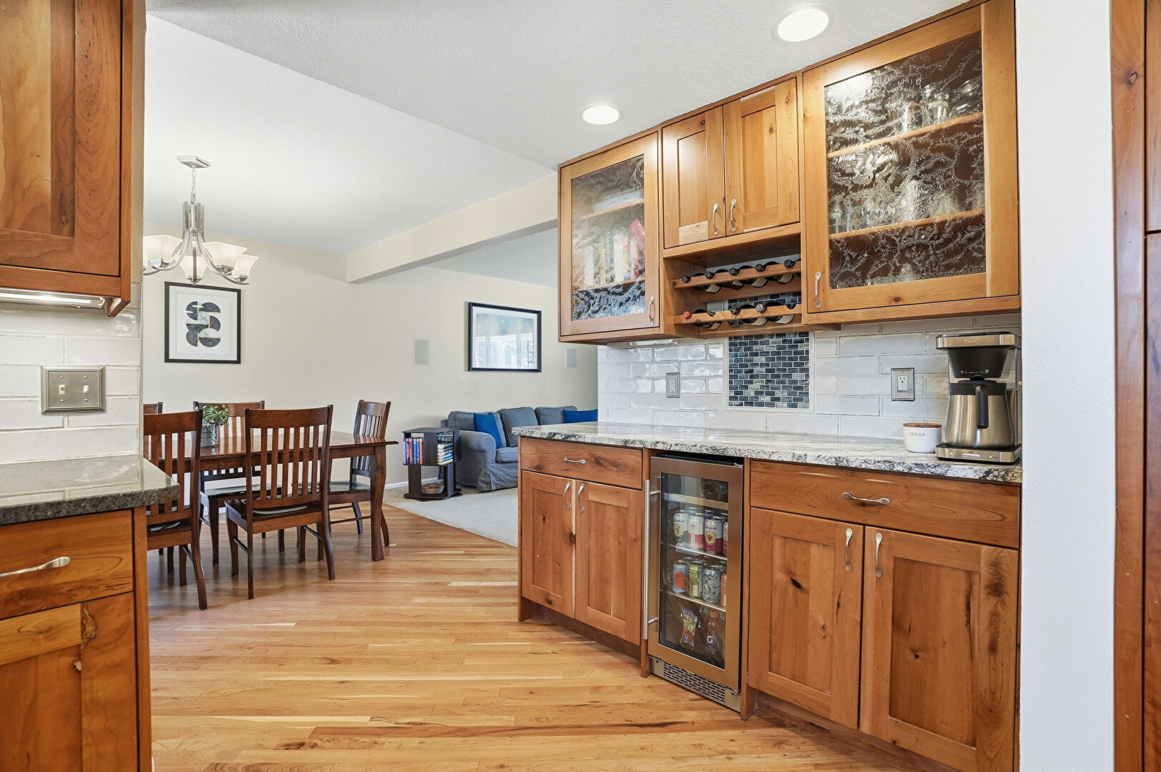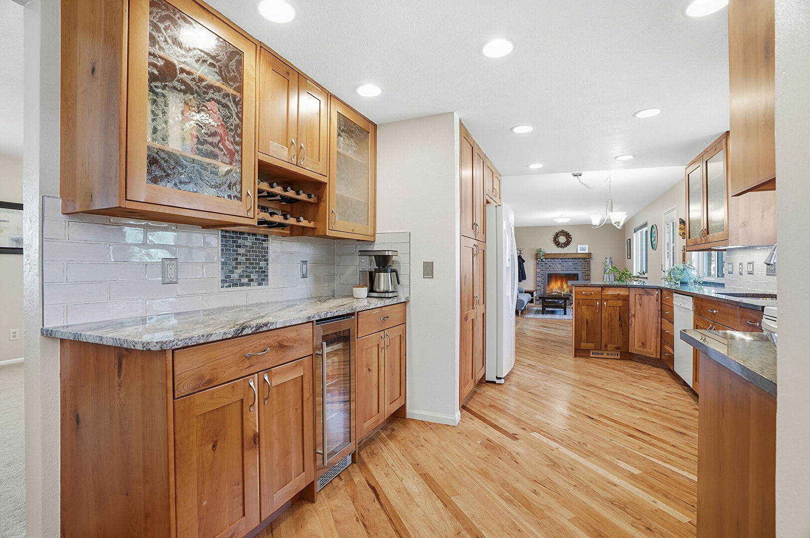 Baseboards Wall, Drywall, Fireplace, G Shaped Kitchen, Glass Insert Cabinets, Indoor Bar, Kitchen Bar, Kitchen Peninsula, Medium Brown Cabinets, Natural Light, Notable Chandelier, Open Shelves, Opens To Living Area, Pendant Lighting, Recessed Lighting, Shaker Cabinets, Smoke Carbon Monoxide Detector, Stone Countertops, Vent, Wine Cooler, Wood Finish Floor, Drywall, Medium Brown Cabinets, Natural Light, Notable Chandelier, Pendant Lighting