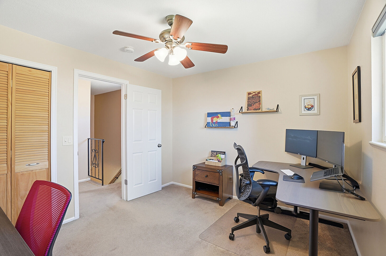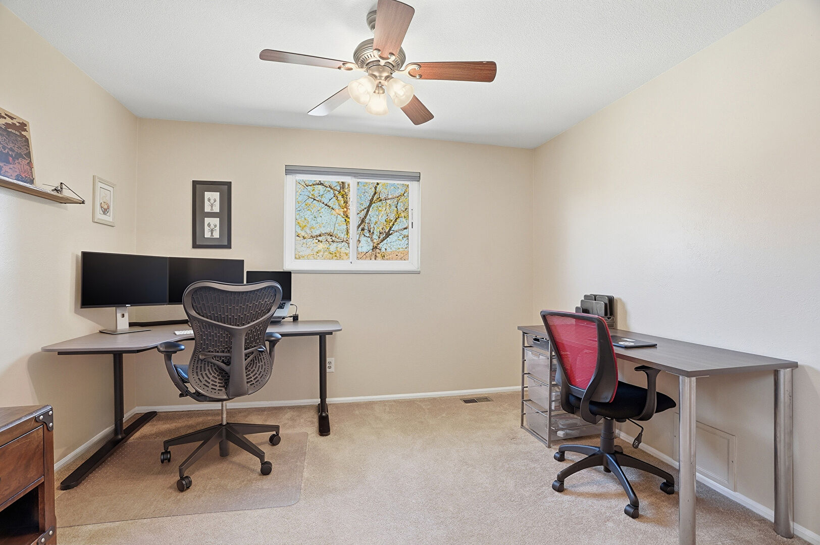 Baseboards Wall, Carpet, Ceiling Fan, Drywall, Natural Light, Office Area, Vent, Ceiling Fan, Smoke Carbon Monoxide Detector