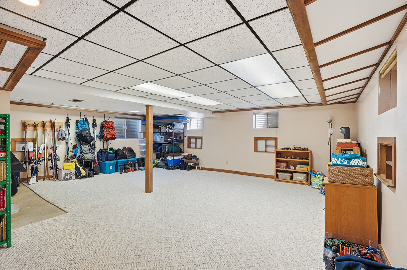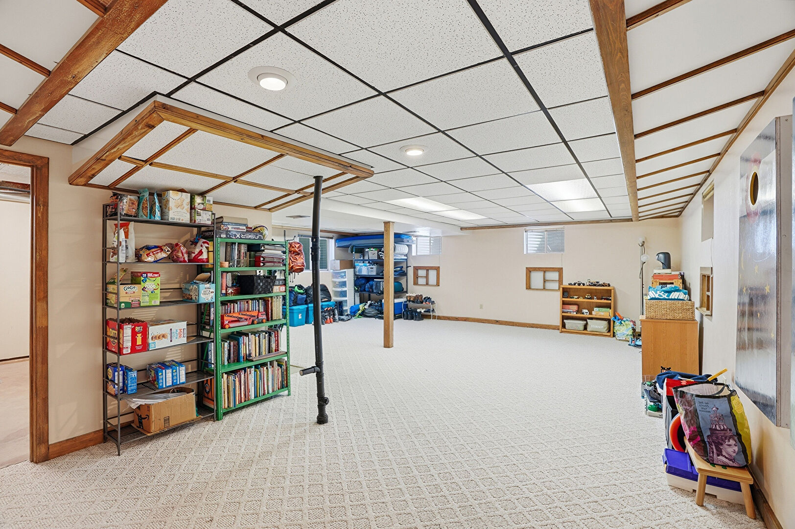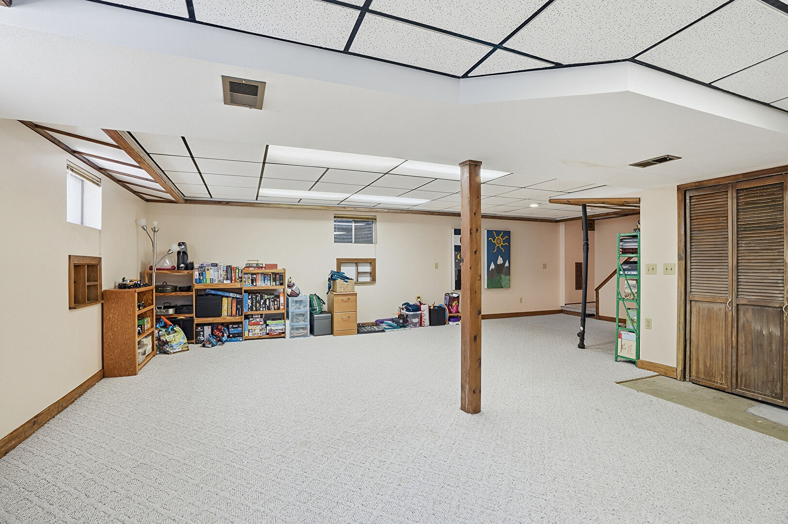 Baseboards Wall, Basement, Carpet, Drop Ceiling, Drywall, Natural Light, Recessed Lighting, Stairs, Vent, Carpet, Drop Ceiling, Vent