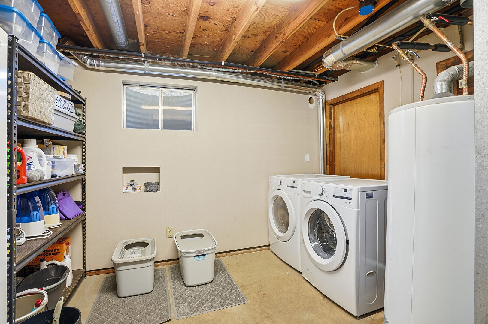 Basement, Concrete Floor, Drywall, Water Heater, Laundry