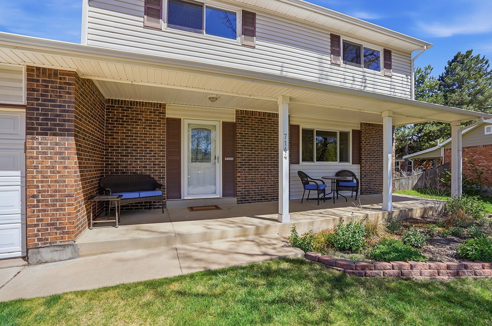 Brick Siding, Downspout, Fence, Gutters, Horizontal Siding, Lawn, Porch, Residential View, Concrete Foundation, Porch