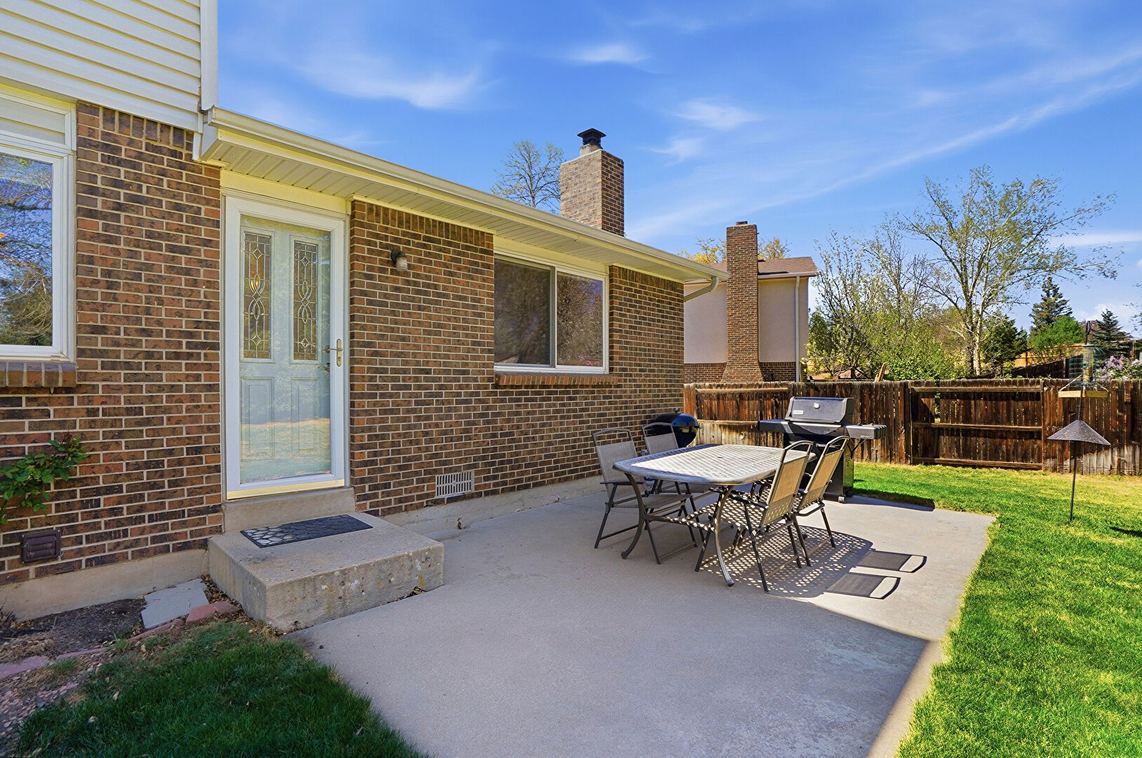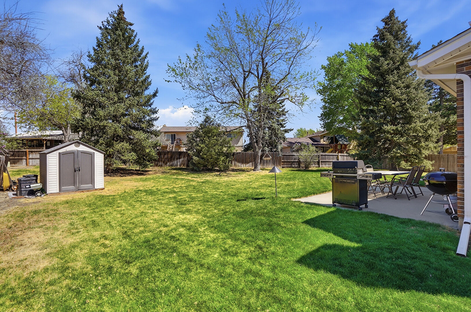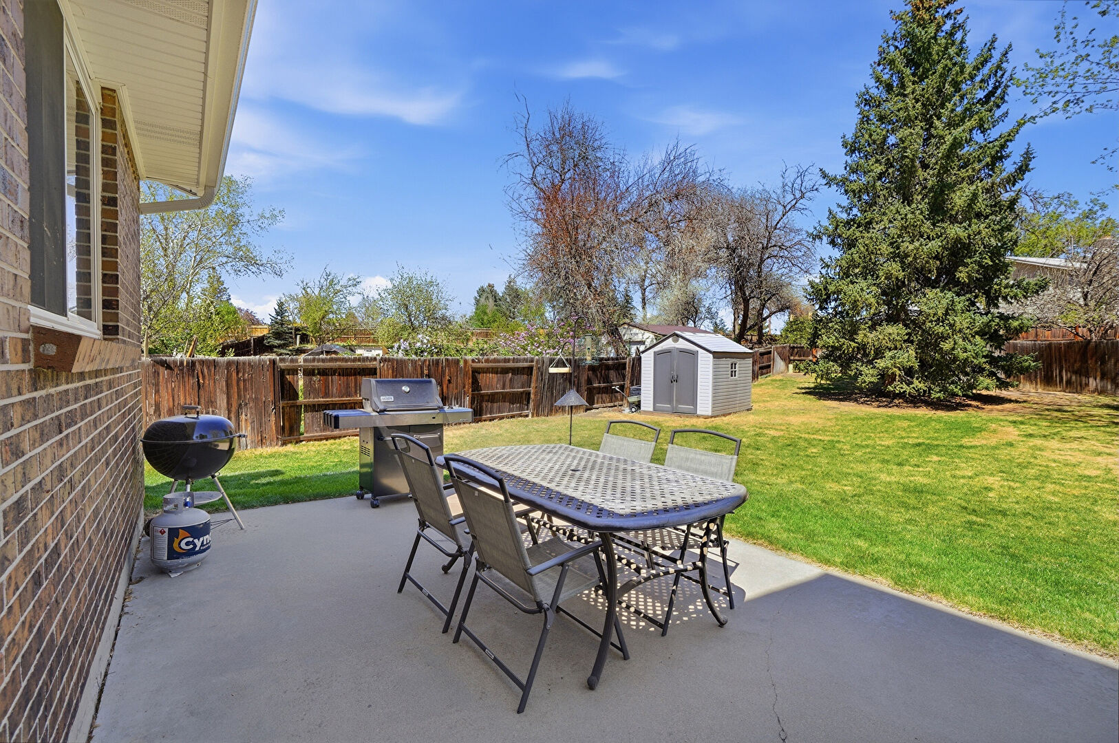 Brick Siding, Central Ac, Concrete Foundation, Downspout, Entry Steps, Fence, Grill, Gutters, Lawn, Outdoor Dining Area, Outdoor Structure, Patio, Playground, Shed, Chimney, Fence, Lawn, Patio