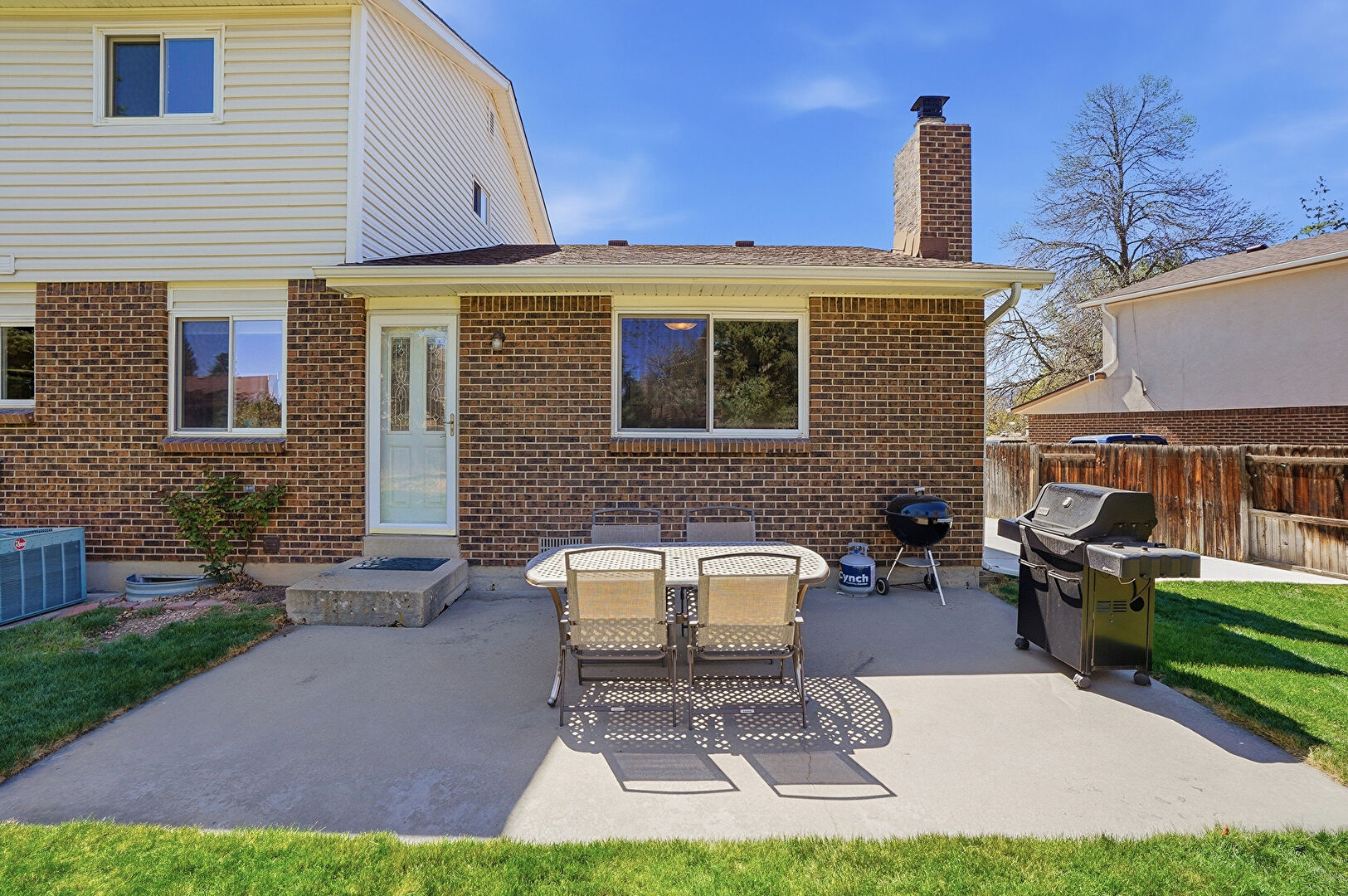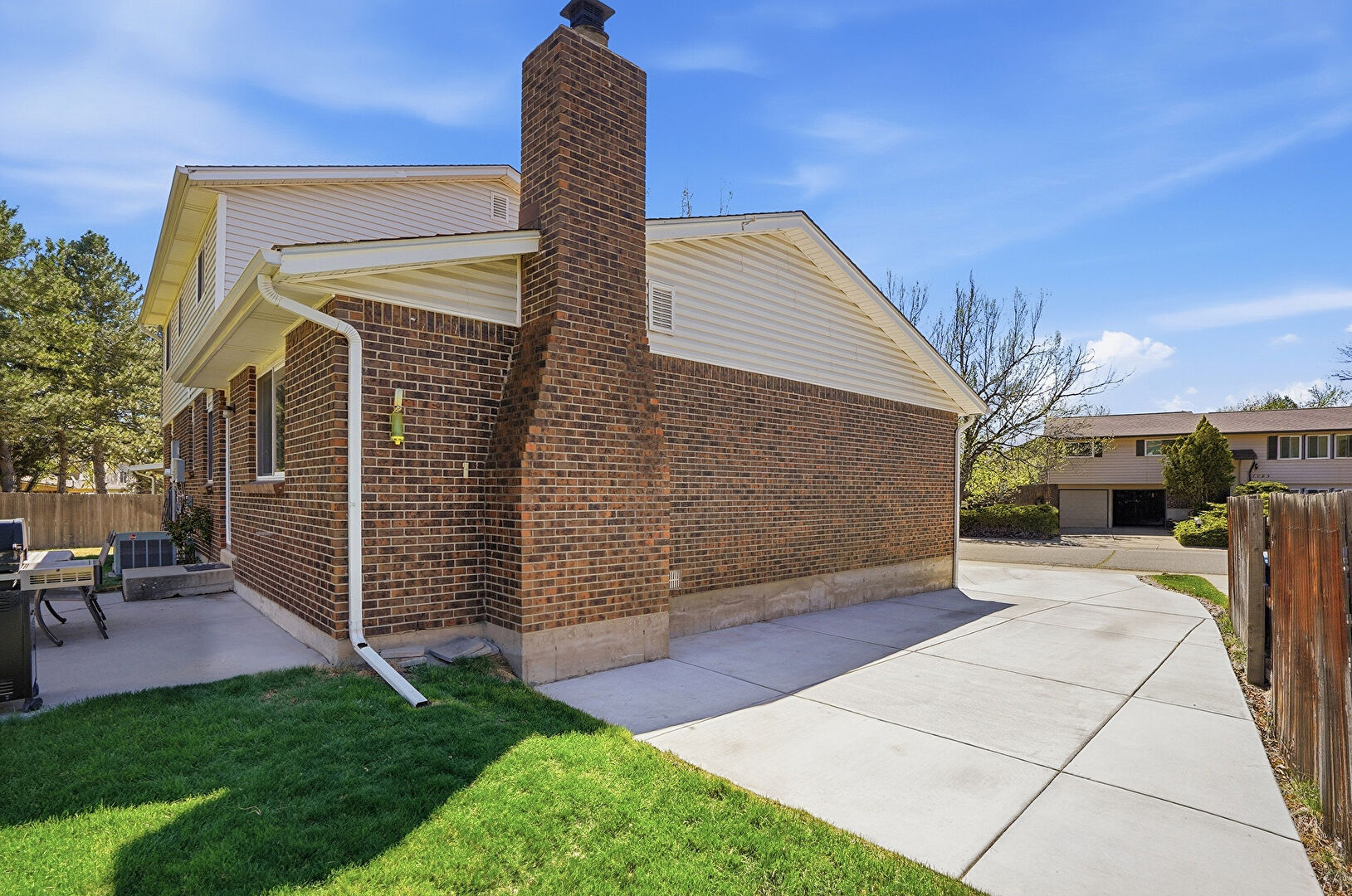 Brick Siding, Central Ac, Concrete Foundation, Downspout, Fence, Grill, Gutters, Horizontal Siding, Lawn, Patio, Chimney