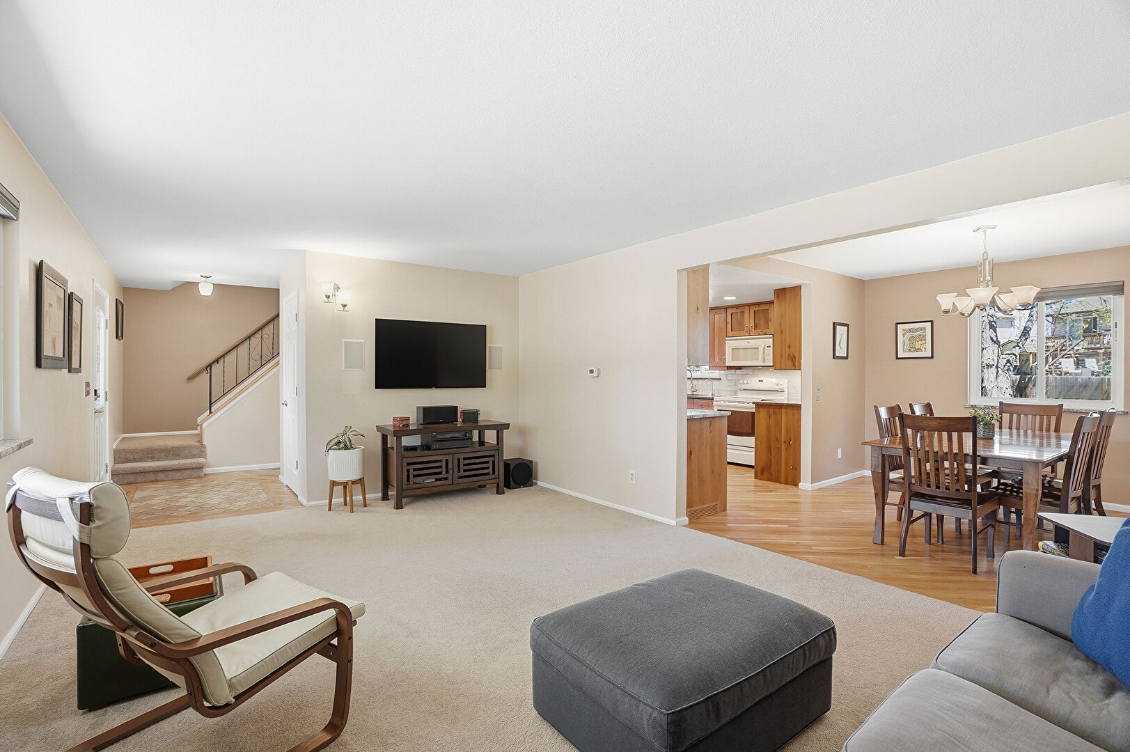 Baseboards Wall, Beamed Ceiling, Carpet, Drywall, Fireplace, Natural Light, Notable Chandelier, Stairs, Vent, Wood Finish Floor, Baseboards Wall, Carpet, Drywall, Natural Light, Vent