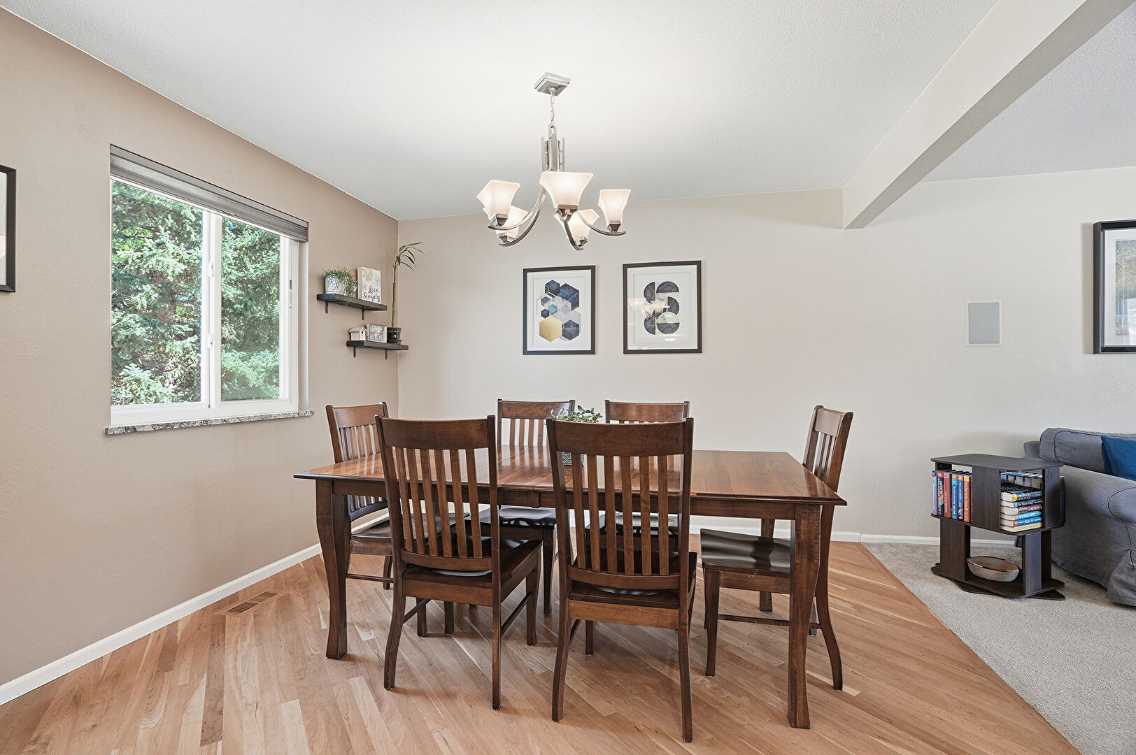 Baseboards Wall, Beamed Ceiling, Drywall, Natural Light, Notable Chandelier, Recessed Lighting, Vent, Wood Finish Floor, Baseboards Wall, Drywall, Natural Light