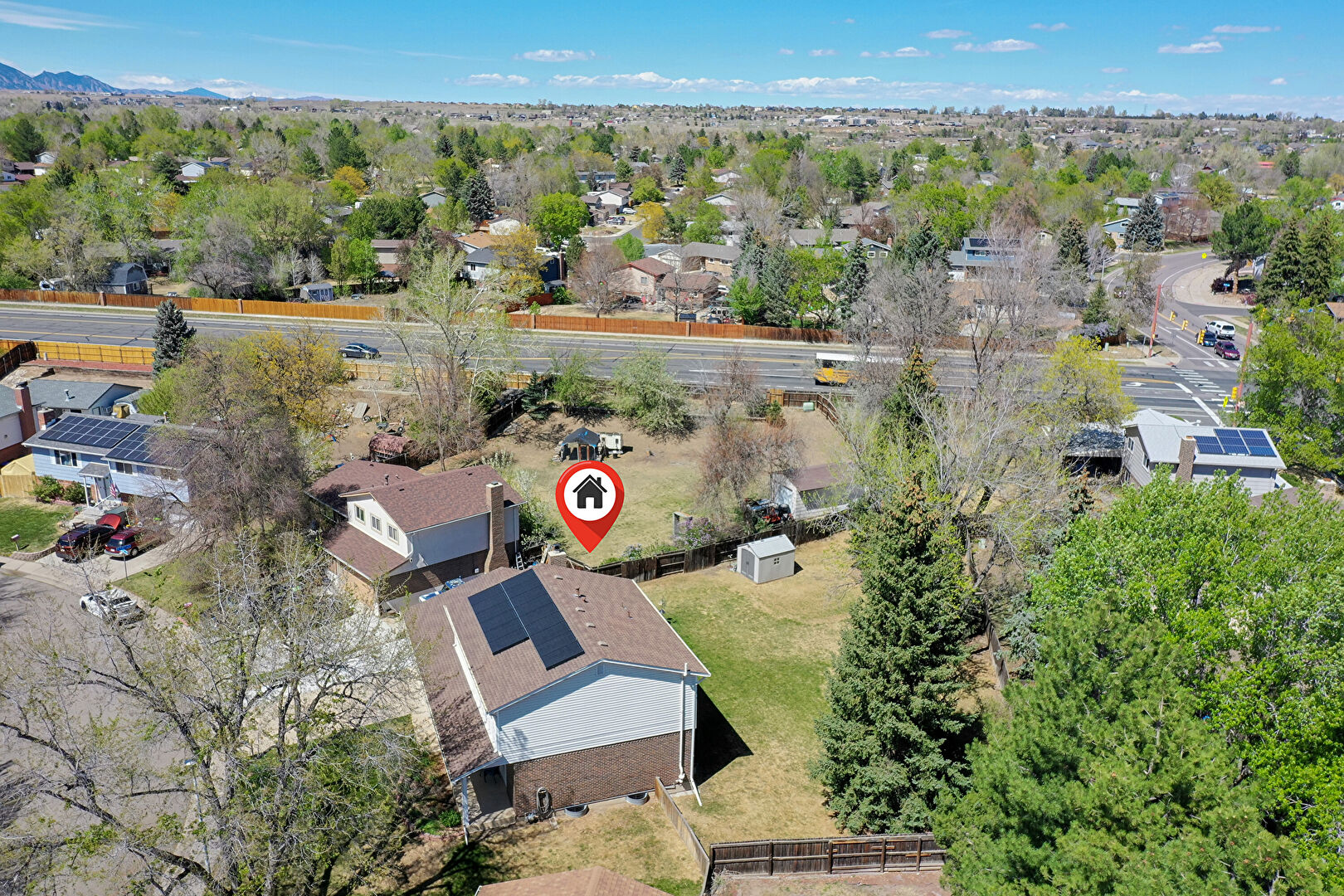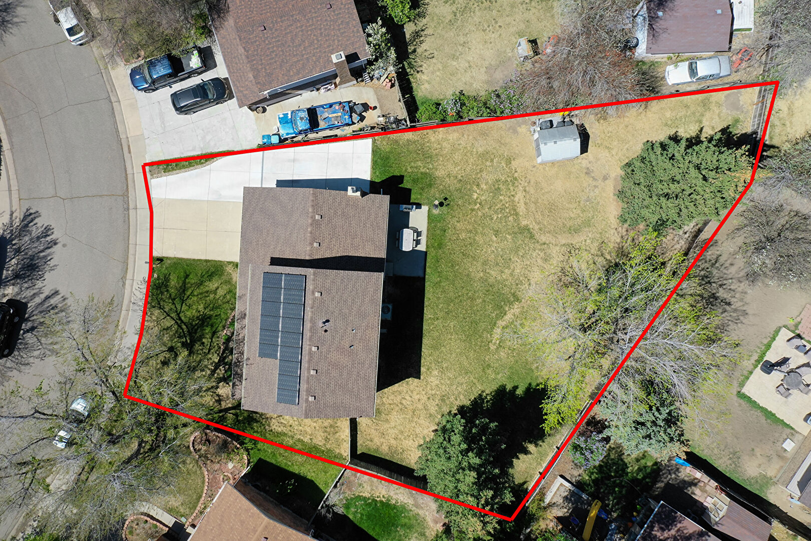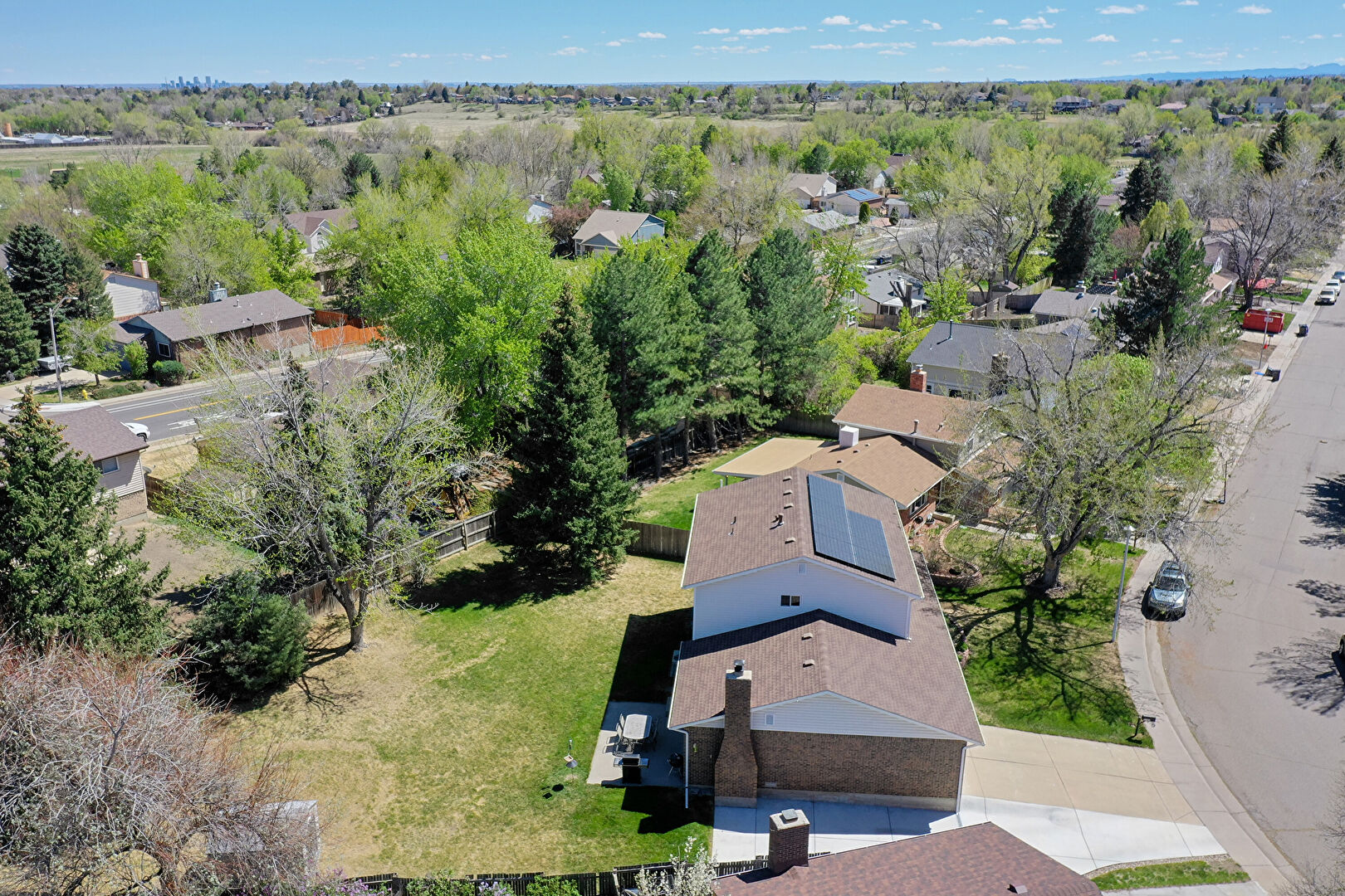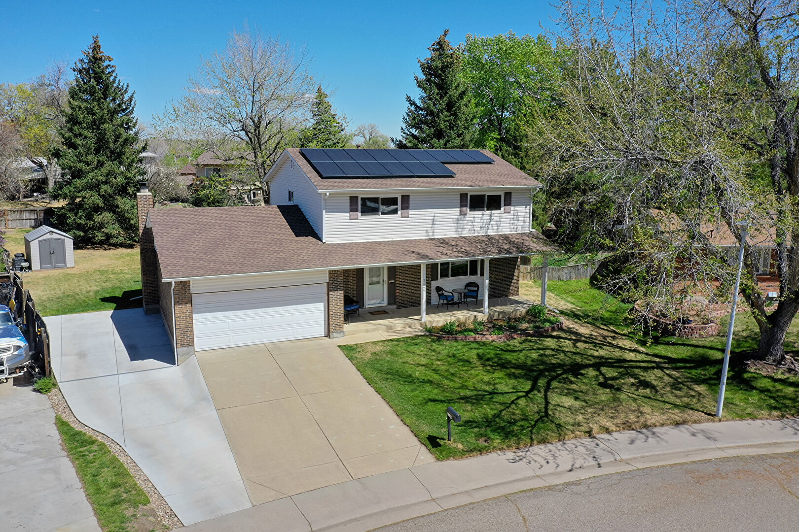 Brick Siding, Chimney, Concrete Foundation, Downspout, Driveway, Fence, Grill, Gutters, Horizontal Siding, Lawn, Outdoor Structure, Parking Pad, Patio, Porch, Shed, Shingle Roof, Solar Panels, Brick Siding, Concrete Foundation, Driveway