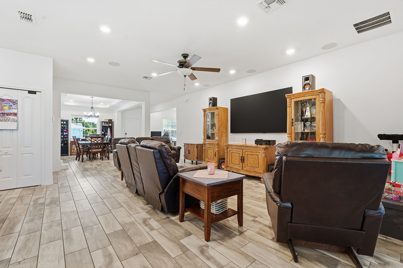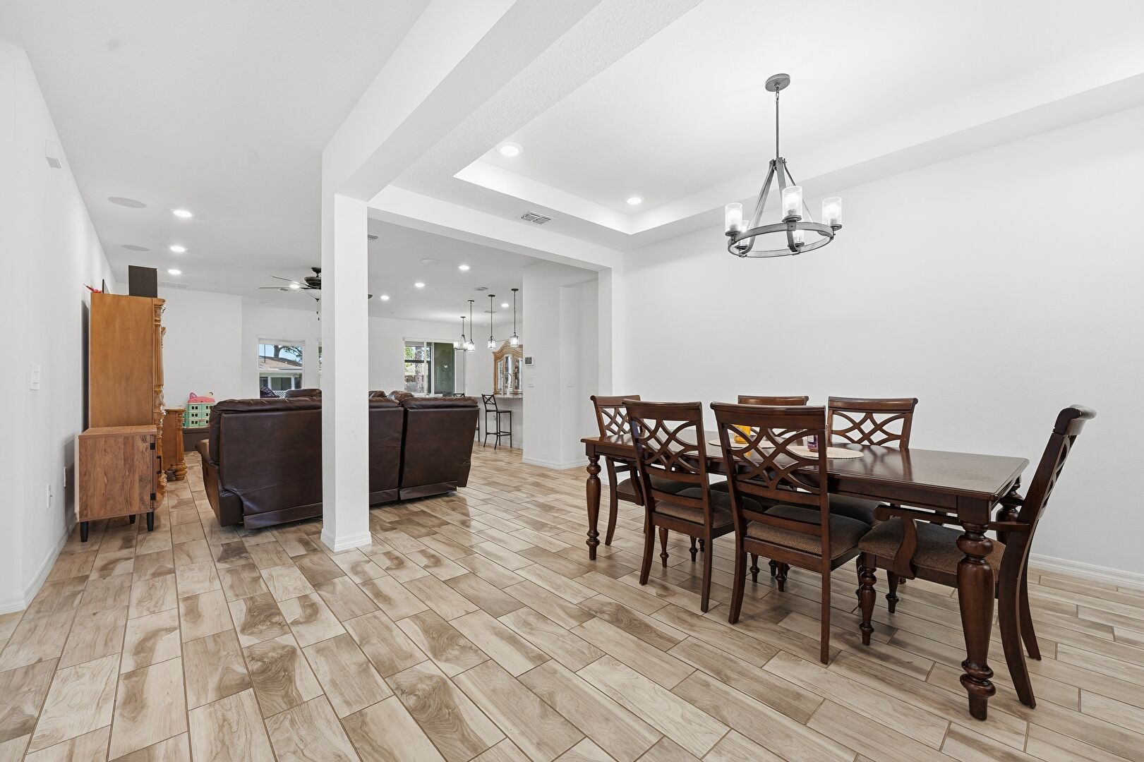 Baseboards Wall, Ceiling Fan, Drywall, Natural Light, Recessed Lighting, Vent, Wood Finish Floor, Notable Chandelier, Recessed Lighting