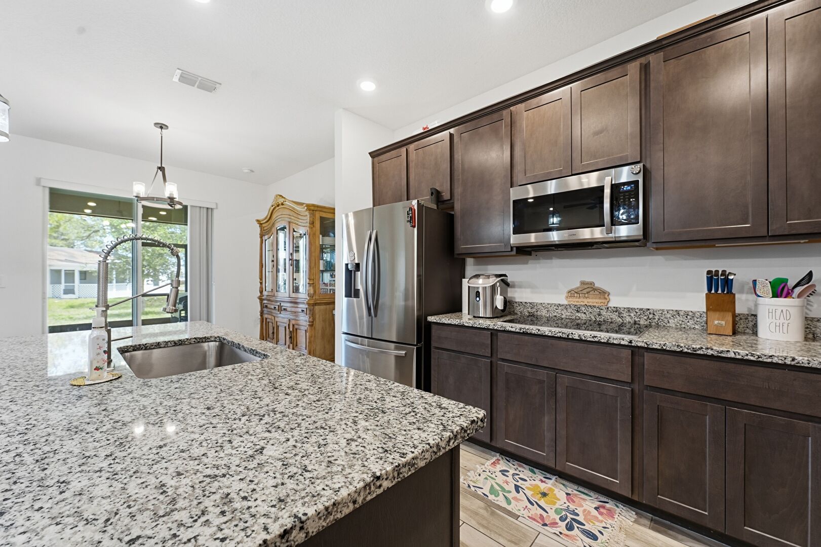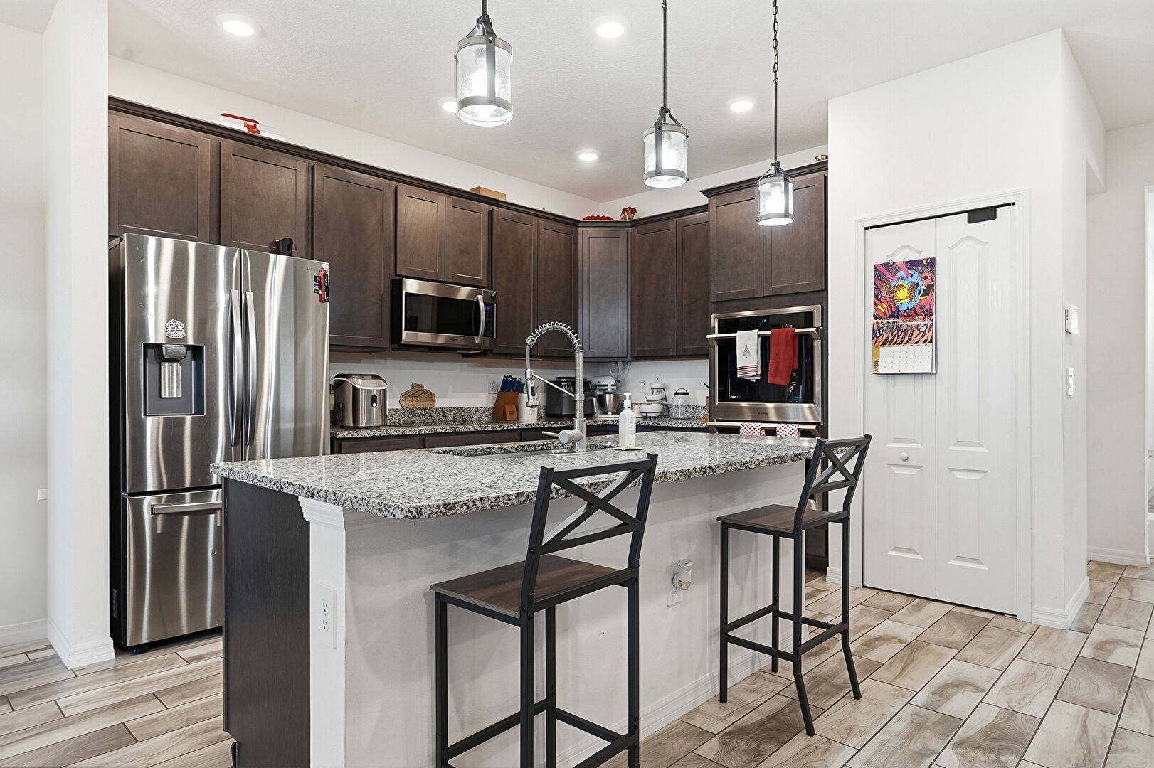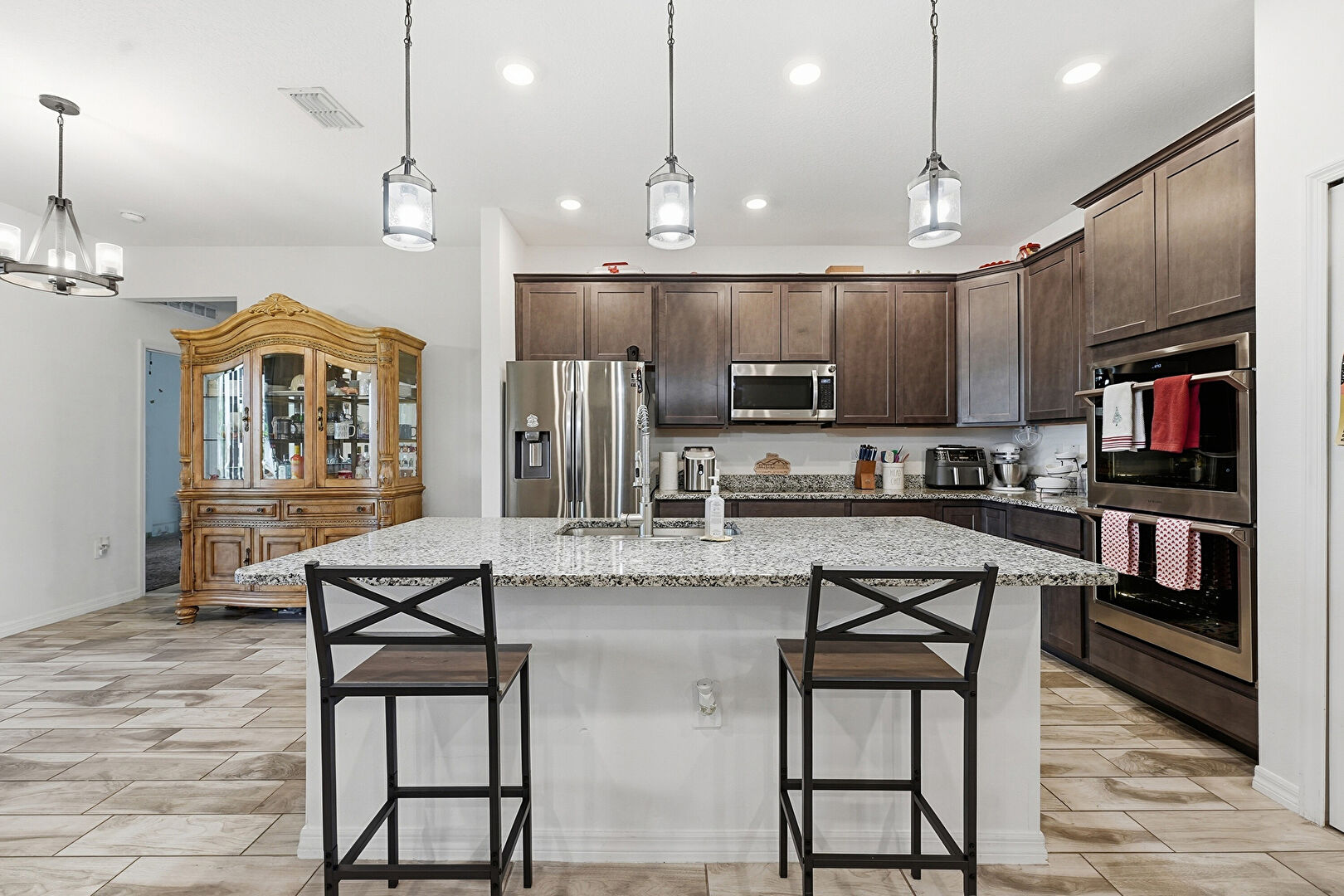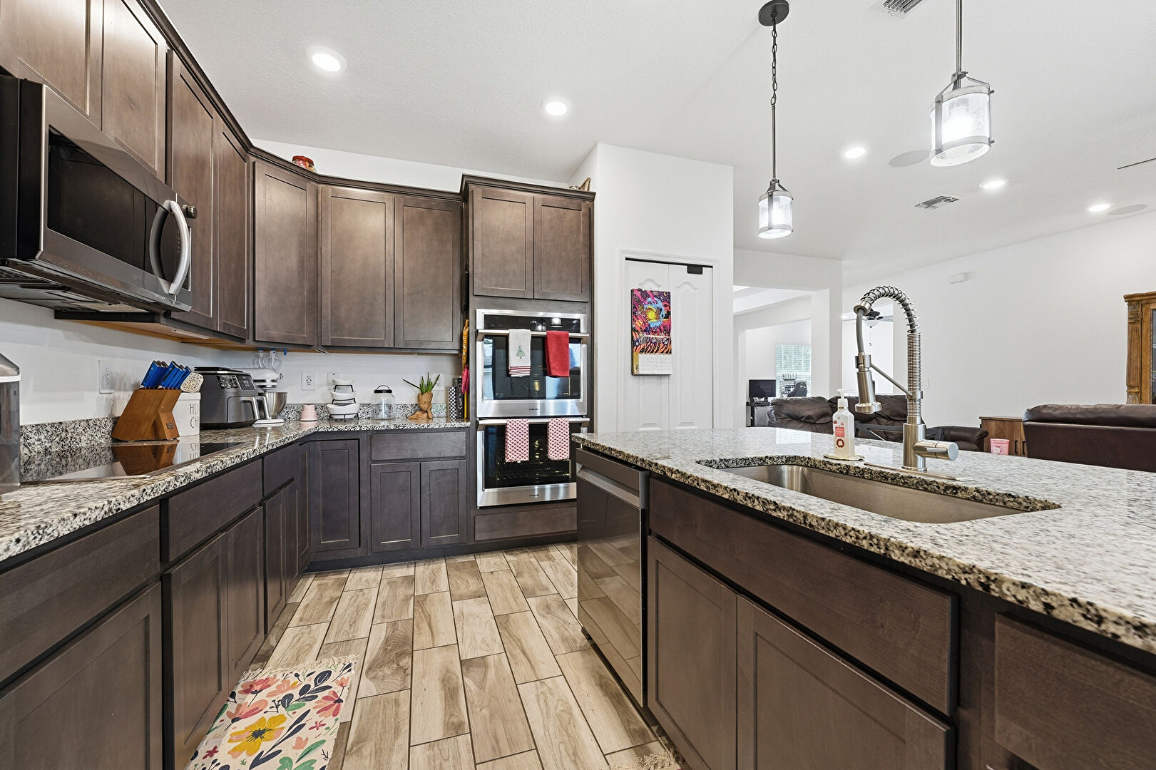 Baseboards Wall, Crown Molding Cabinets, Dark Brown Cabinets, Double Oven, Drywall, Kitchen Bar, Kitchen Island, L Shaped Kitchen, Natural Light, Notable Chandelier, Opens To Living Area, Pendant Lighting, Recessed Lighting, Shaker Cabinets, Stone Countertops, Vent, Wood Finish Floor, Drywall, Toaster, Wood Finish Floor