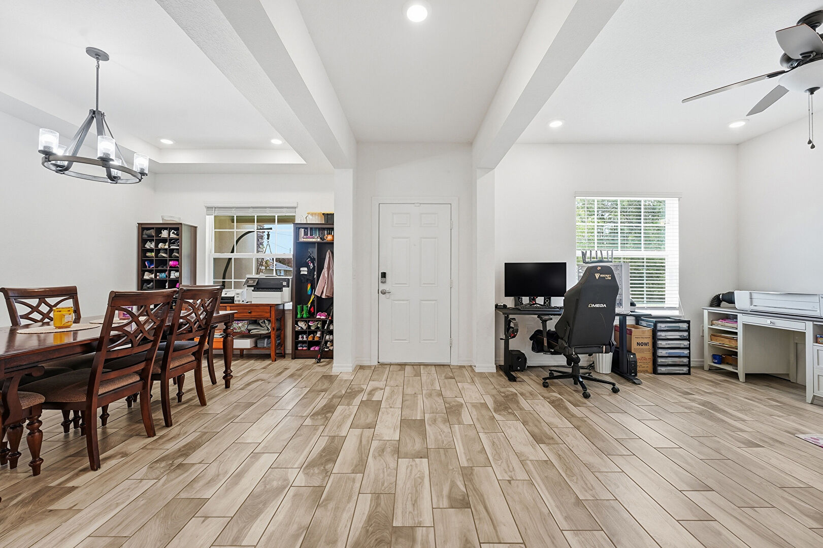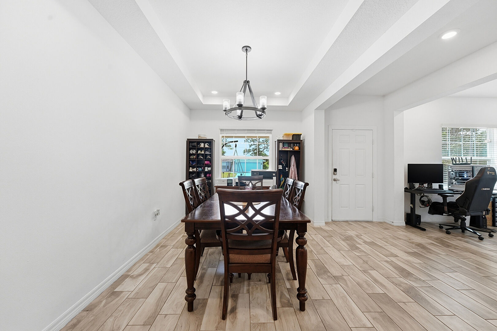 Baseboards Wall, Ceiling Fan, Drywall, Natural Light, Notable Chandelier, Office Area, Tray Ceiling, Wood Finish Floor, Recessed Lighting