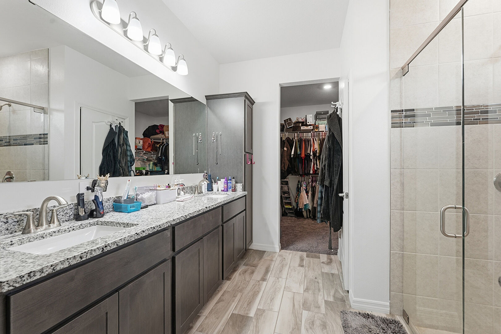 Baseboards Wall, Dog Washing Station, Double Vanity, Drywall, Full Bathroom, Walk In Closet, Natural Light, Wood Finish Floor