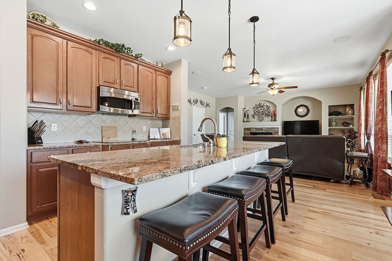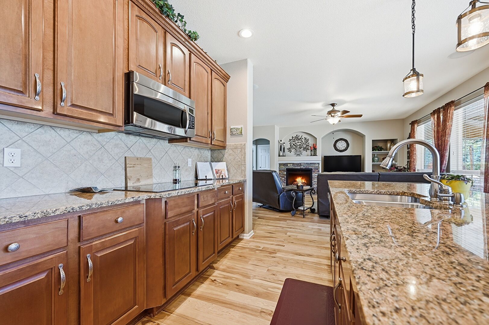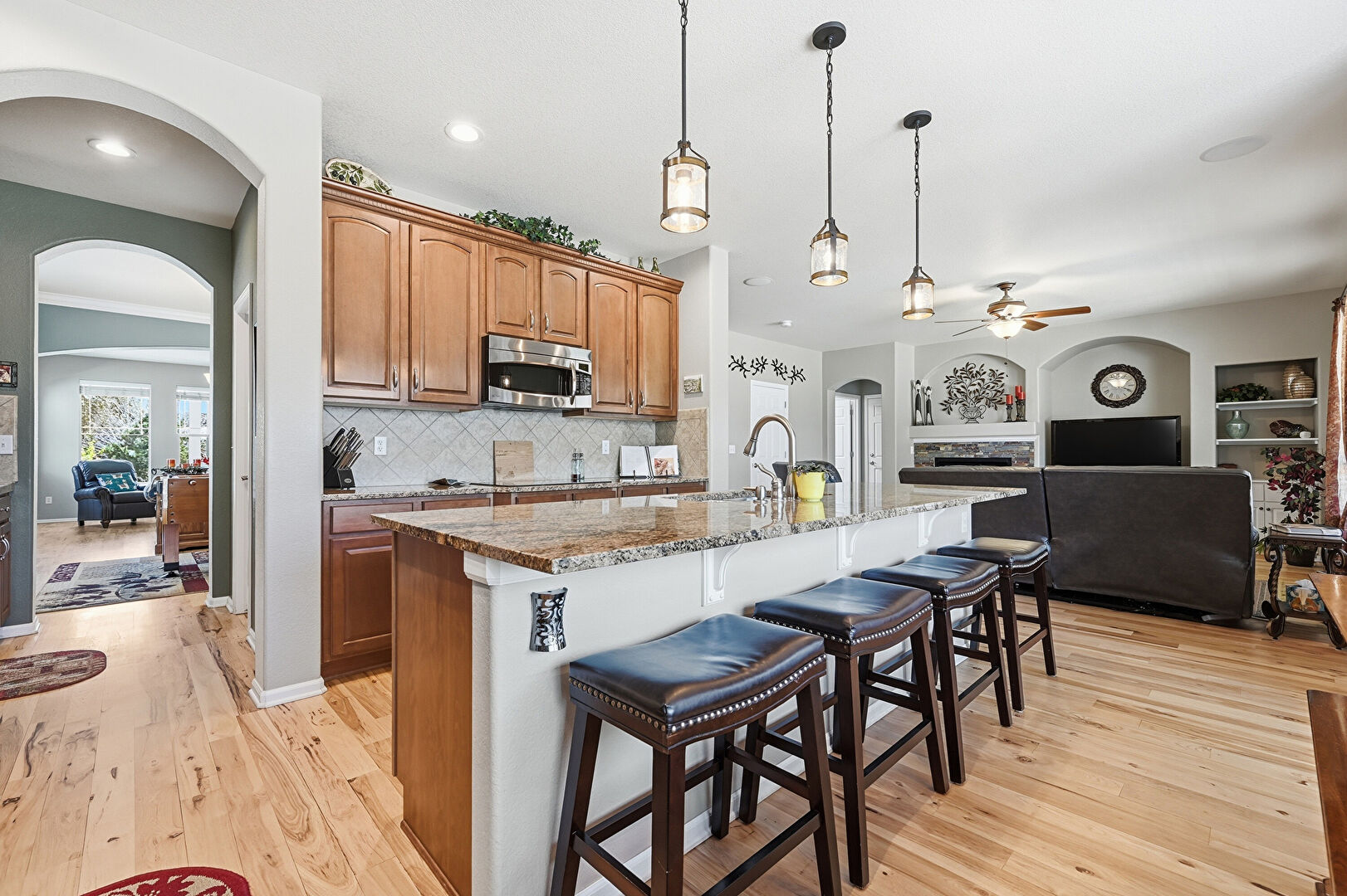 Arched Cabinets, Arched Walkways, Baseboards Wall, Built In Shelves, Ceiling Fan, Crown Molding Cabinets, Double Oven, Drywall, Fireplace, Kitchen Bar, Kitchen Island, L Shaped Kitchen, Medium Brown Cabinets, Natural Light, Notable Chandelier, Opens To Living Area, Pendant Lighting, Raised Cabinets, Recessed Lighting, Stone Countertops, Wood Finish Floor, Baseboards Wall, Drywall, Kitchen Island, Pendant Lighting, Recessed Lighting
