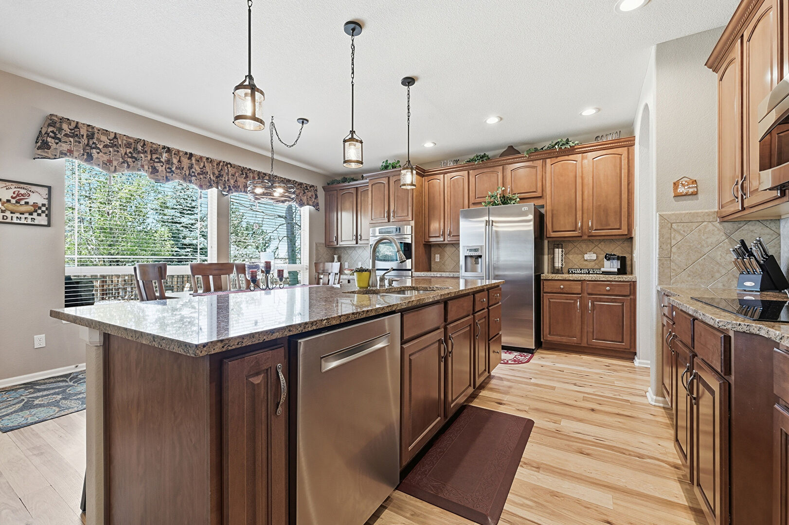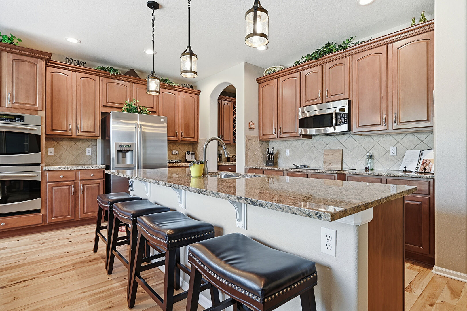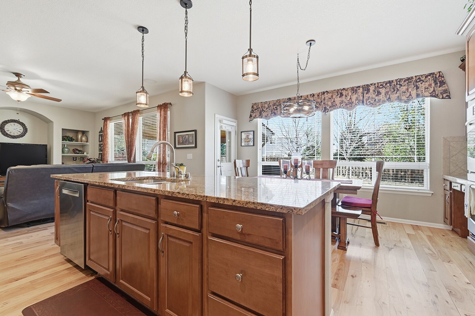 Arched Cabinets, Arched Walkways, Baseboards Wall, Built In Shelves, Ceiling Fan, Crown Molding Cabinets, Double Oven, Drywall, Fireplace, Kitchen Bar, Kitchen Island, L Shaped Kitchen, Medium Brown Cabinets, Natural Light, Notable Chandelier, Opens To Living Area, Pendant Lighting, Raised Cabinets, Recessed Lighting, Stone Countertops, Wood Finish Floor, Baseboards Wall, Drywall, Kitchen Island, Pendant Lighting, Recessed Lighting