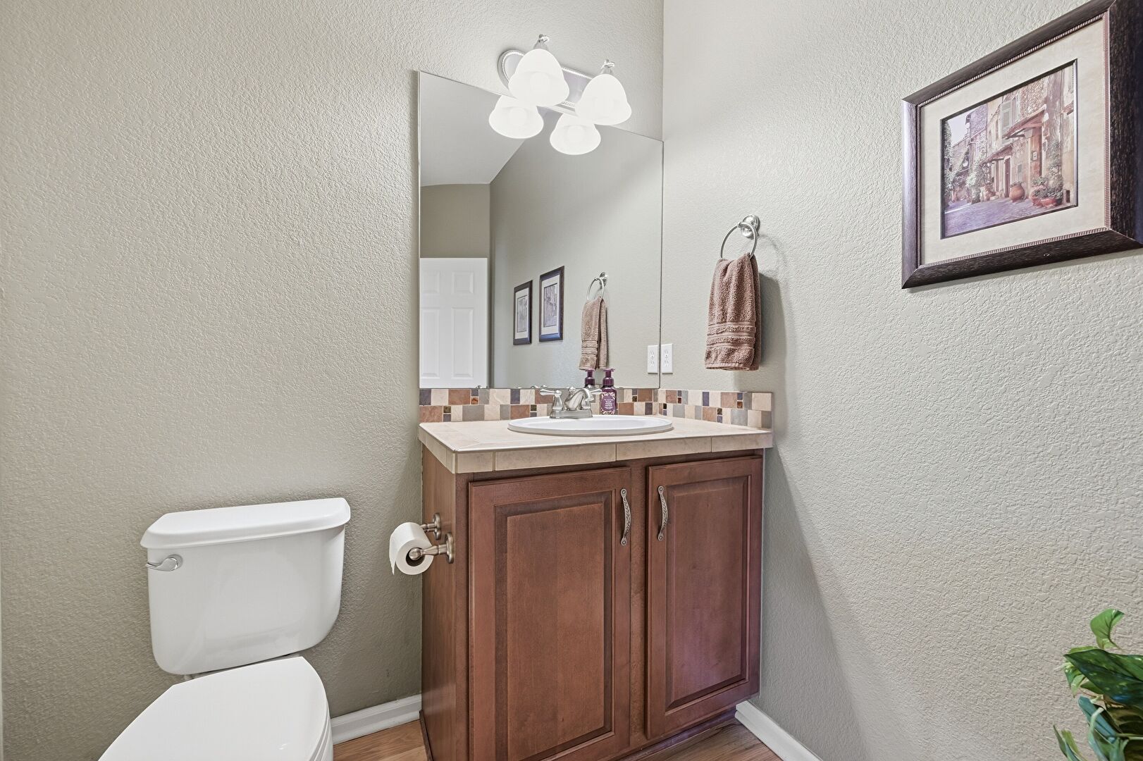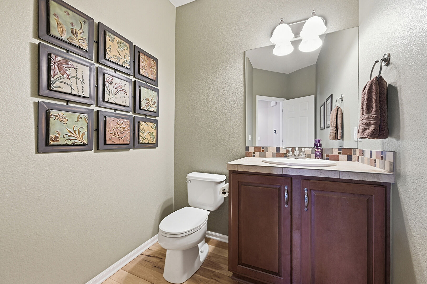 Baseboards Wall, Carpet, Double Vanity, Drywall, Full Bathroom, Half Bathroom, Natural Light, Textured Wall, Tile Floor, Vanity, Vent, Wood Finish Floor, Baseboards Wall, Drywall, Full Bathroom, Notable Chandelier