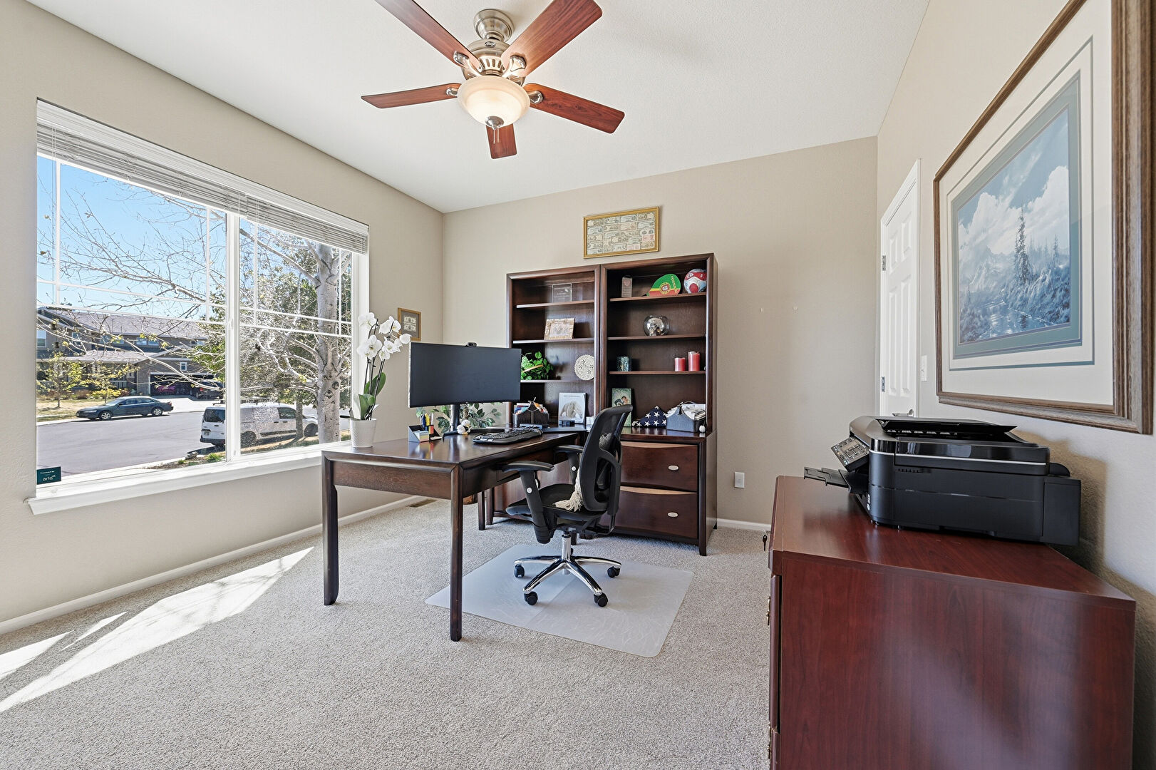 Baseboards Wall, Carpet, Ceiling Fan, Drywall, Office Area, Natural Light