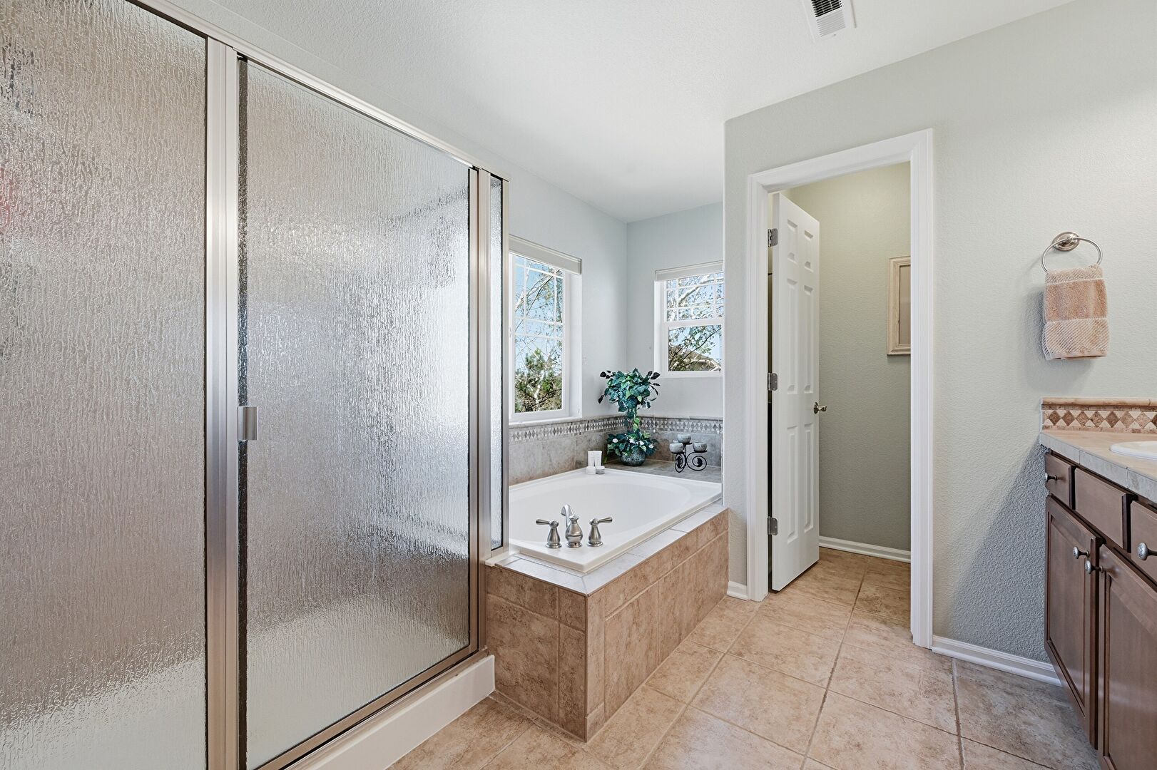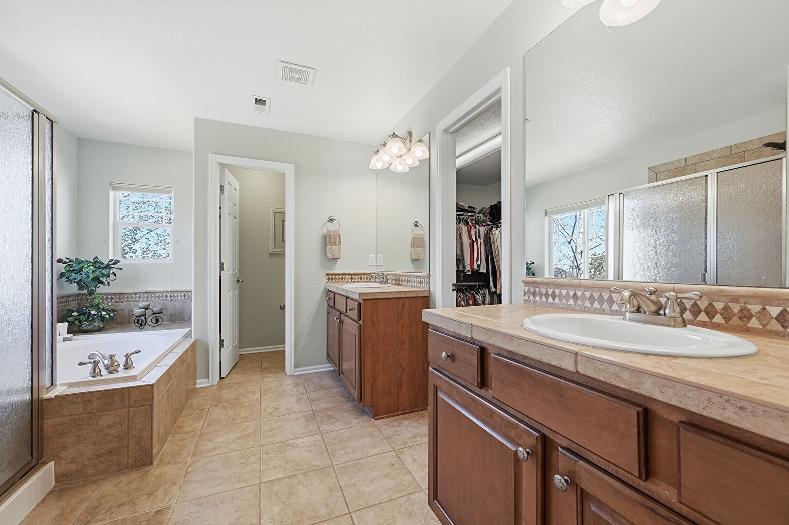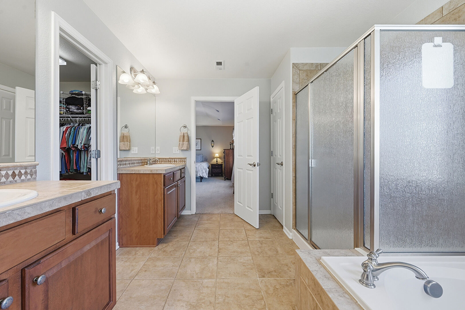 Carpet, Drywall, Ensuite Bathroom, Full Bathroom, Natural Light, Tile Floor, Two Single Vanities, Vanity, Vent, Walk In Closet, Baseboards Wall, Full Bathroom, Tile Floor