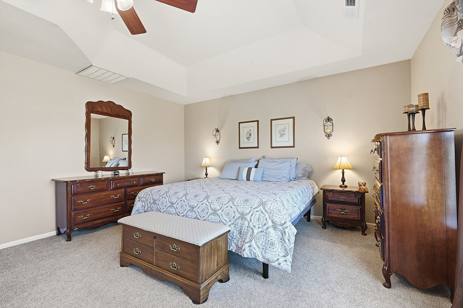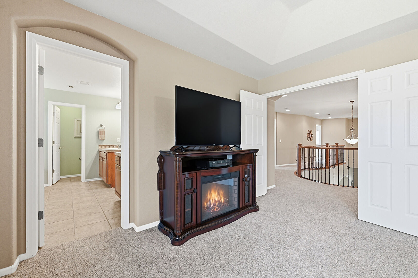 Arched Walkways, Baseboards Wall, Carpet, Ceiling Fan, Drywall, Ensuite Bathroom, Fireplace, Natural Light, Tile Floor, Tray Ceiling, Vent, Baseboards Wall, Drywall, Vent