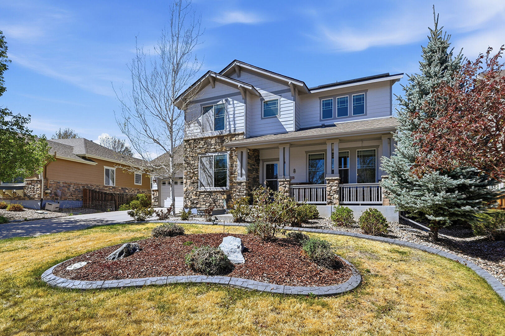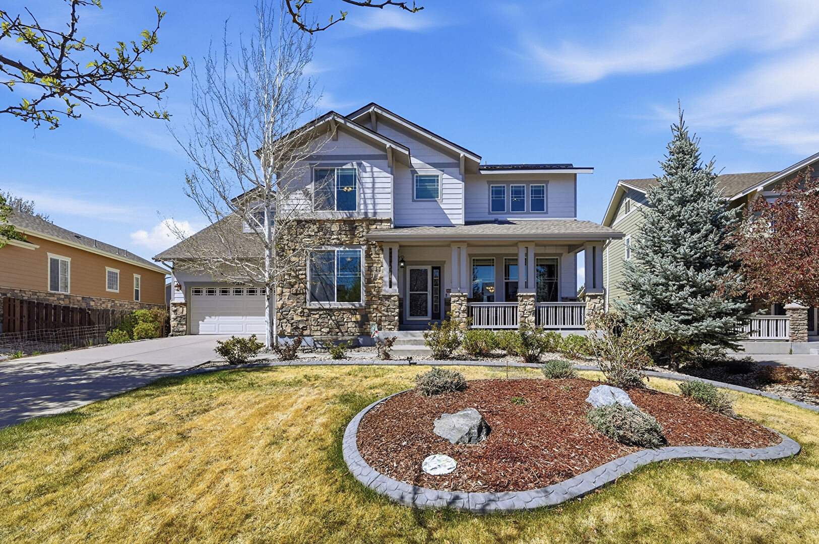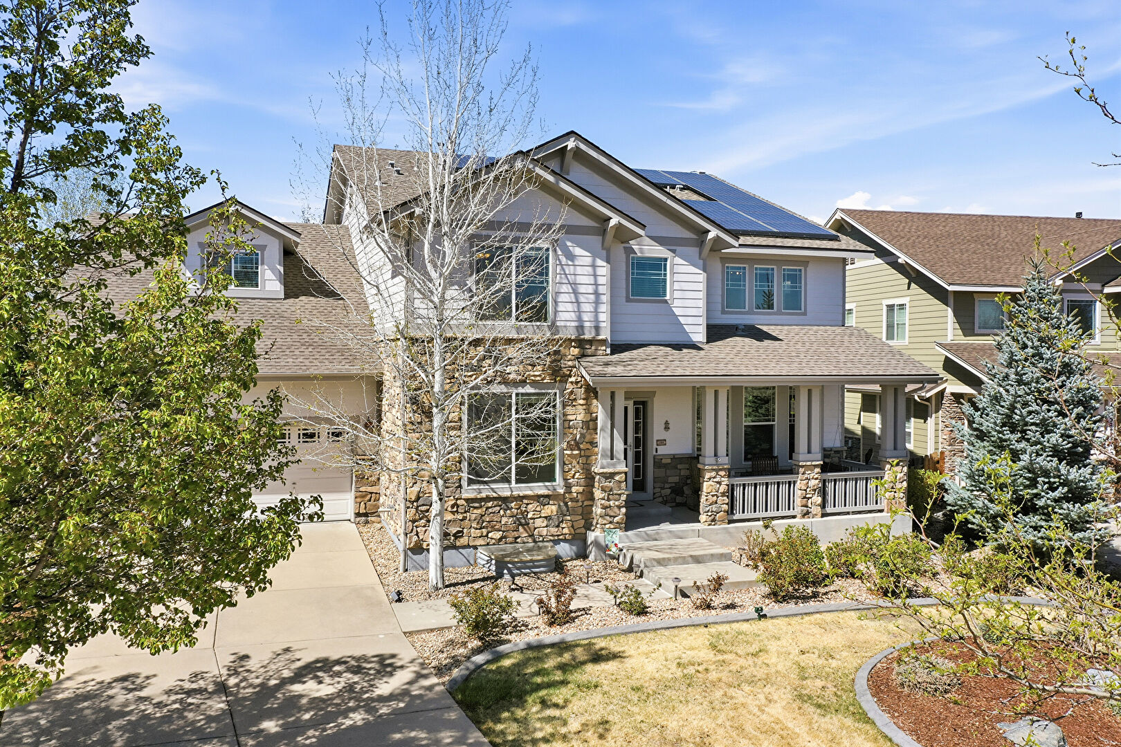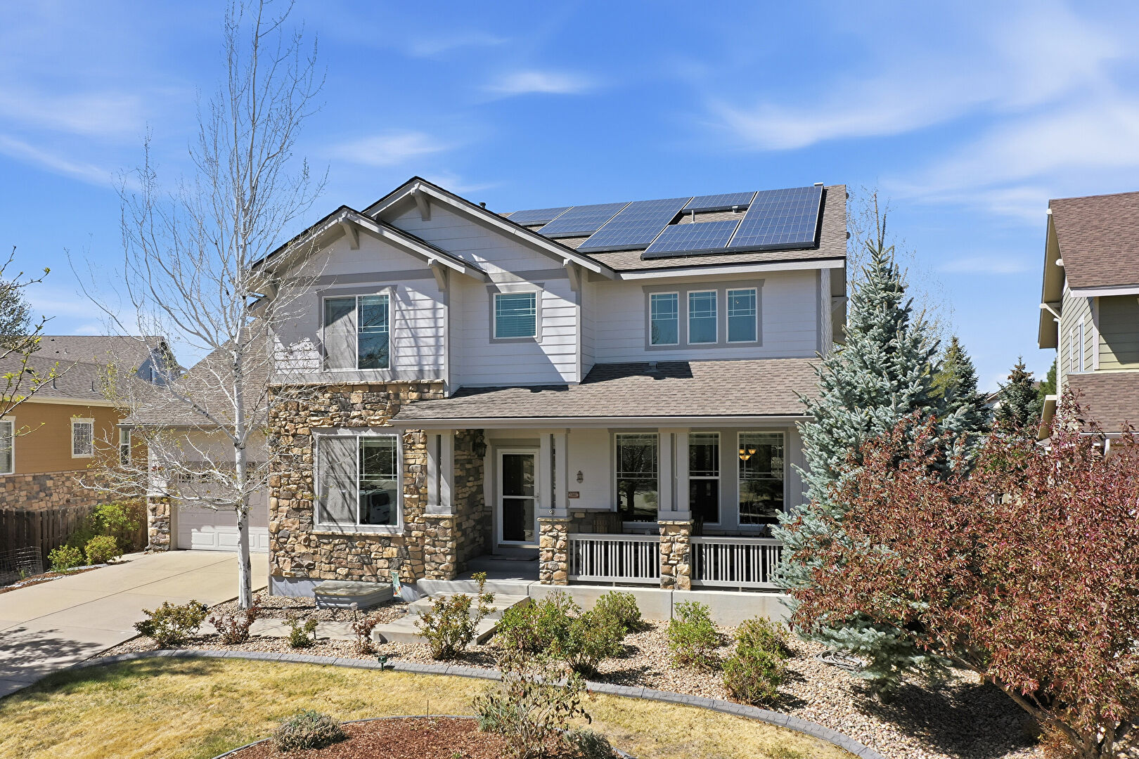 Concrete Foundation, Dormer Roof, Downspout, Driveway, Fence, Garage, Gutters, Horizontal Siding, Lawn, Porch, Residential View, Shingle Roof, Solar Panels, Stone Siding, Fence, Gutters, Horizontal Siding, Porch, Solar Panels, Stone Siding
