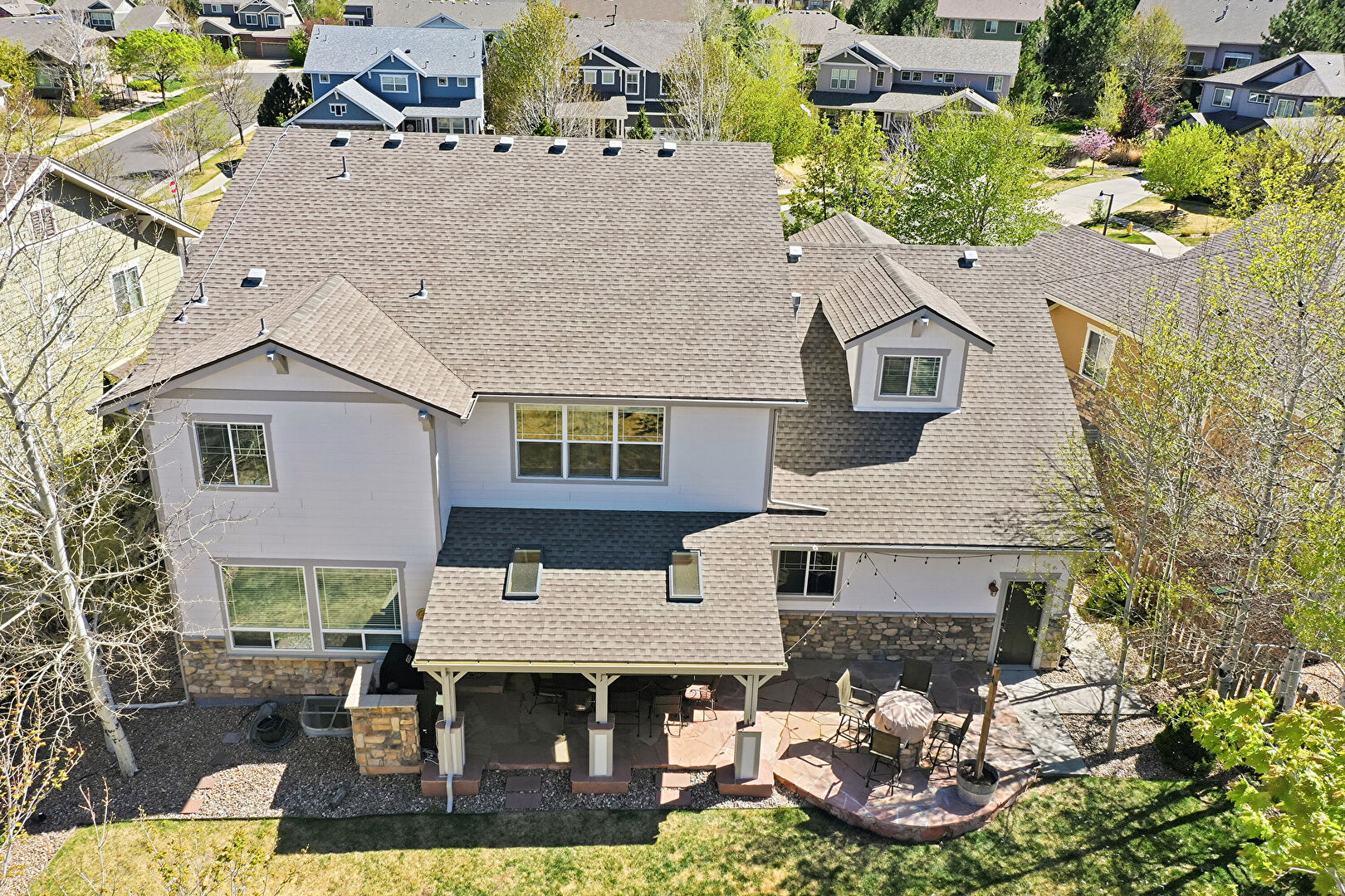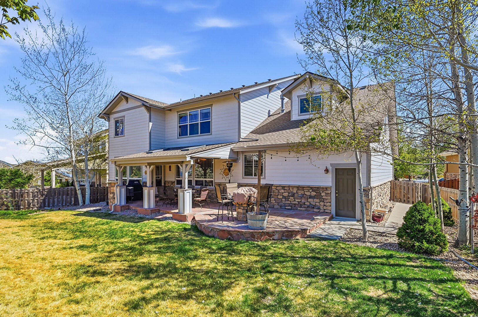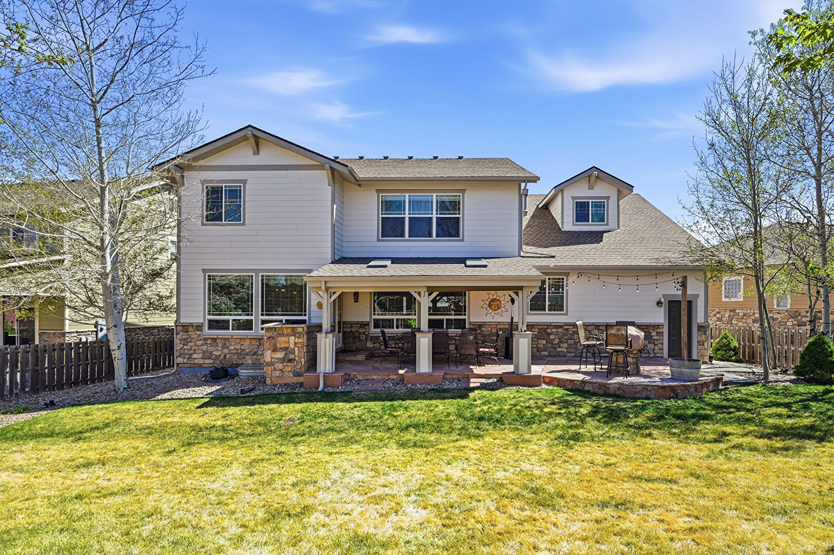 Concrete Foundation, Dormer Roof, Downspout, Fence, Grill, Gutters, Horizontal Siding, Lawn, Patio, Residential View, Shingle Roof, Stone Siding, Fence, Shingle Roof, Stone Siding