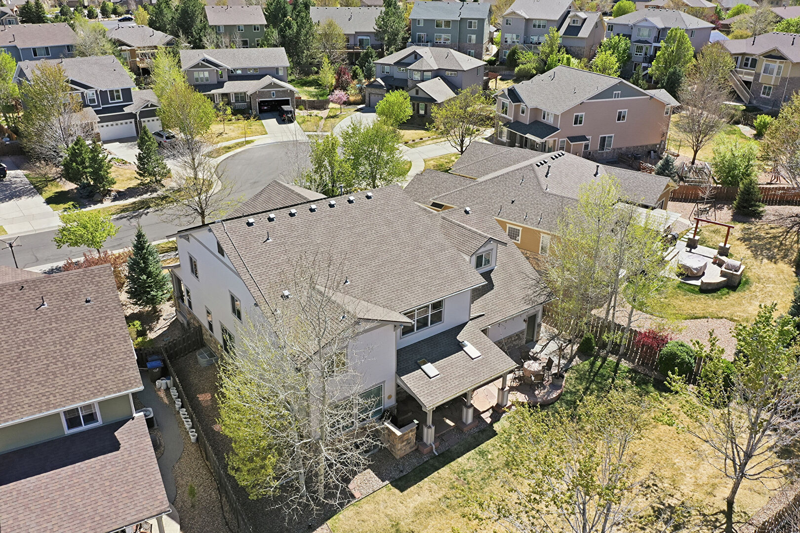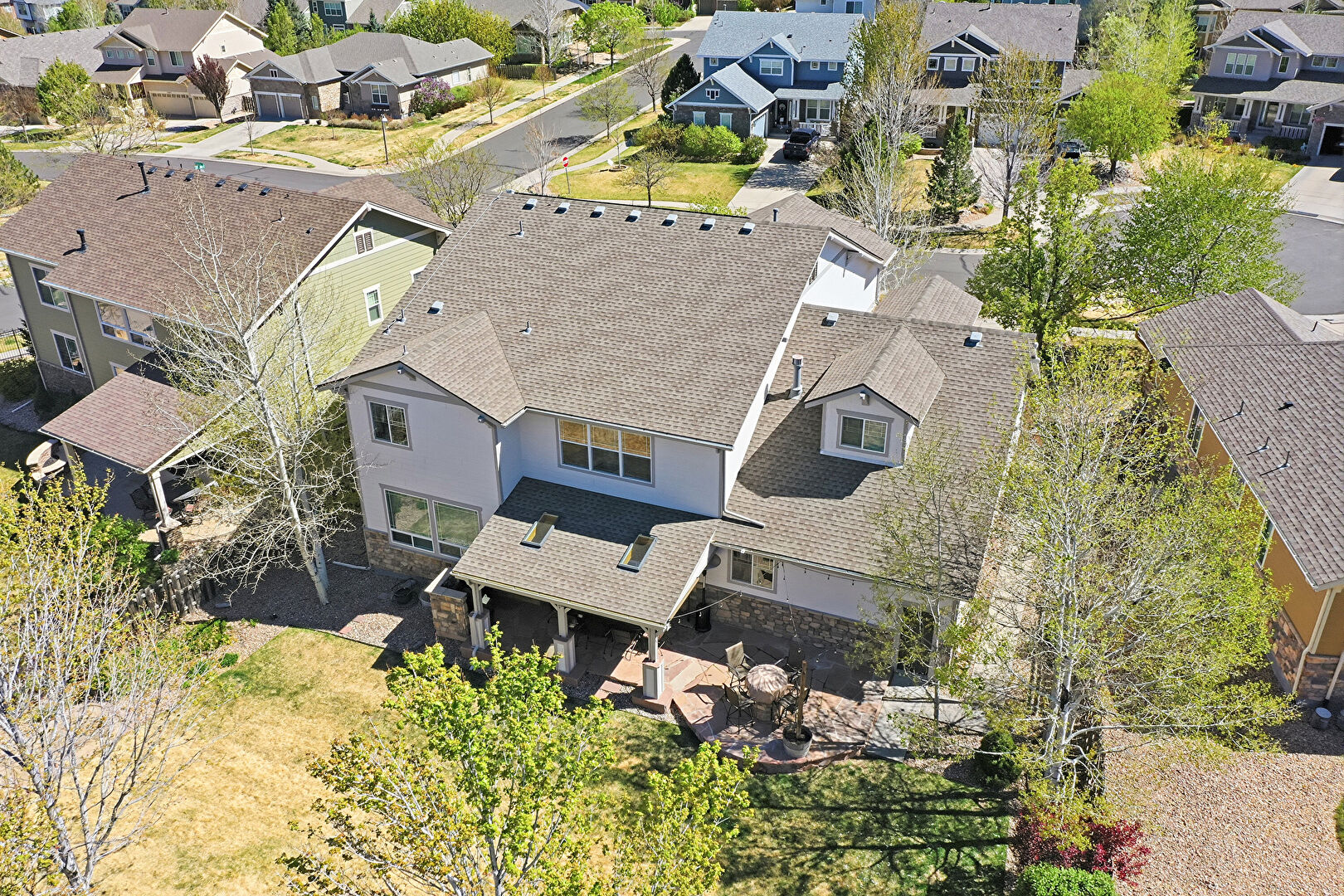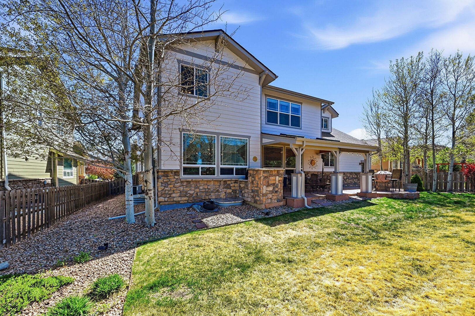 Concrete Foundation, Dormer Roof, Downspout, Fence, Grill, Gutters, Horizontal Siding, Lawn, Patio, Residential View, Shingle Roof, Stone Siding, Fence, Shingle Roof, Stone Siding