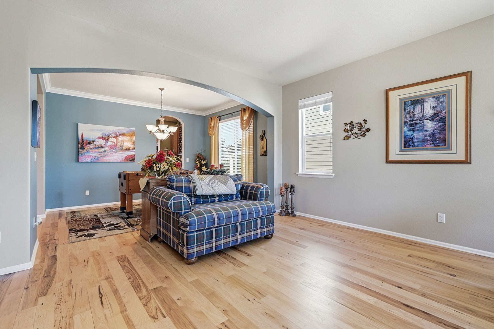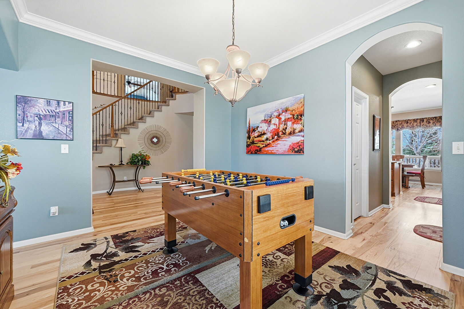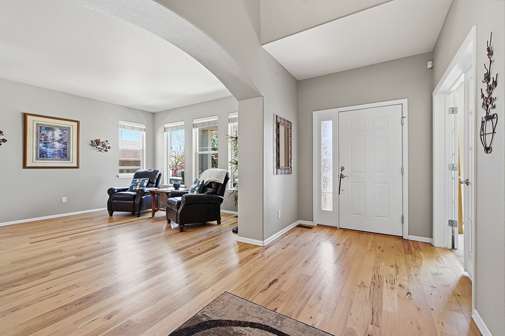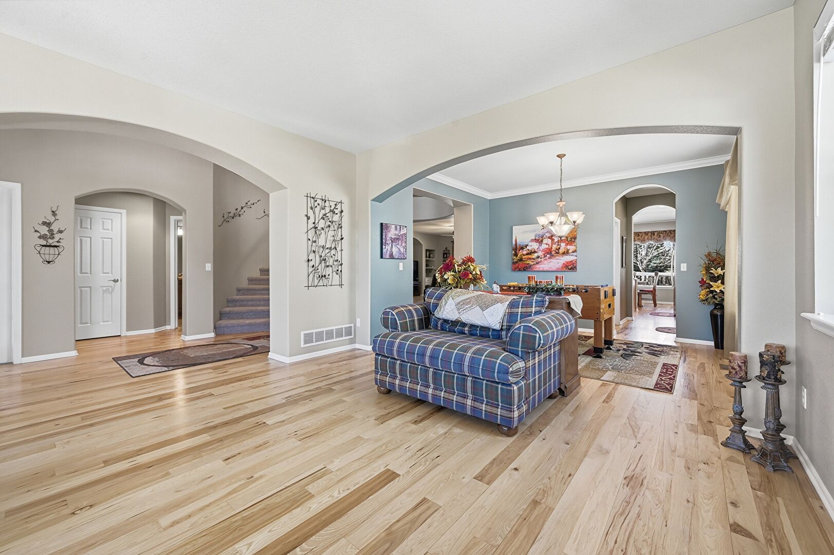Arched Walkways, Baseboards Wall, Crown Molding, Drywall, High Ceiling, Natural Light, Notable Chandelier, Recessed Lighting, Stairs, Vent, Wood Finish Floor, Crown Molding, Vent, Wood Finish Floor