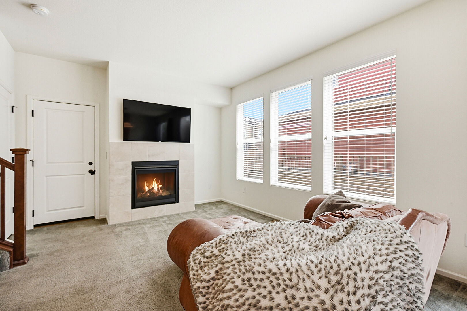 Baseboards Wall, Carpet, Drywall, Fireplace, Natural Light, Recessed Lighting, Smoke Carbon Monoxide Detector, Stairs, Baseboards Wall, Natural Light