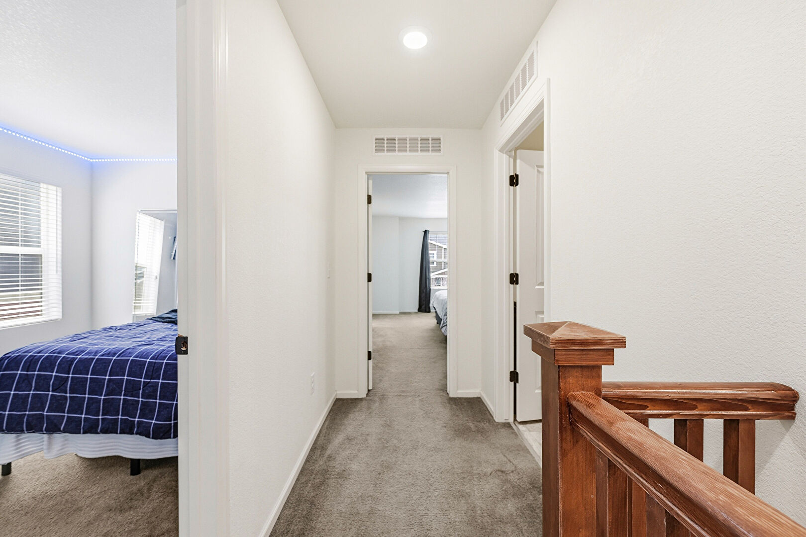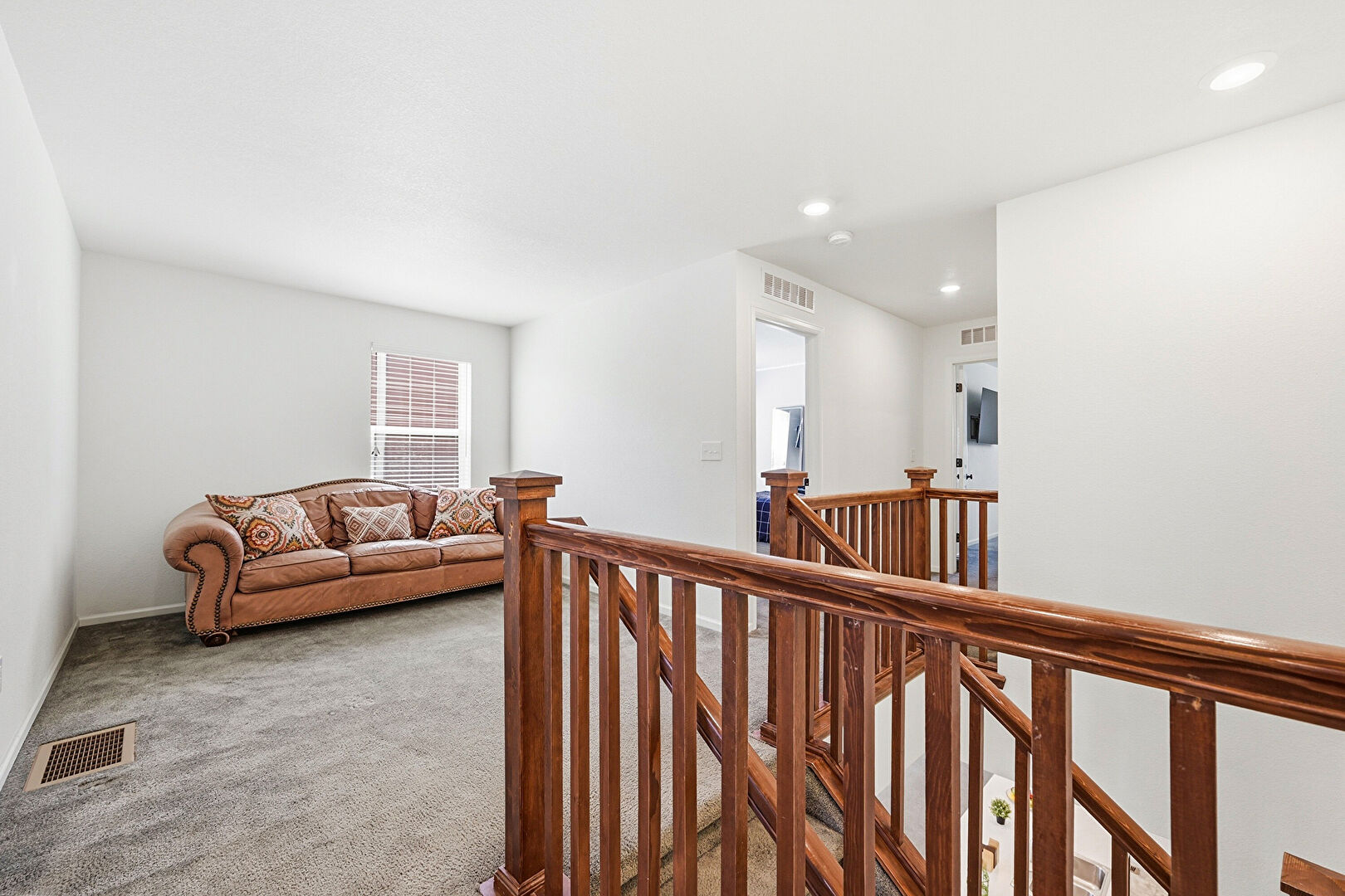 Baseboards Wall, Carpet, Drywall, Natural Light, Recessed Lighting, Upstairs Landing, Vent, Baseboards Wall, Textured Wall
