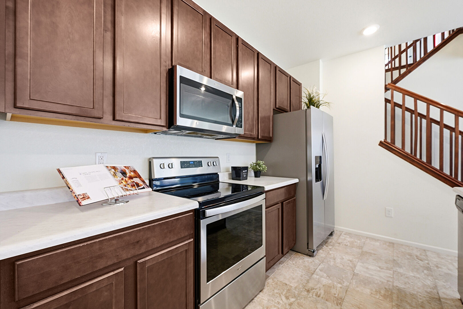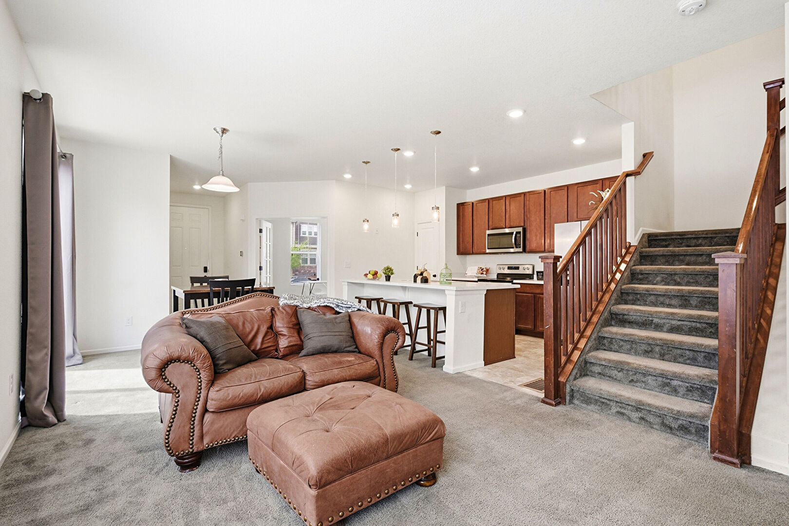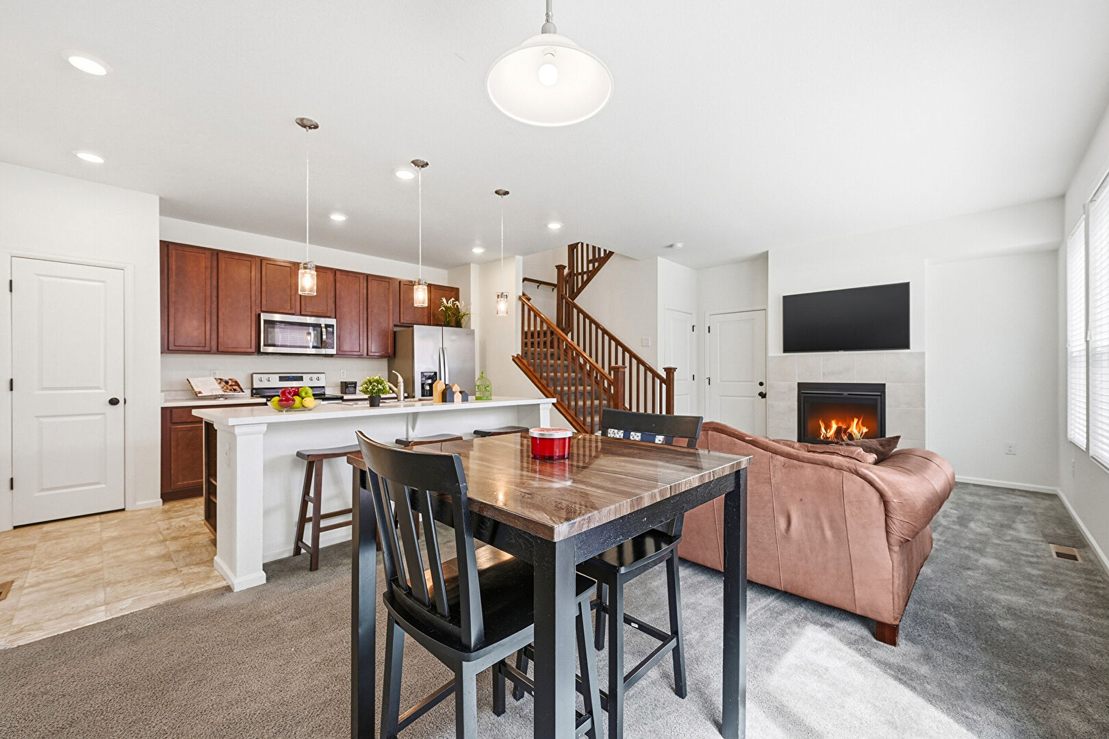 Baseboards Wall, Carpet, Drywall, Fireplace, Natural Light, One Wall Kitchen, Recessed Lighting, Stairs, Vent, Baseboards Wall, Tile Floor