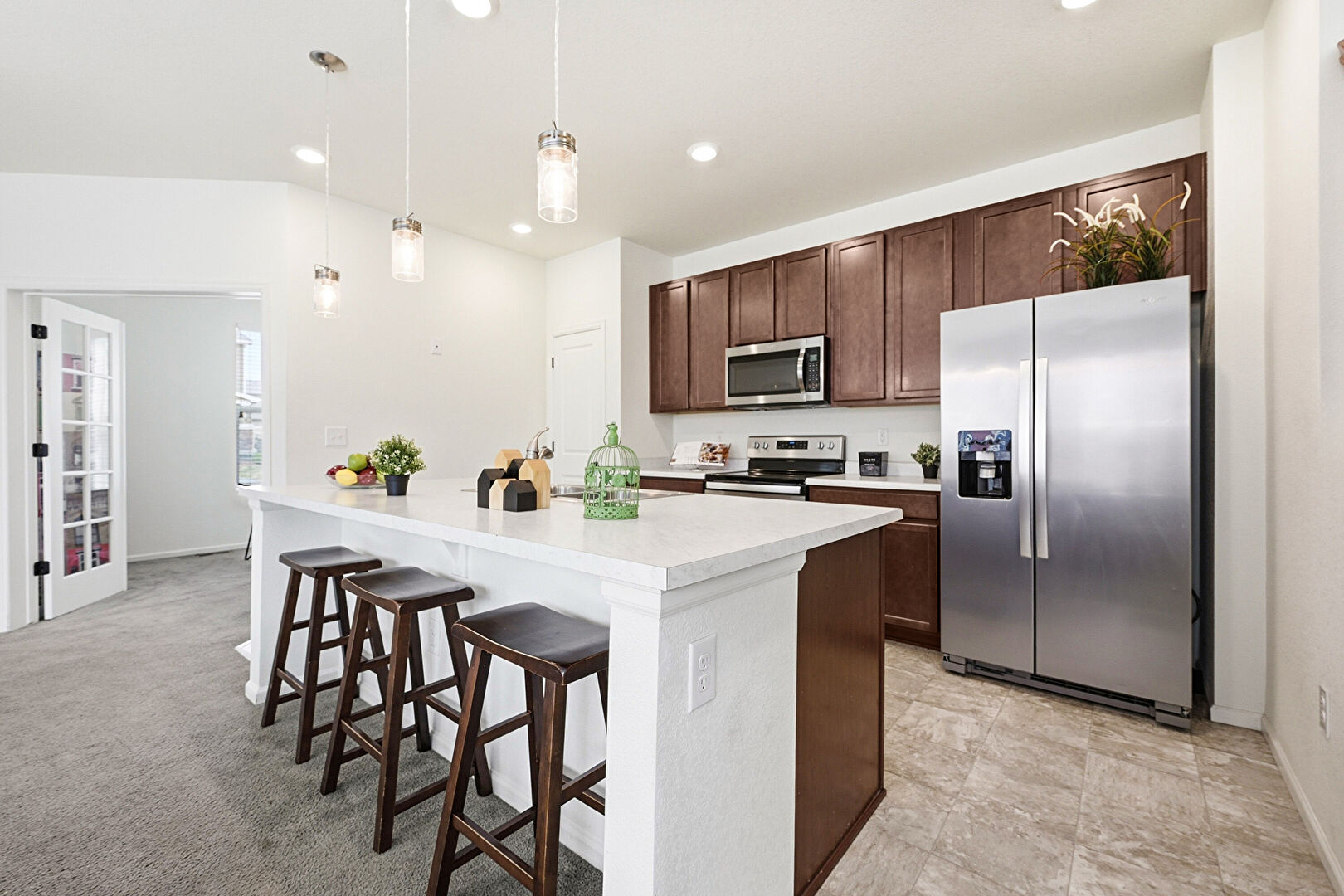 Baseboards Wall, Carpet, Dark Brown Cabinets, Drywall, Kitchen Bar, Kitchen Island, Natural Light, One Wall Kitchen, Open Shelves, Pendant Lighting, Recessed Lighting, Reddish Brown Cabinets, Shaker Cabinets, Stone Countertops, Stone Finish Floor, Baseboards Wall, Kitchen Bar, Kitchen Island, Opens To Living Area