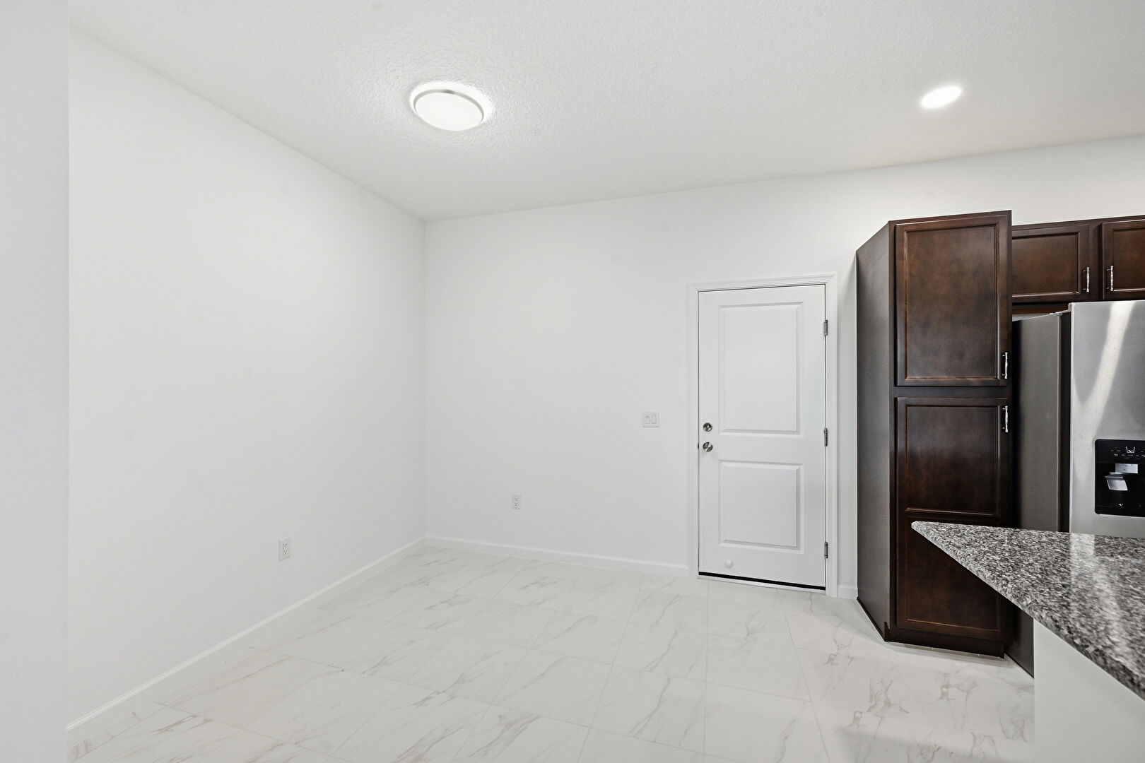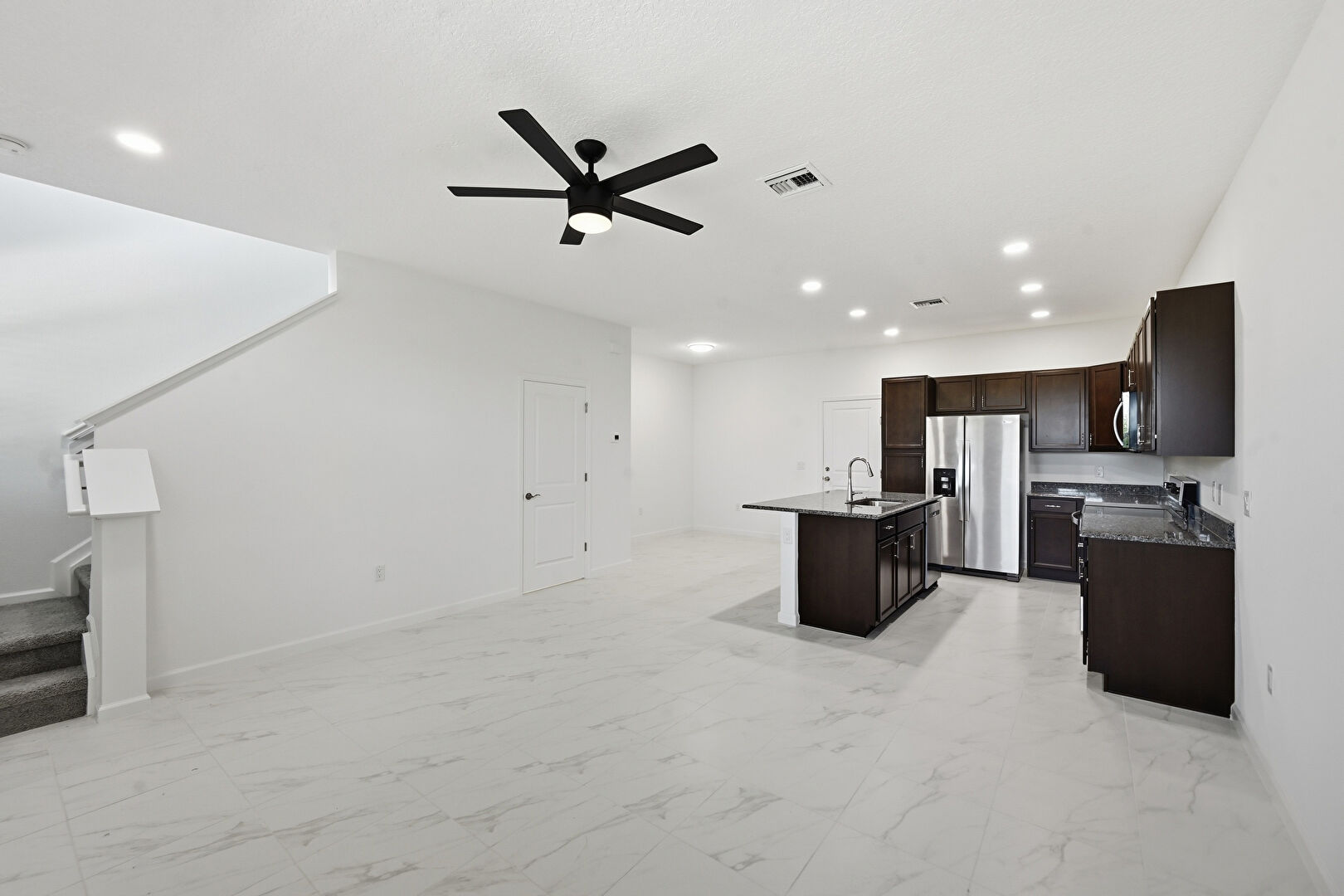 Baseboards Wall, Ceiling Fan, Dark Brown Cabinets, Drywall, Kitchen Bar, Kitchen Island, L Shaped Kitchen, Marble Finish Floor, Natural Light, Opens To Living Area, Recessed Lighting, Shaker Cabinets, Stairs, Stone Countertops, Textured Ceiling, Vent, Dark Brown Cabinets, Drywall, Recessed Lighting