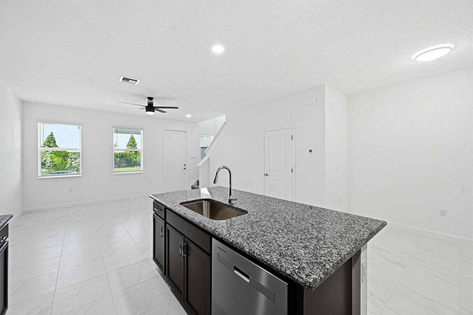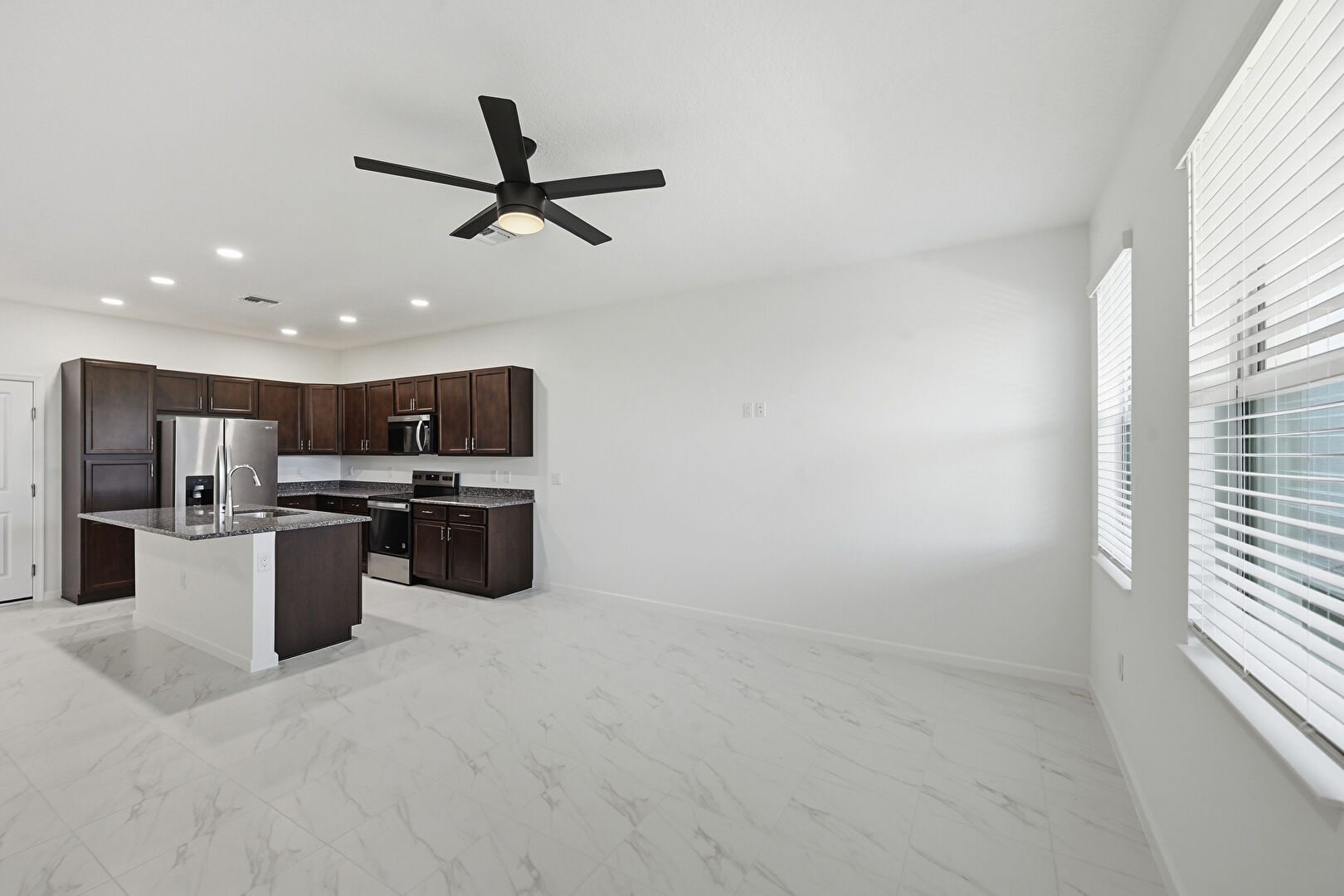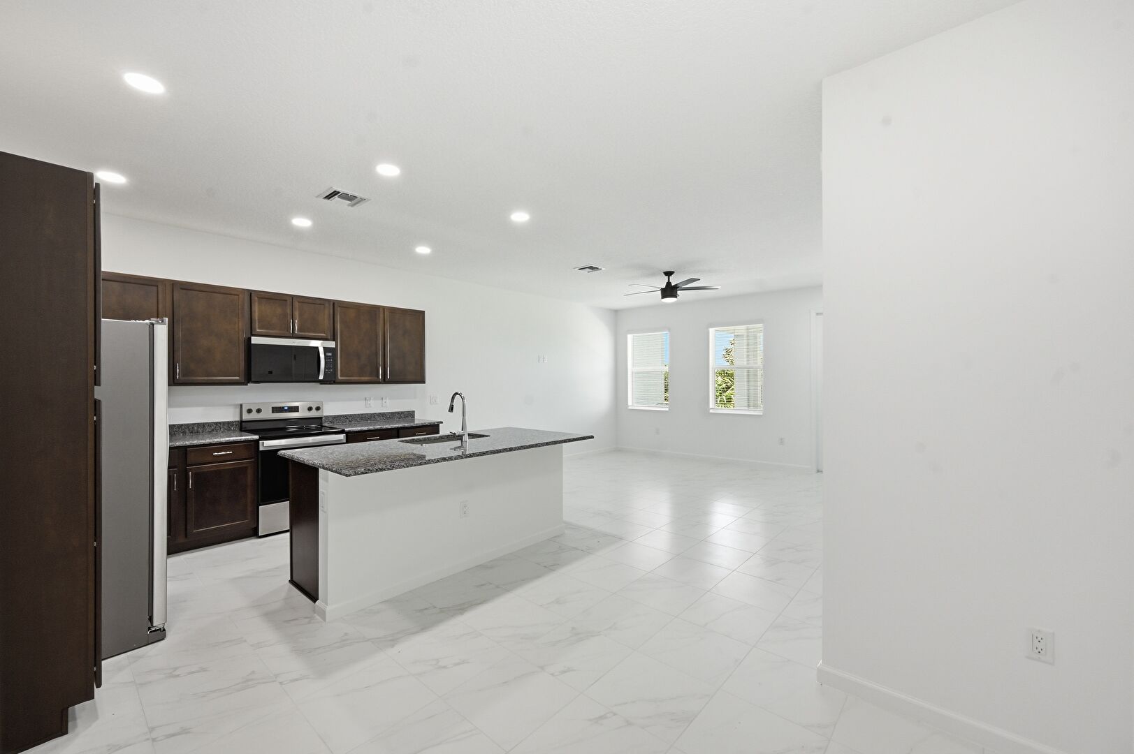 Baseboards Wall, Black Cabinets, Dark Brown Cabinets, Drywall, Kitchen Island, L Shaped Kitchen, Marble Finish Floor, Natural Light, Opens To Living Area, Recessed Lighting, Shaker Cabinets, Stone Countertops, Vent, Ceiling Fan, Dark Brown Cabinets, L Shaped Kitchen, Stone Countertops