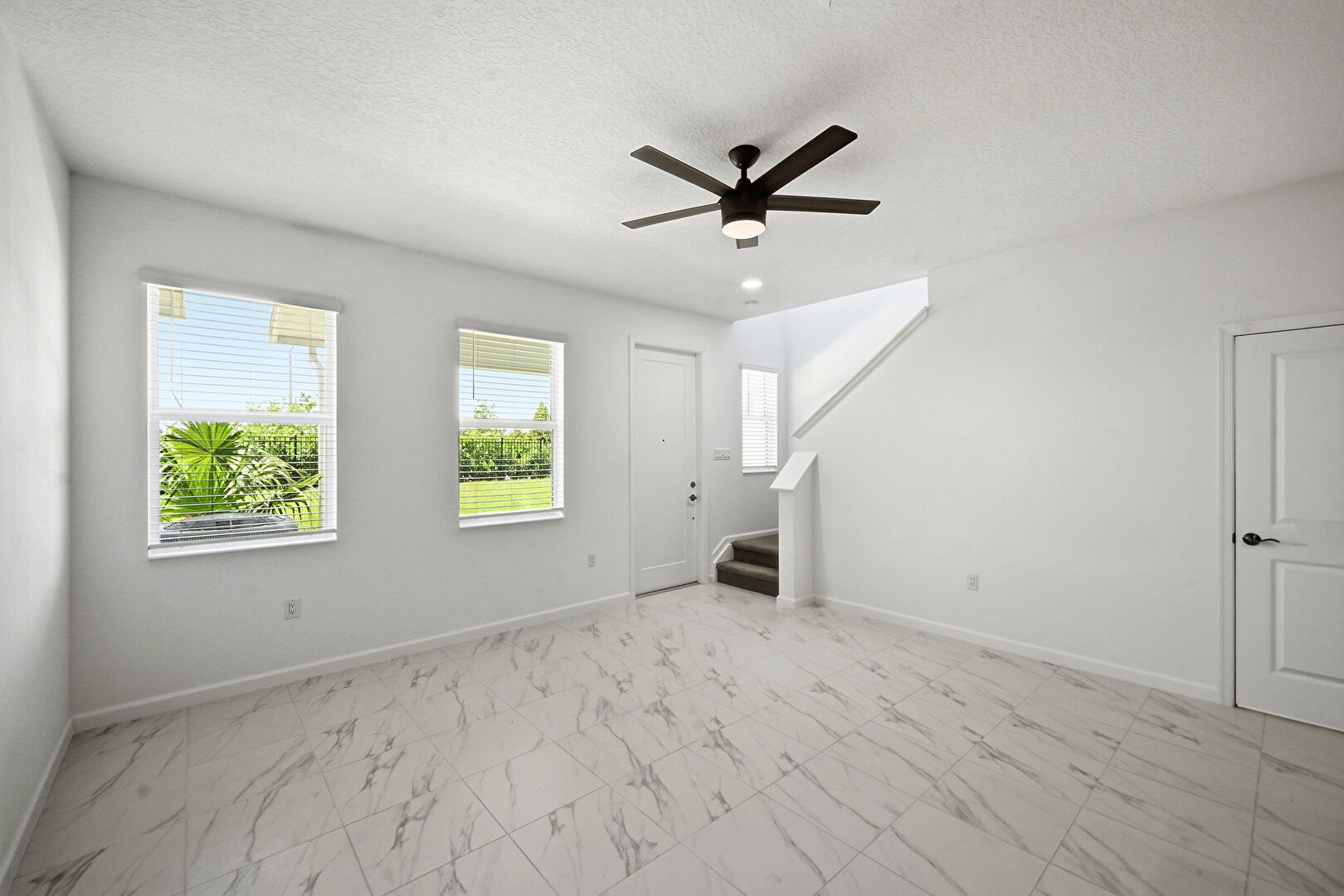 Ceiling Fan, Downspout, Gutters, Horizontal Siding, Lawn, Porch, Shingle Roof, Stucco Siding, Vertical Siding, Ceiling Fan, Gutters, Vertical Siding