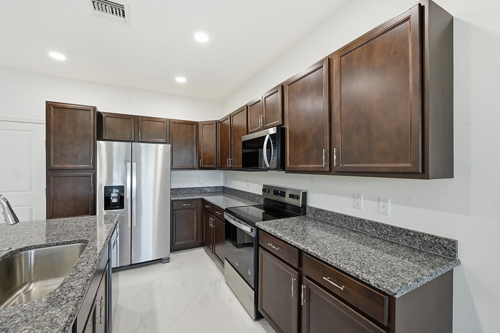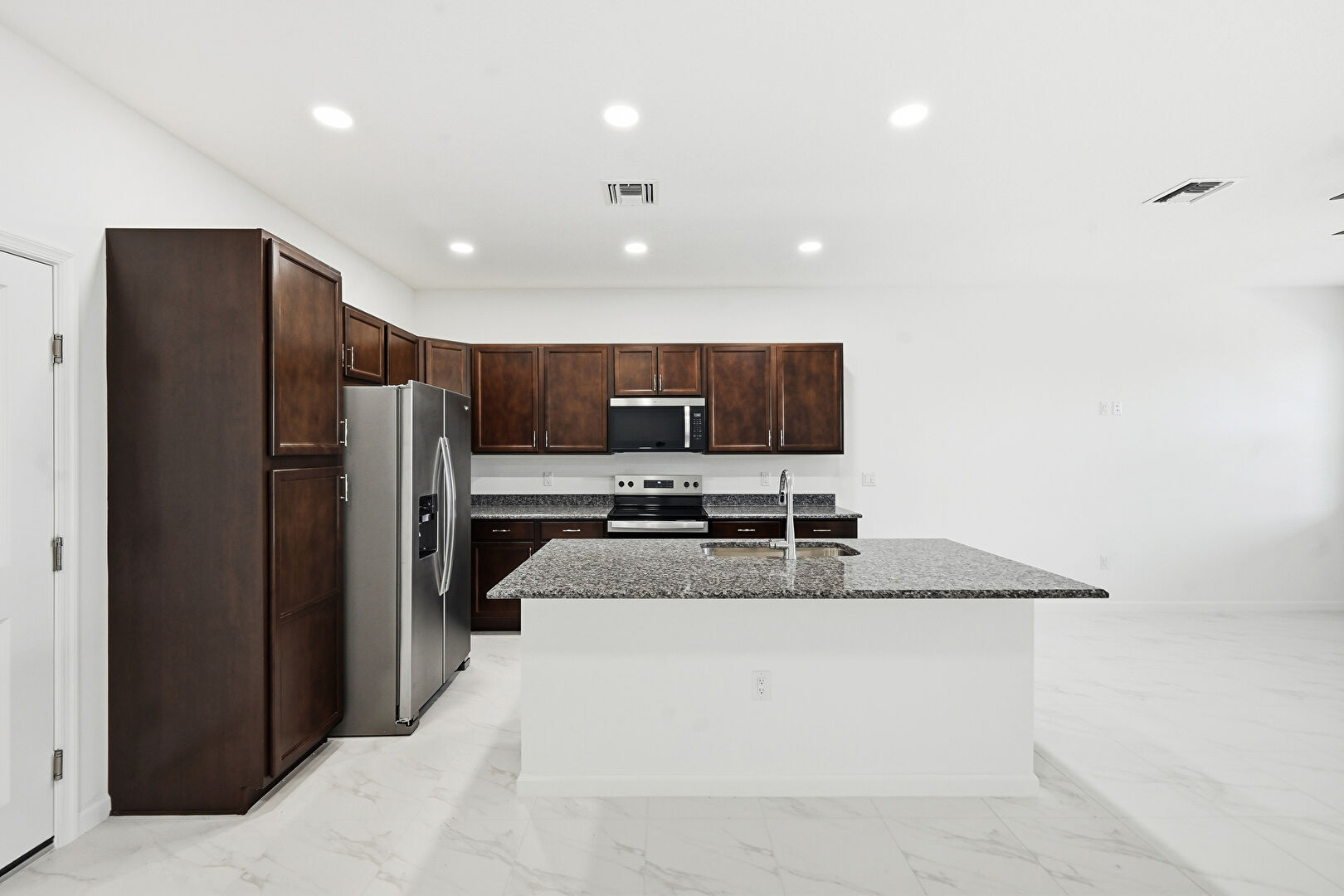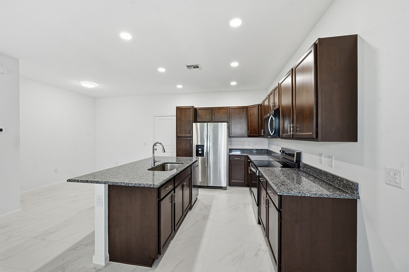 Baseboards Wall, Ceiling Fan, Dark Brown Cabinets, Drywall, Kitchen Island, L Shaped Kitchen, Marble Finish Floor, Natural Light, Opens To Living Area, Recessed Lighting, Shaker Cabinets, Stone Countertops, Vent, Recessed Lighting, Stone Countertops