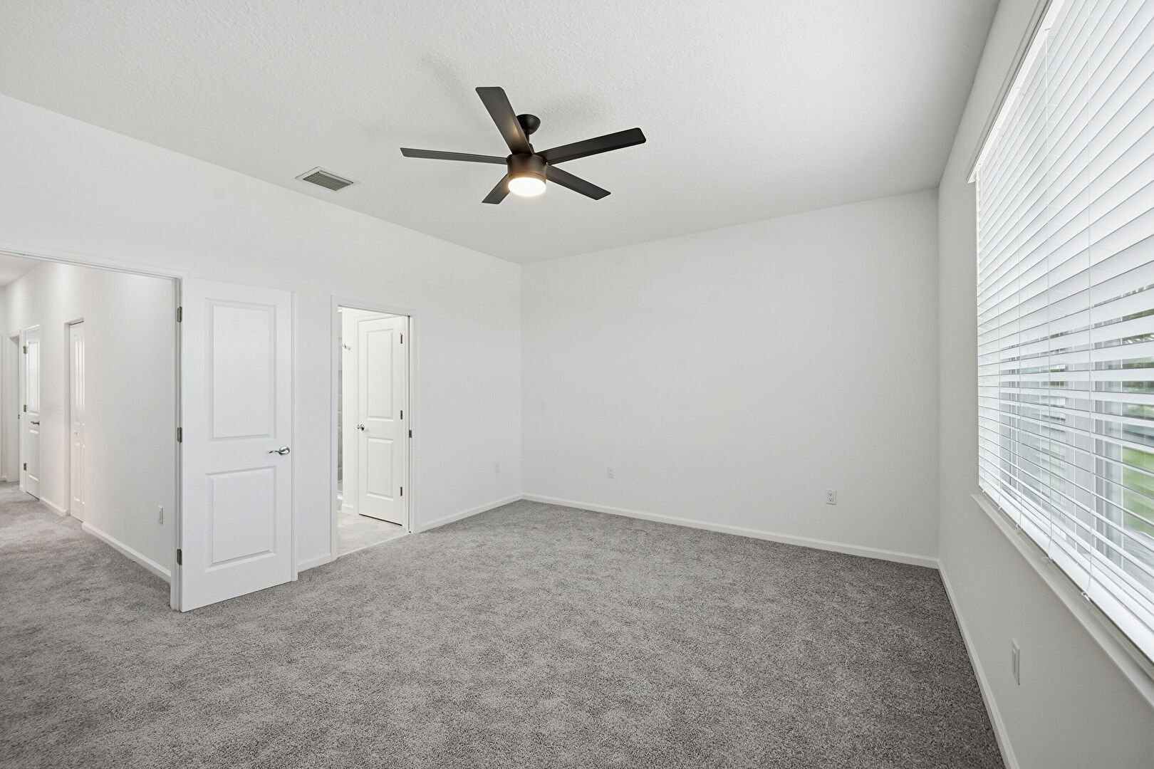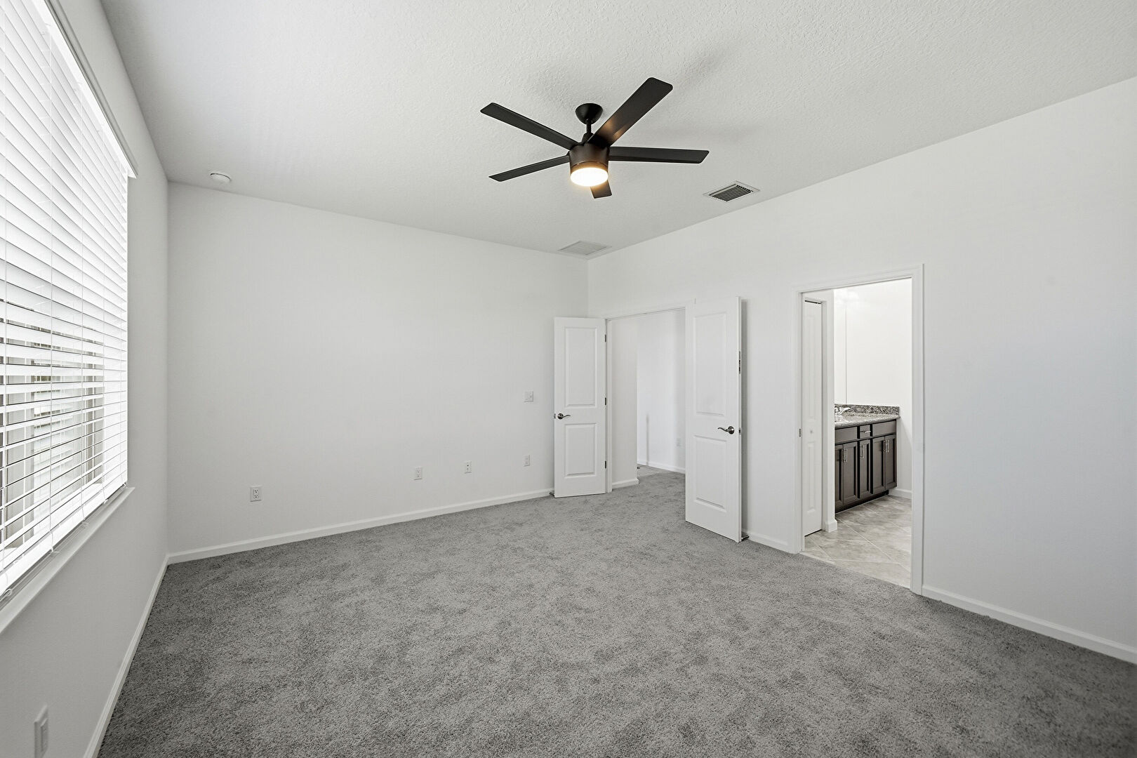 Baseboards Wall, Carpet, Ceiling Fan, Drywall, Ensuite Bathroom, Natural Light, Textured Ceiling, Vent, Ceiling Fan, Drywall, Vent