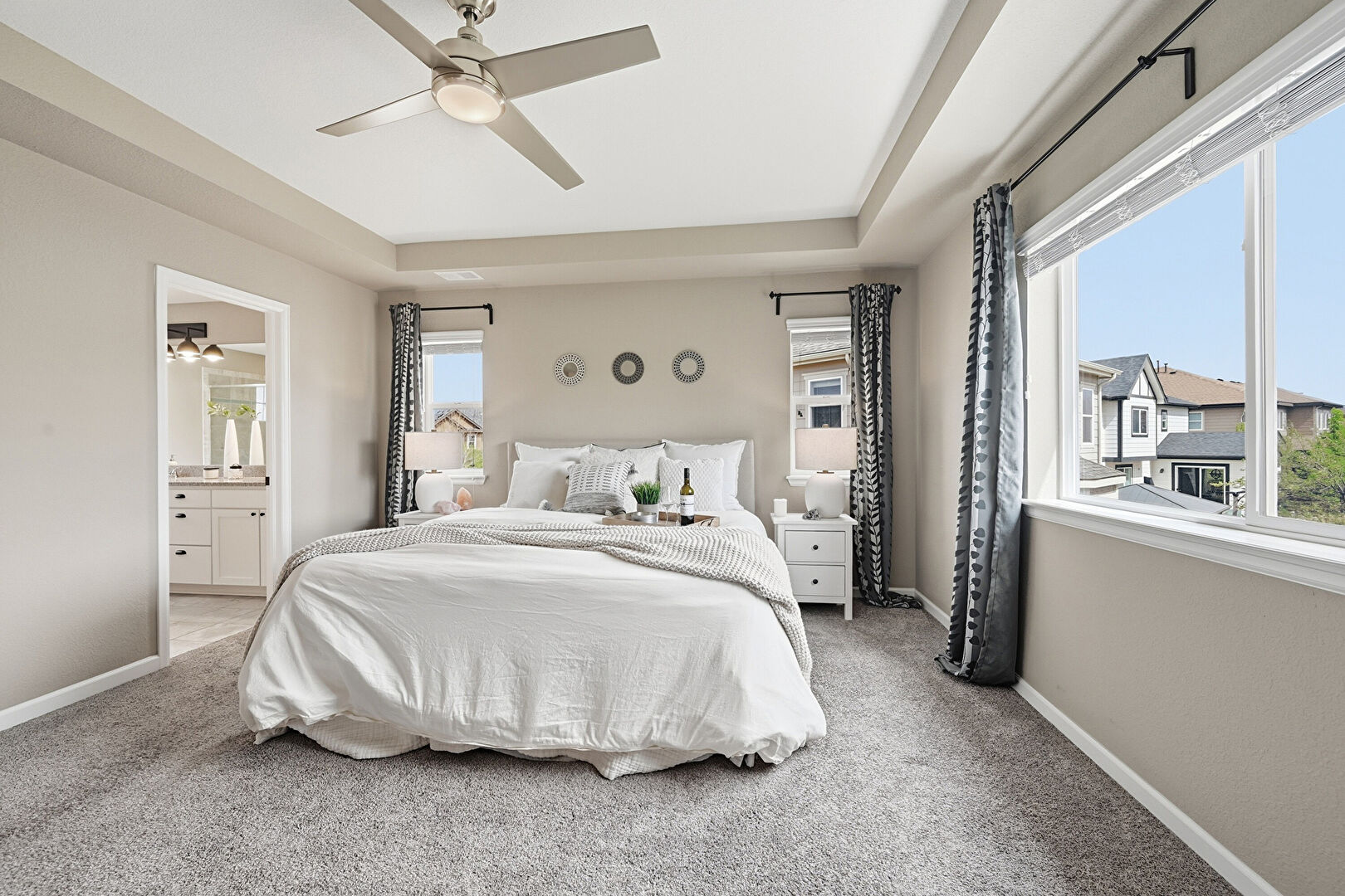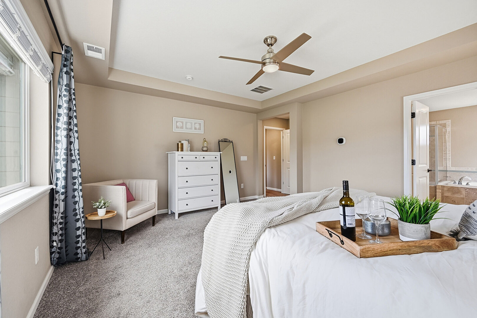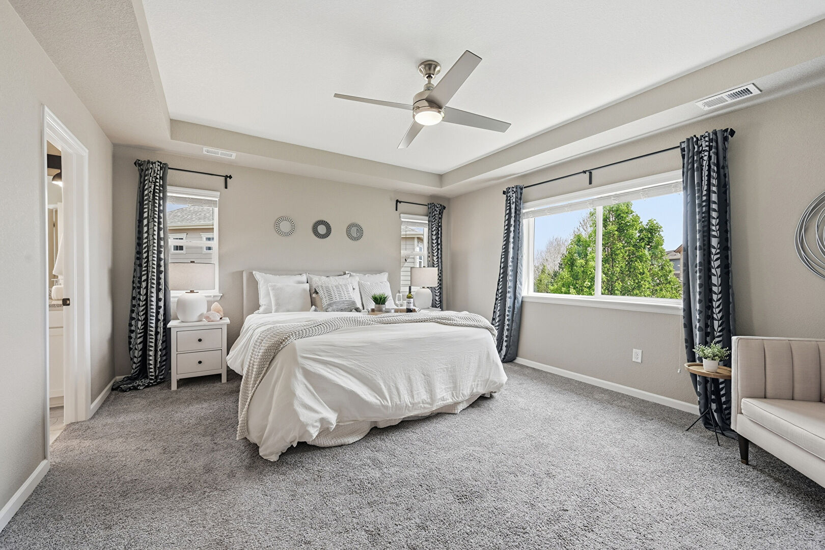 Baseboards Wall, Carpet, Ceiling Fan, Drywall, Ensuite Bathroom, Natural Light, Tray Ceiling, Vent, Carpet, Ceiling Fan, Ensuite Bathroom