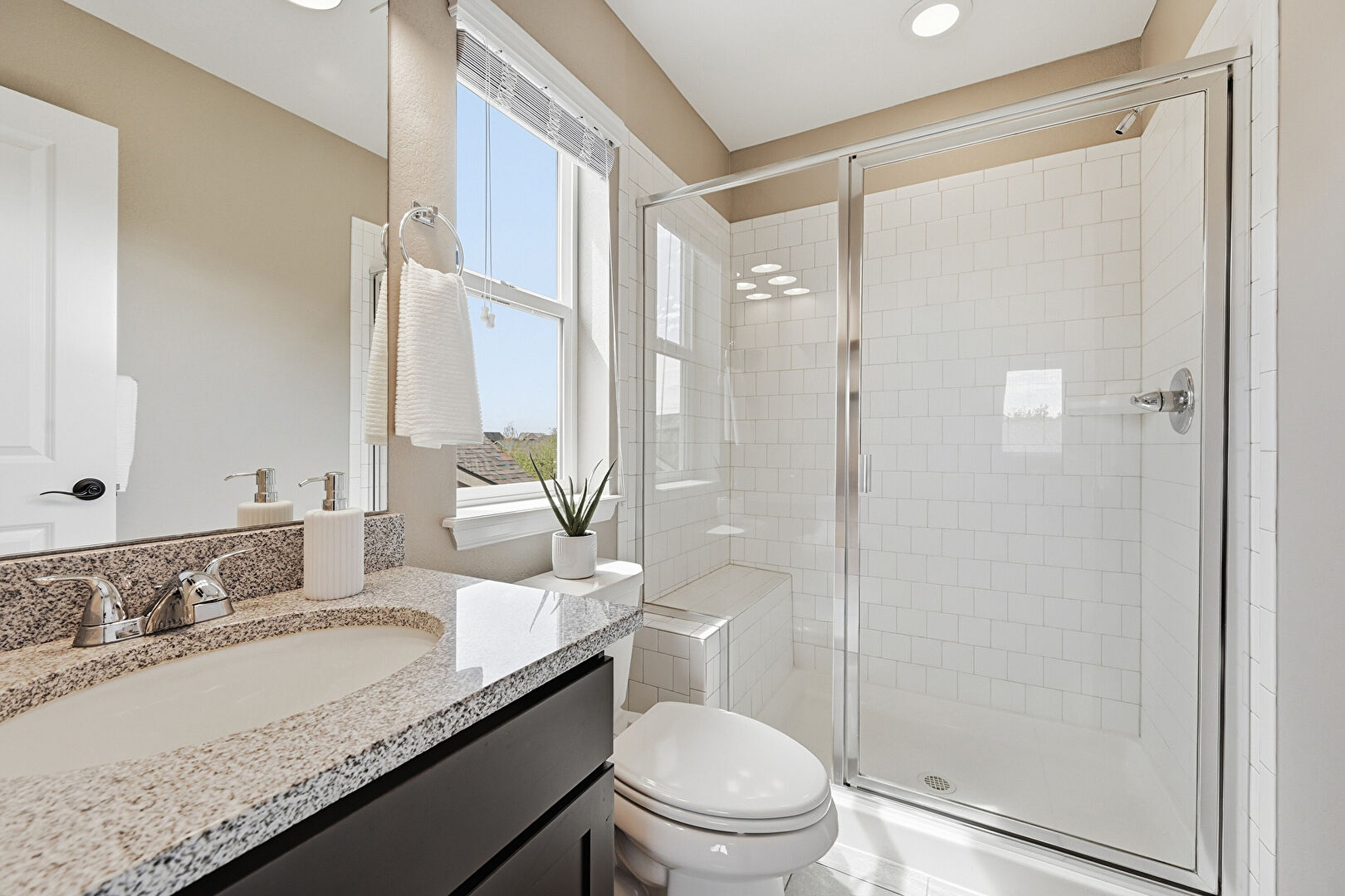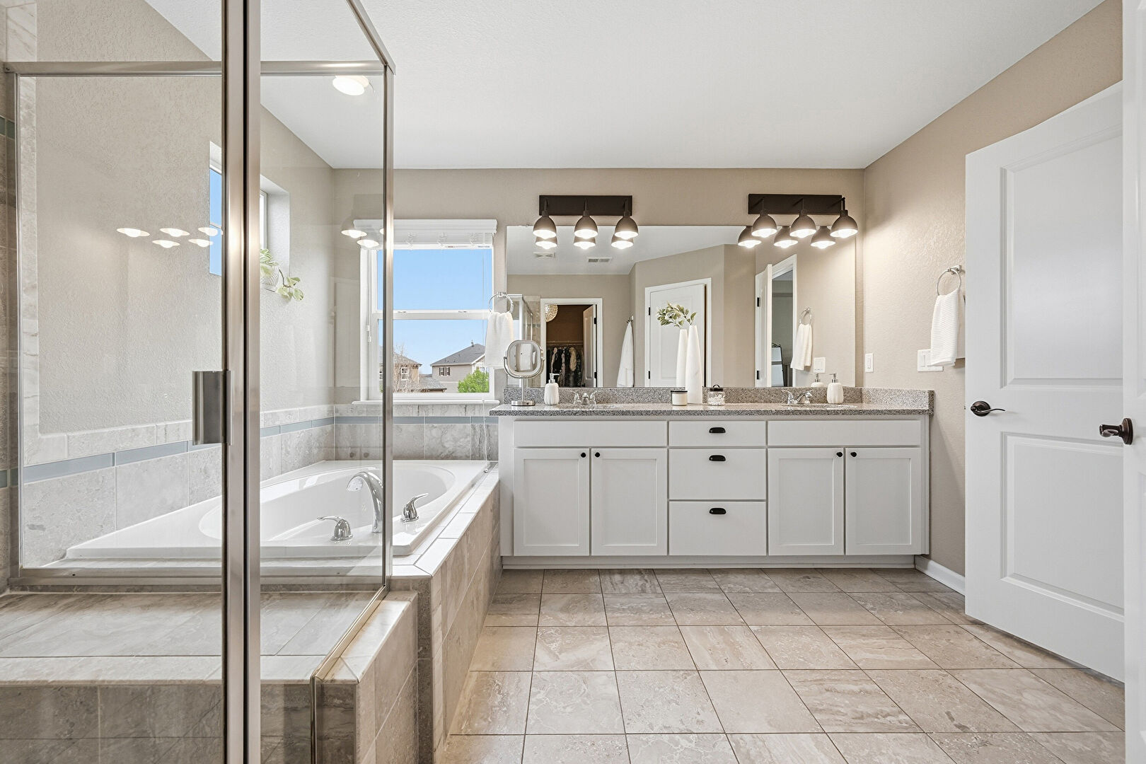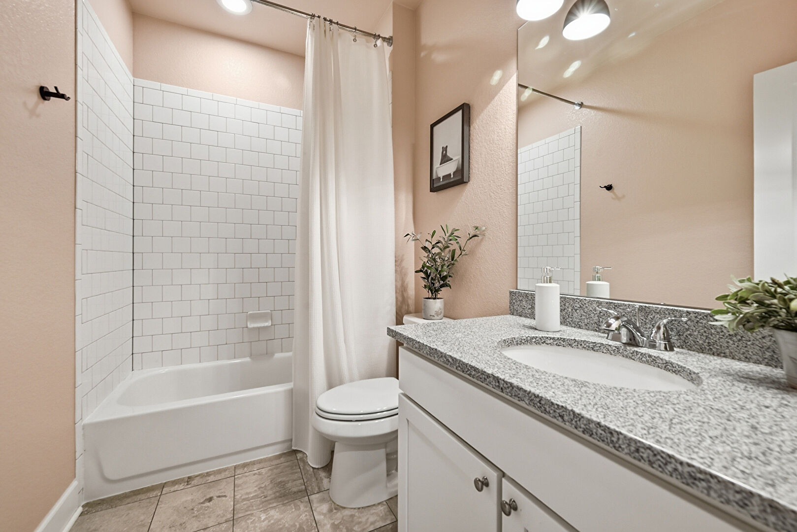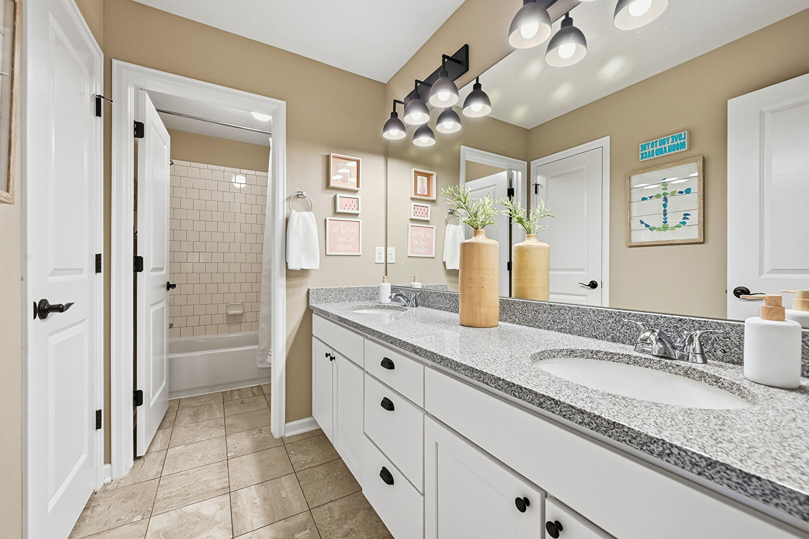 Baseboards Wall, Combined Bath Shower, Double Vanity, Drywall, Full Bathroom, Recessed Lighting, Textured Wall, Tile Floor, Vanity, Combined Bath Shower, Natural Light, Recessed Lighting, Vanity