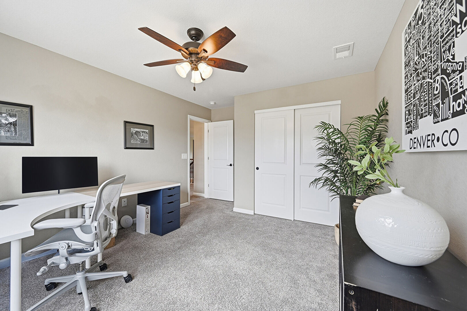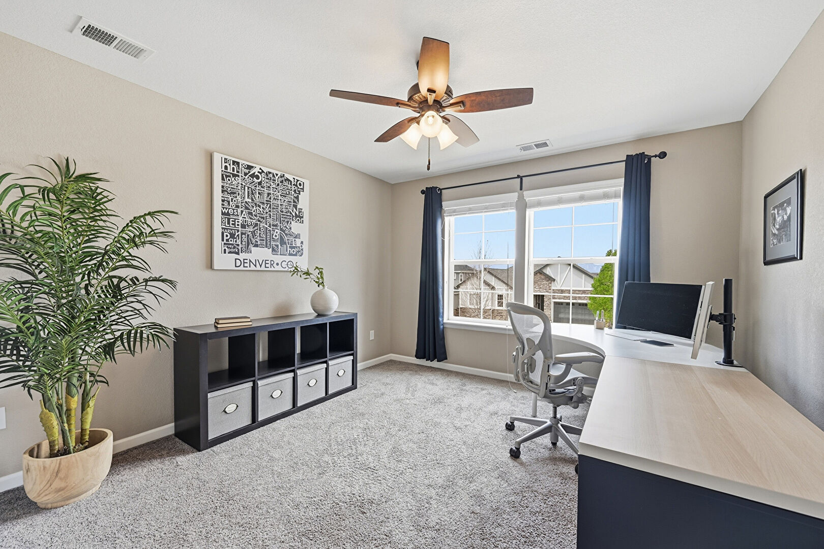 Baseboards Wall, Carpet, Ceiling Fan, Drywall, Natural Light, Office Area, Vent, Ceiling Fan, Vent