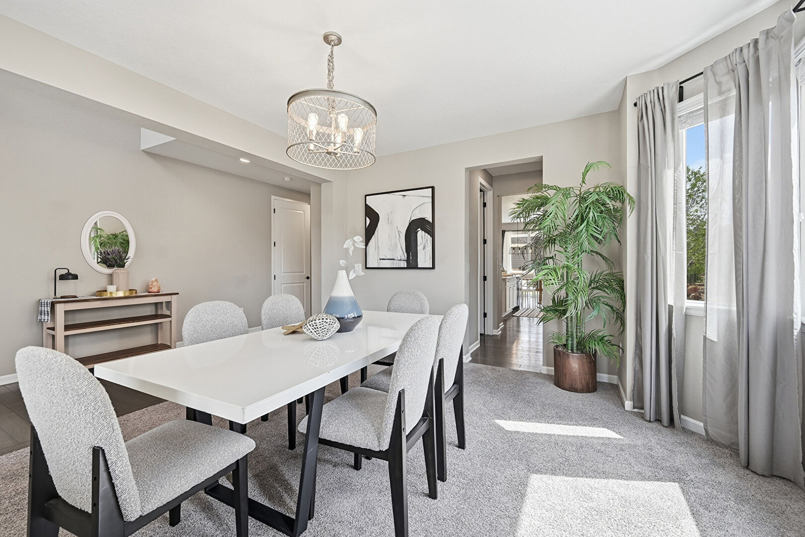 Baseboards Wall, Carpet, Drywall, Natural Light, Notable Chandelier
