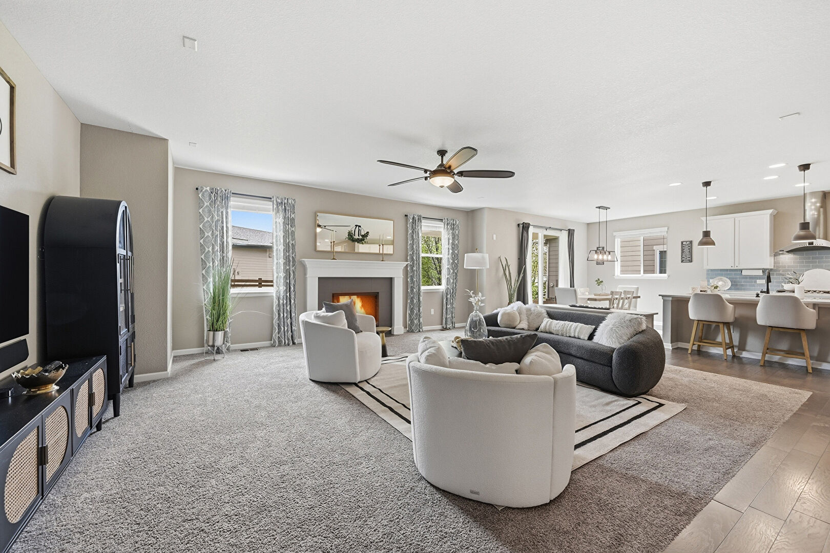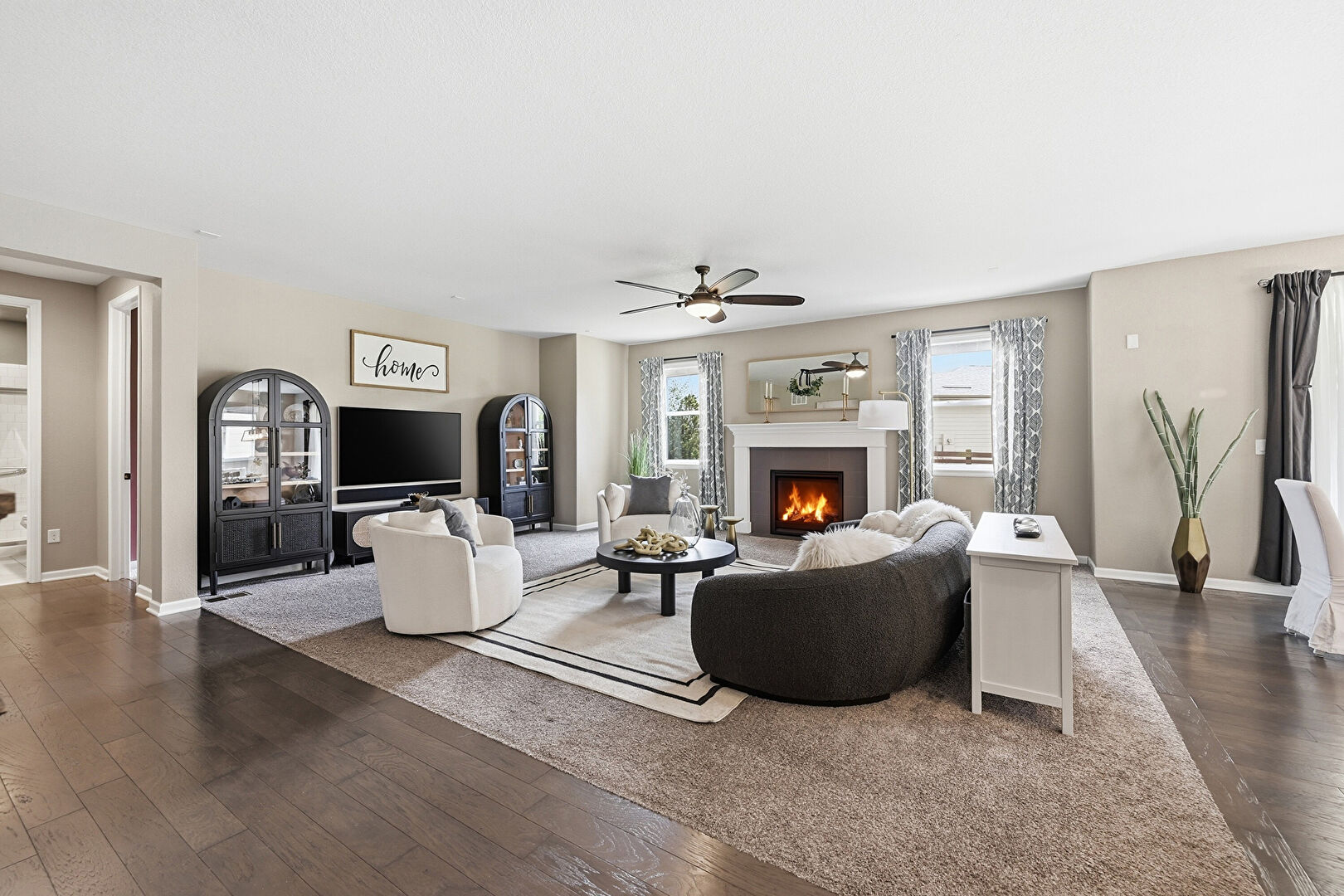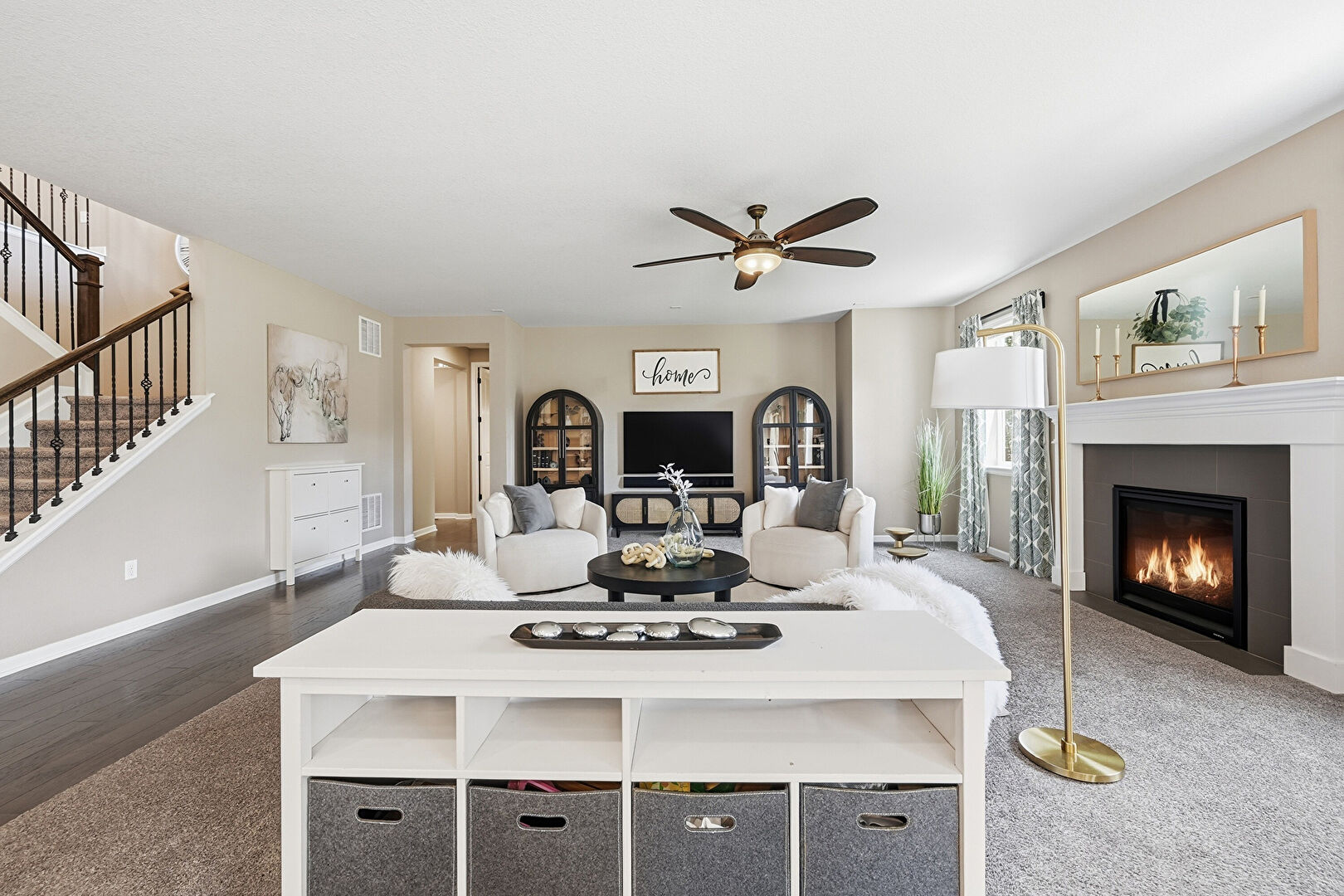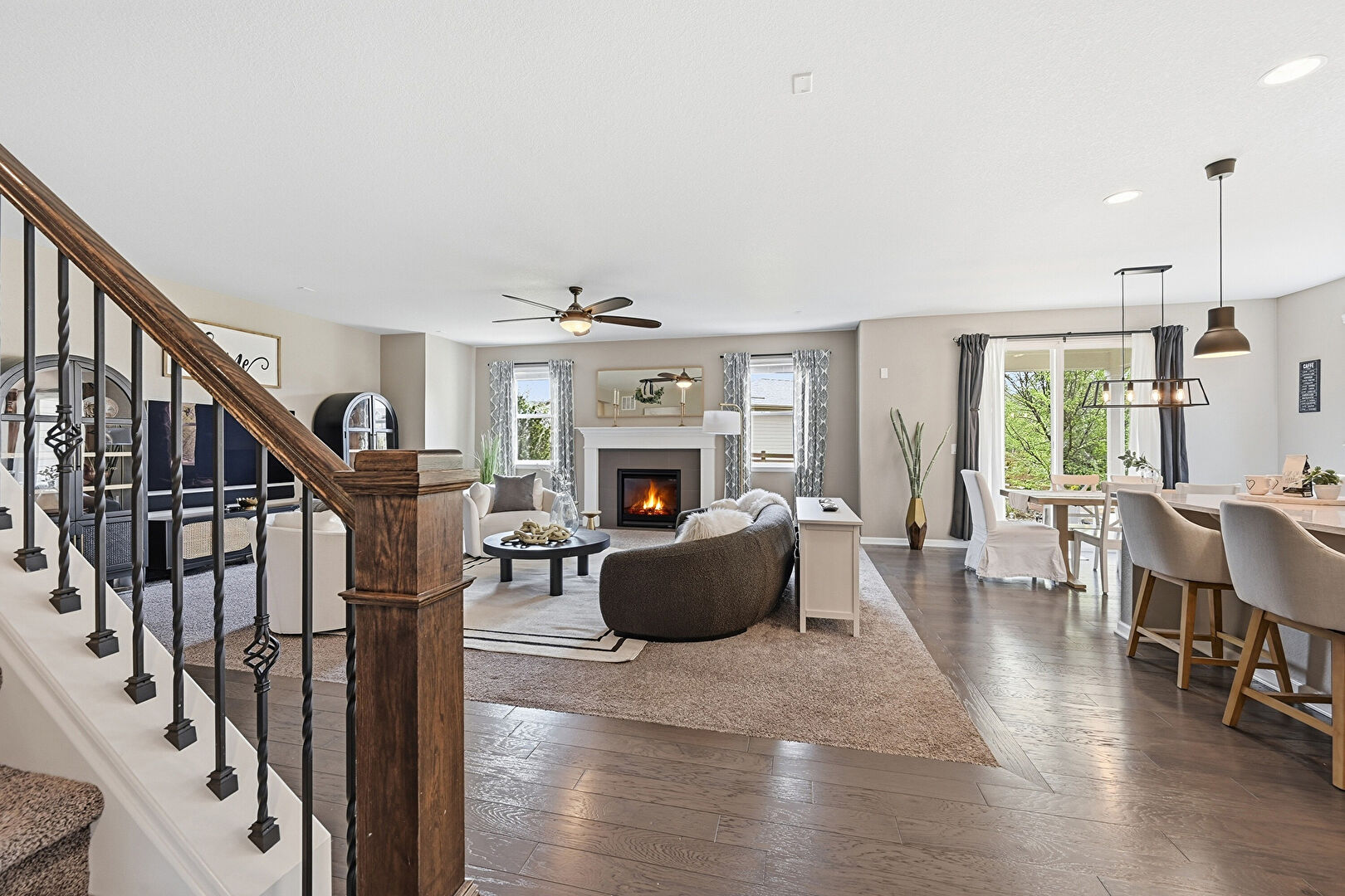Arched Walkways, Baseboards Wall, Carpet, Ceiling Fan, Double Oven, Drywall, Fireplace, Natural Light, Notable Chandelier, Recessed Lighting, Stairs, Vent, Wood Finish Floor, Baseboards Wall, Drywall, Fireplace, Recessed Lighting