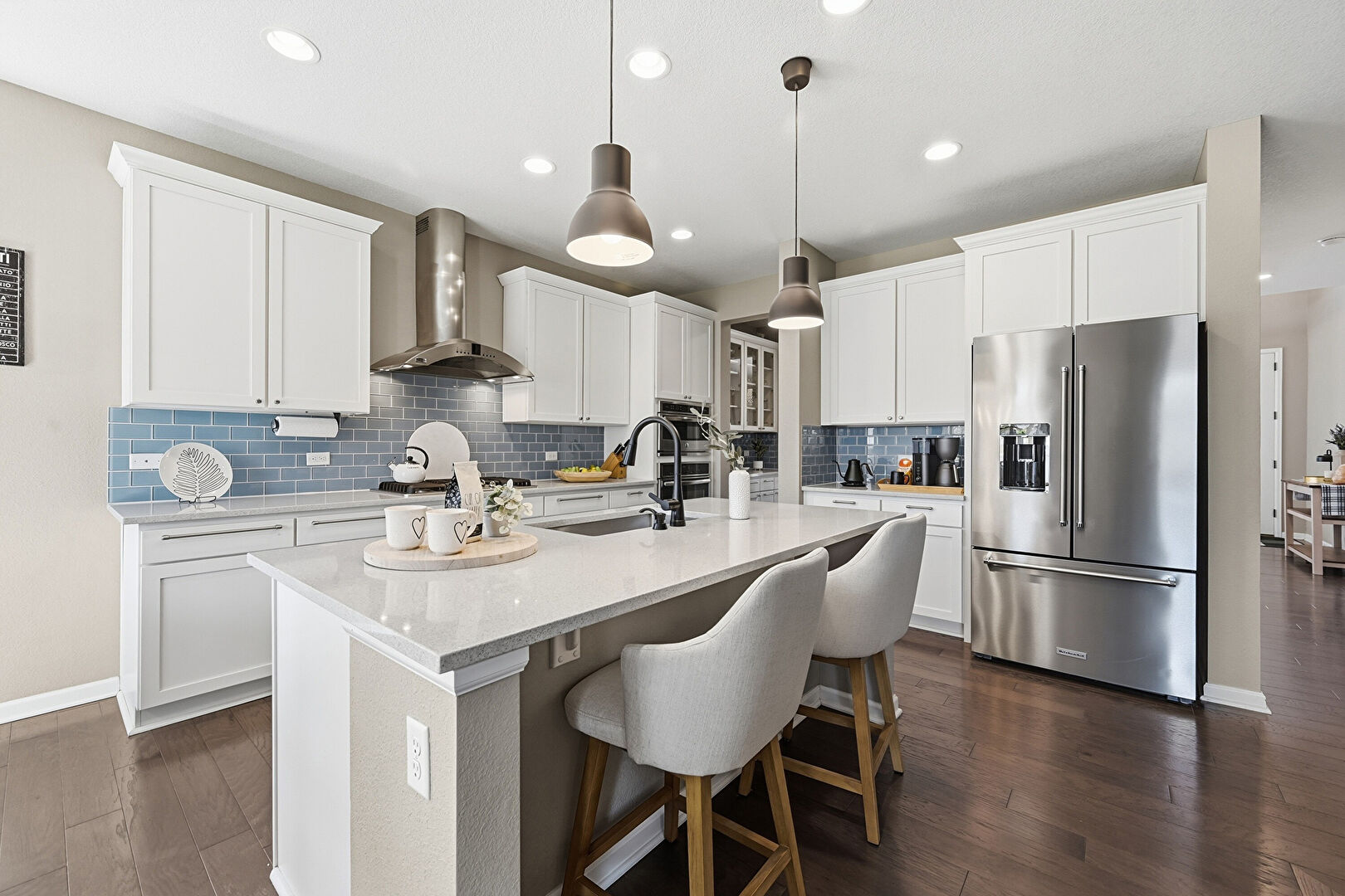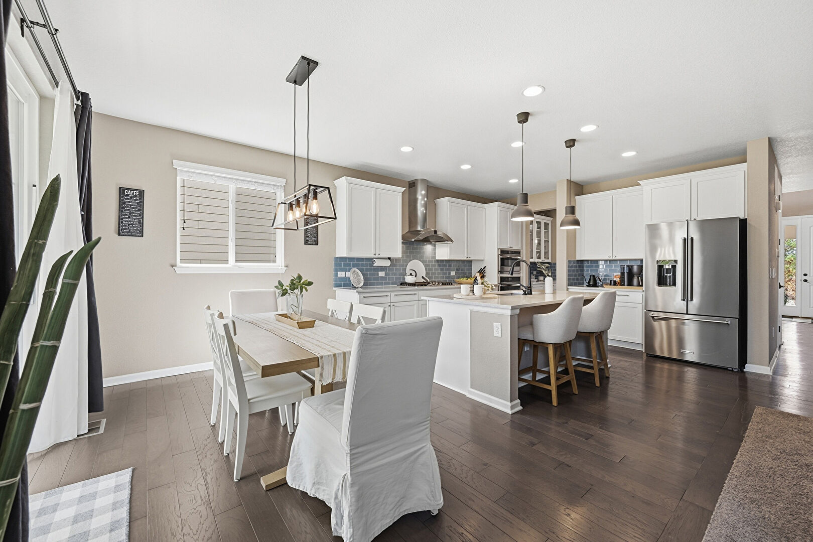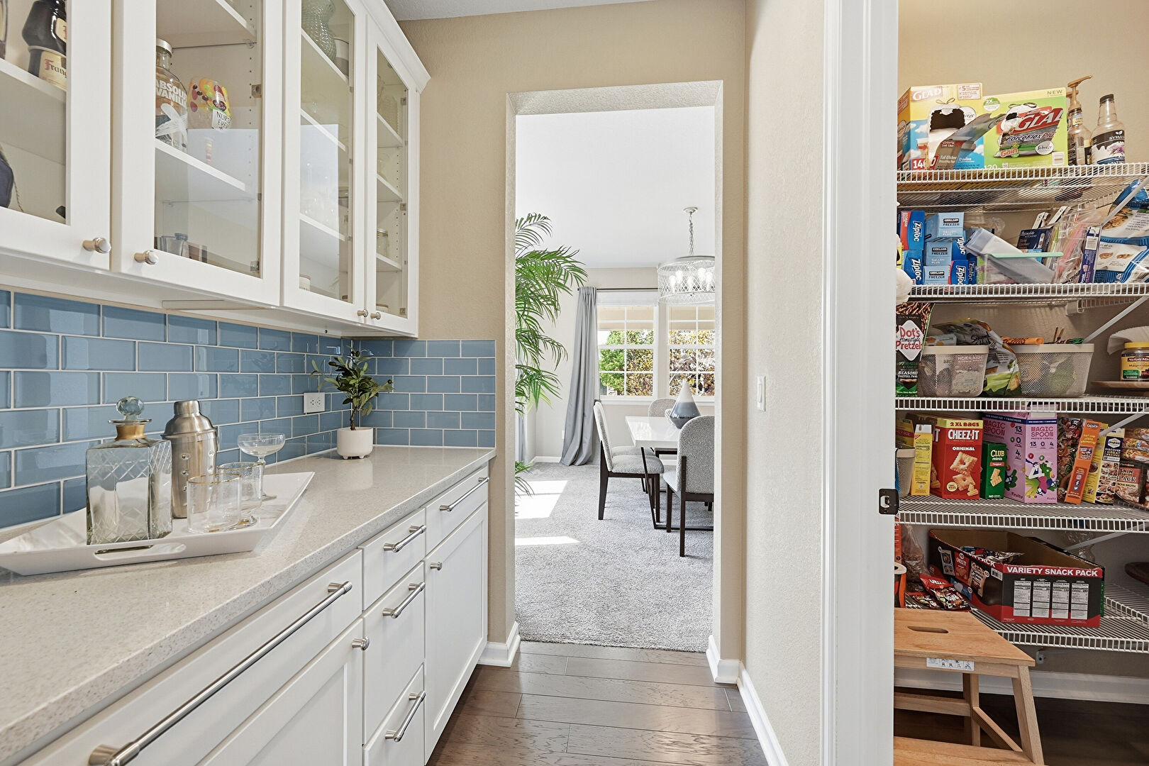 Baseboards Wall, Crown Molding Cabinets, Double Oven, Drywall, Glass Insert Cabinets, Natural Light, Notable Chandelier, Pendant Lighting, Recessed Lighting, Shaker Cabinets, Stone Countertops, Wood Finish Floor, Crown Molding Cabinets, Drywall