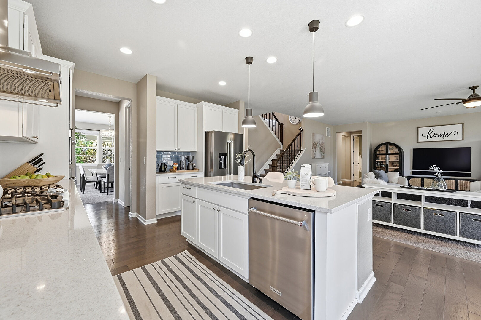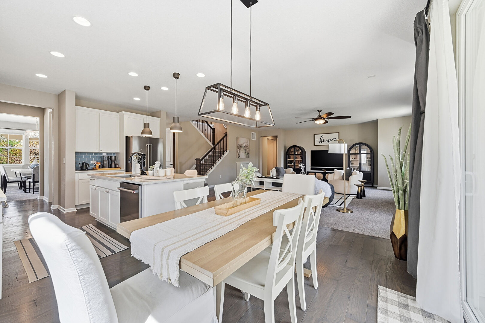 Baseboards Wall, Drywall, L Shaped Kitchen, Natural Light, Recessed Lighting, Stairs, Wood Finish Floor, Ceiling Fan, Wood Finish Floor