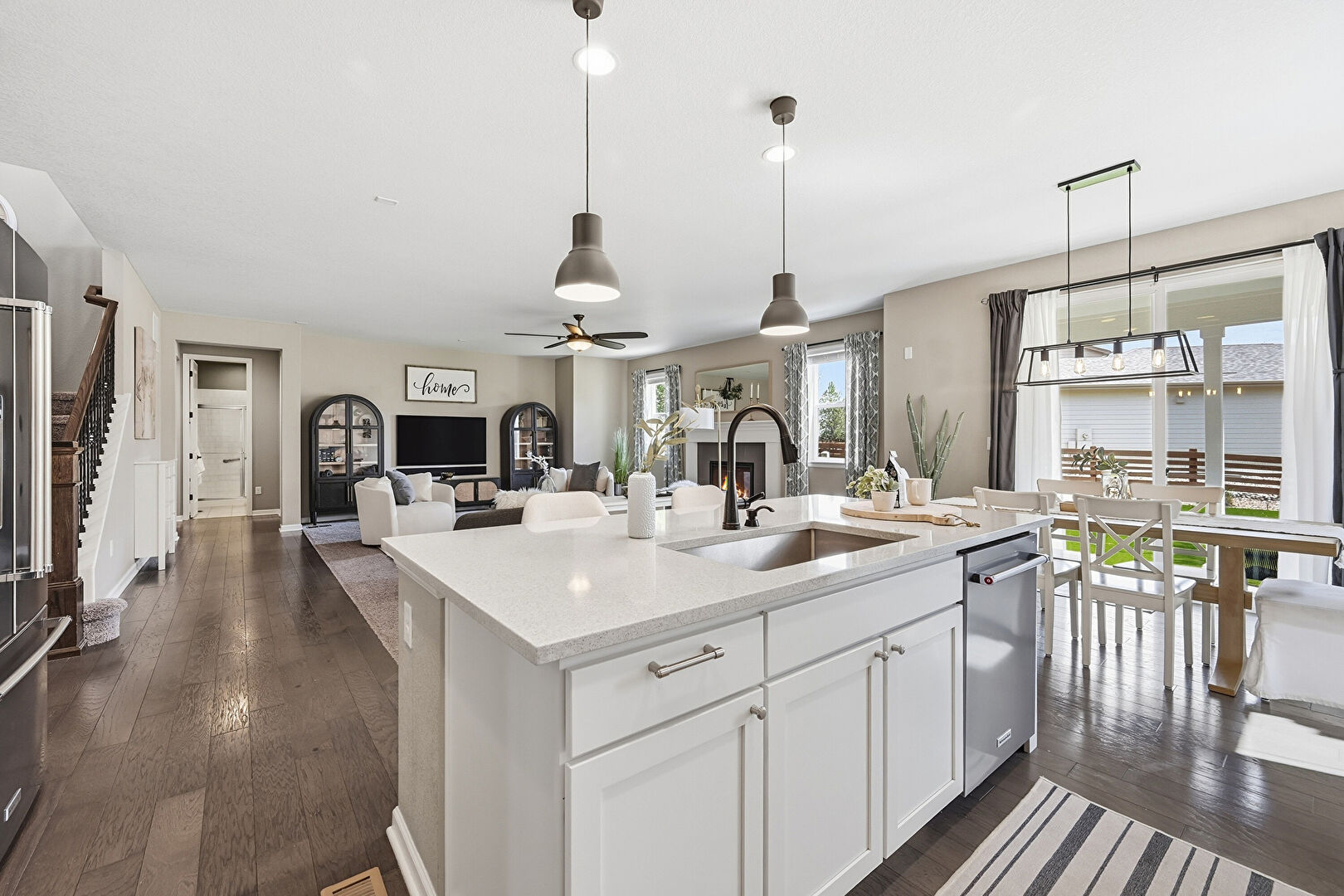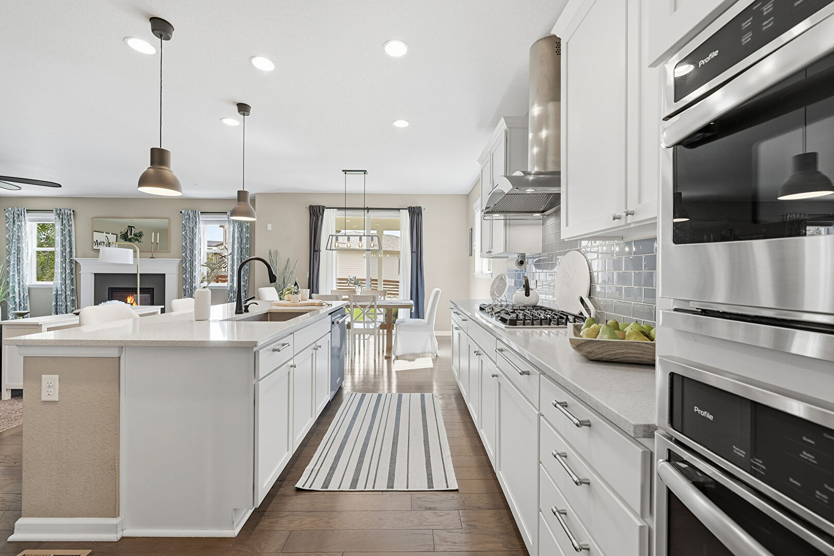Baseboards Wall, Ceiling Fan, Crown Molding Cabinets, Double Oven, Drywall, Fireplace, Kitchen Bar, Kitchen Island, L Shaped Kitchen, Natural Light, Notable Chandelier, Opens To Living Area, Pendant Lighting, Recessed Lighting, Shaker Cabinets, Stone Countertops, Vent, Wood Finish Floor, Double Oven, Drywall, Kitchen Bar, Opens To Living Area, Recessed Lighting, Stone Countertops