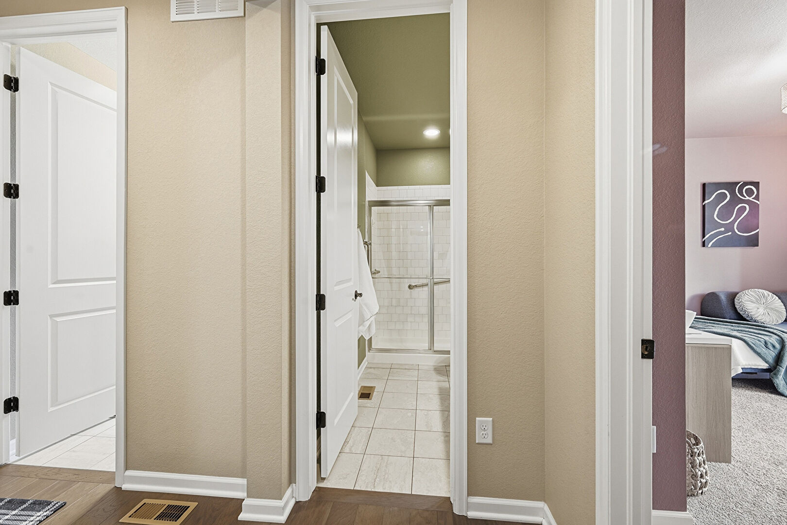 Baseboards Wall, Ensuite Bathroom, Full Bathroom, Tile Floor, Vent, Wood Finish Floor, Drywall
