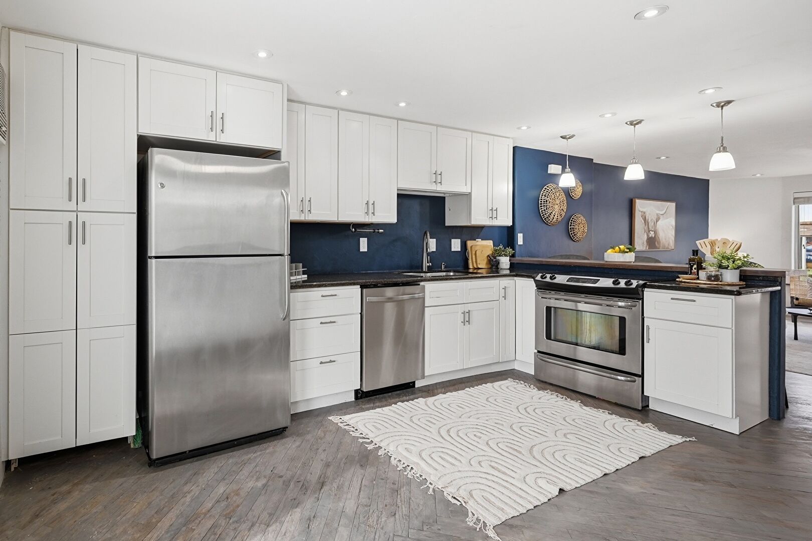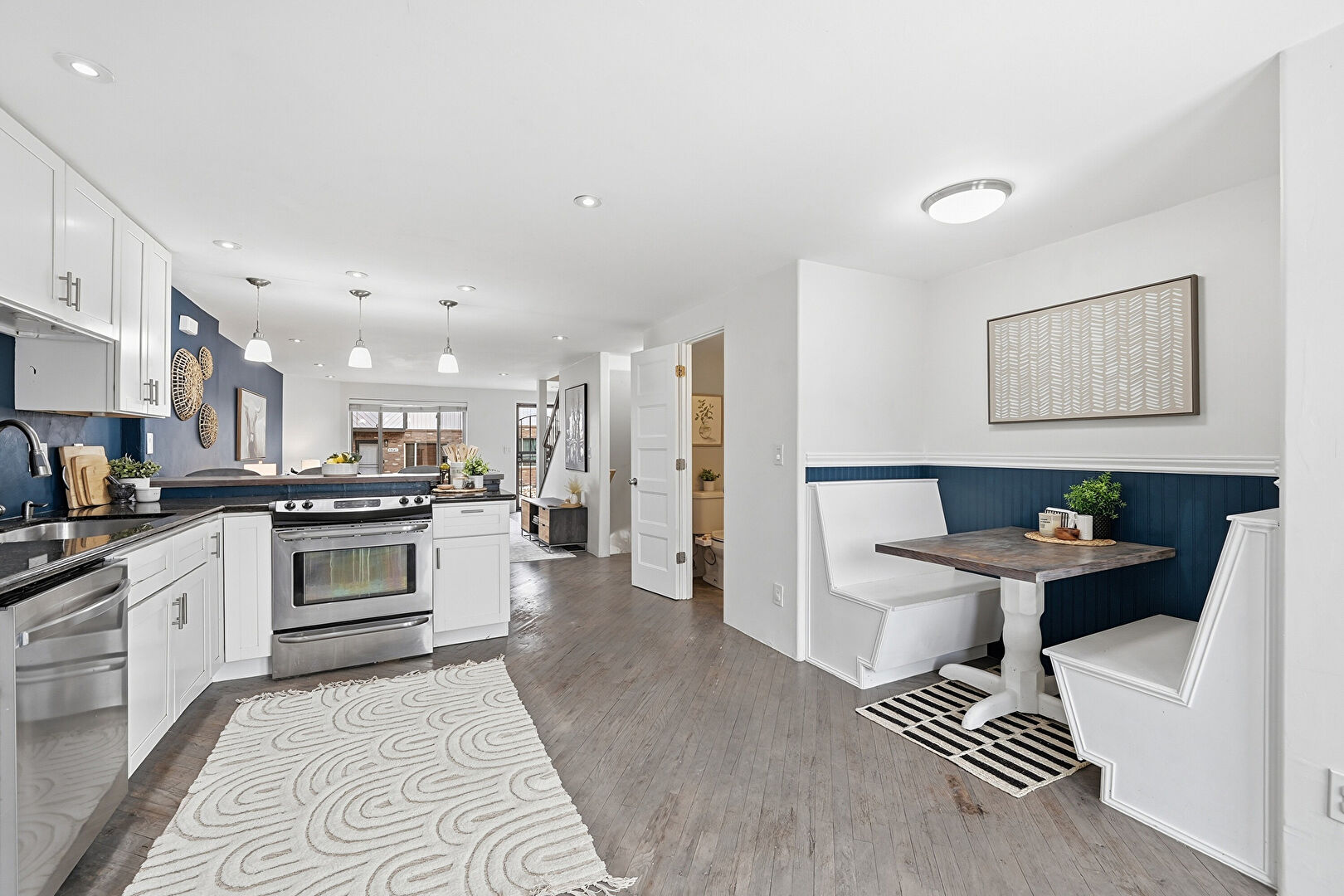 Breakfast Nook, Drywall, Kitchen Peninsula, Natural Light, Opens To Living Area, Pendant Lighting, Recessed Lighting, Shaker Cabinets, Stone Countertops, Wainscot Wall, Wood Finish Floor, Baseboards Wall, Kitchen Peninsula