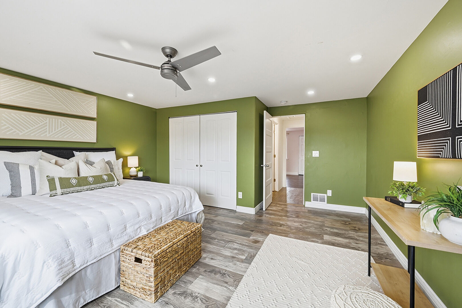 Baseboards Wall, Closet, Drywall, Recessed Lighting, Vent, Wood Finish Floor, Ceiling Fan
