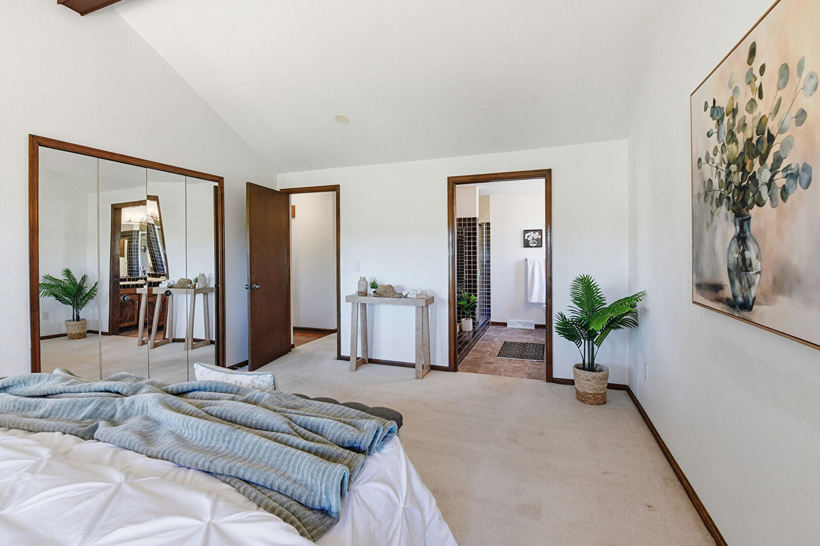 Baseboards Wall, Beamed Ceiling, Carpet, Cathedral Ceiling, Closet, Drywall, Ensuite Bathroom, High Ceiling, Natural Light, Two Closets, Vaulted Ceiling, Vent, Baseboards Wall, Vaulted Ceiling