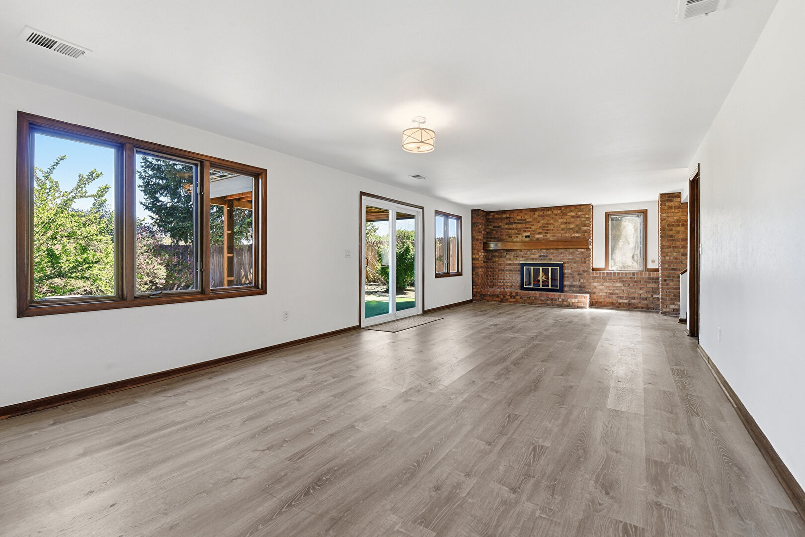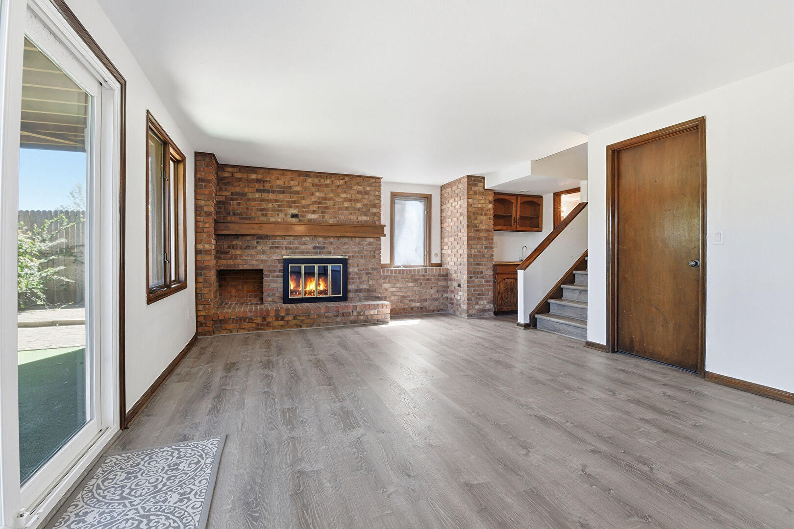 Baseboards Wall, Brick Wall, Drywall, Fireplace, Natural Light, Stairs, Vent, Wood Finish Floor, Drywall, Fireplace, Natural Light, Wood Finish Floor